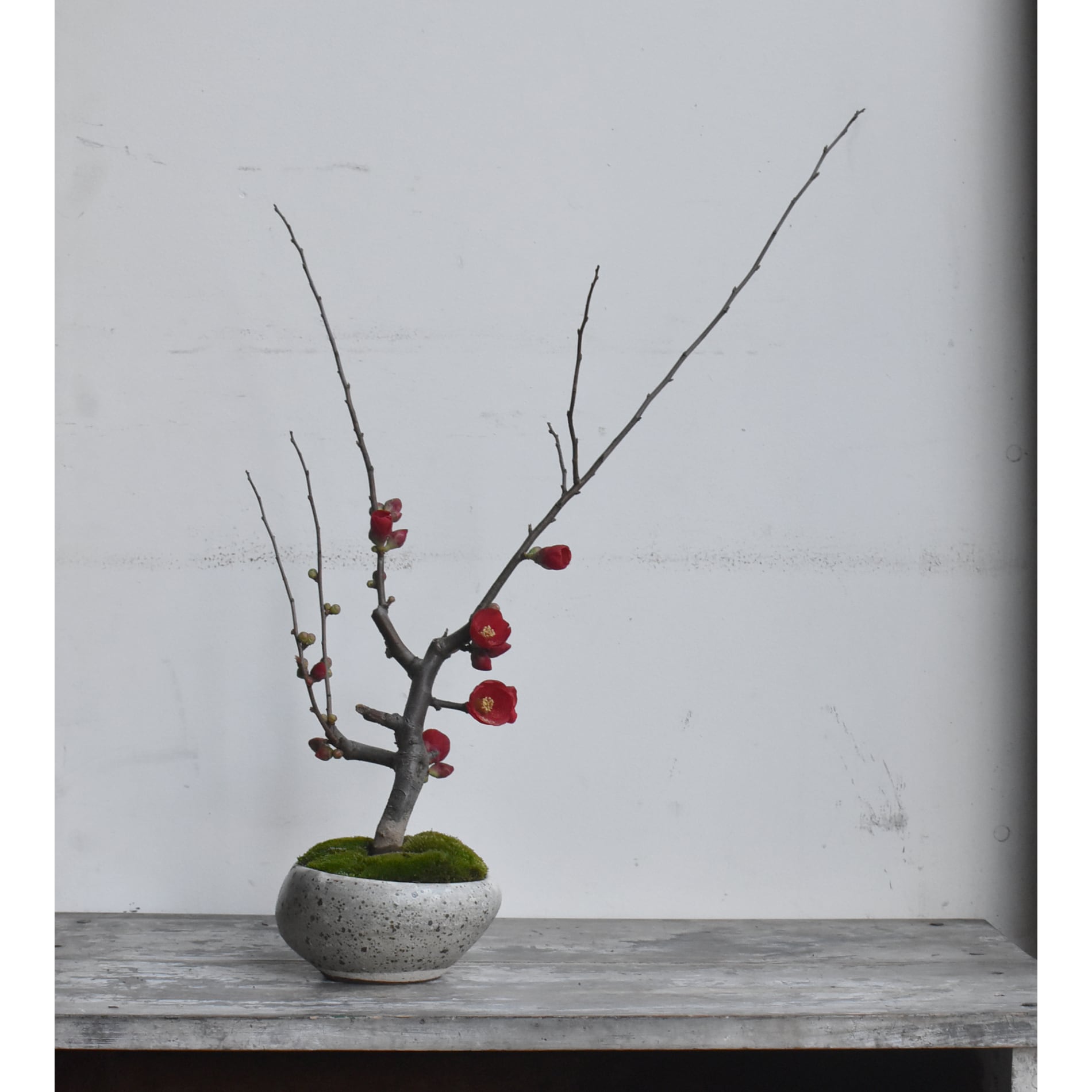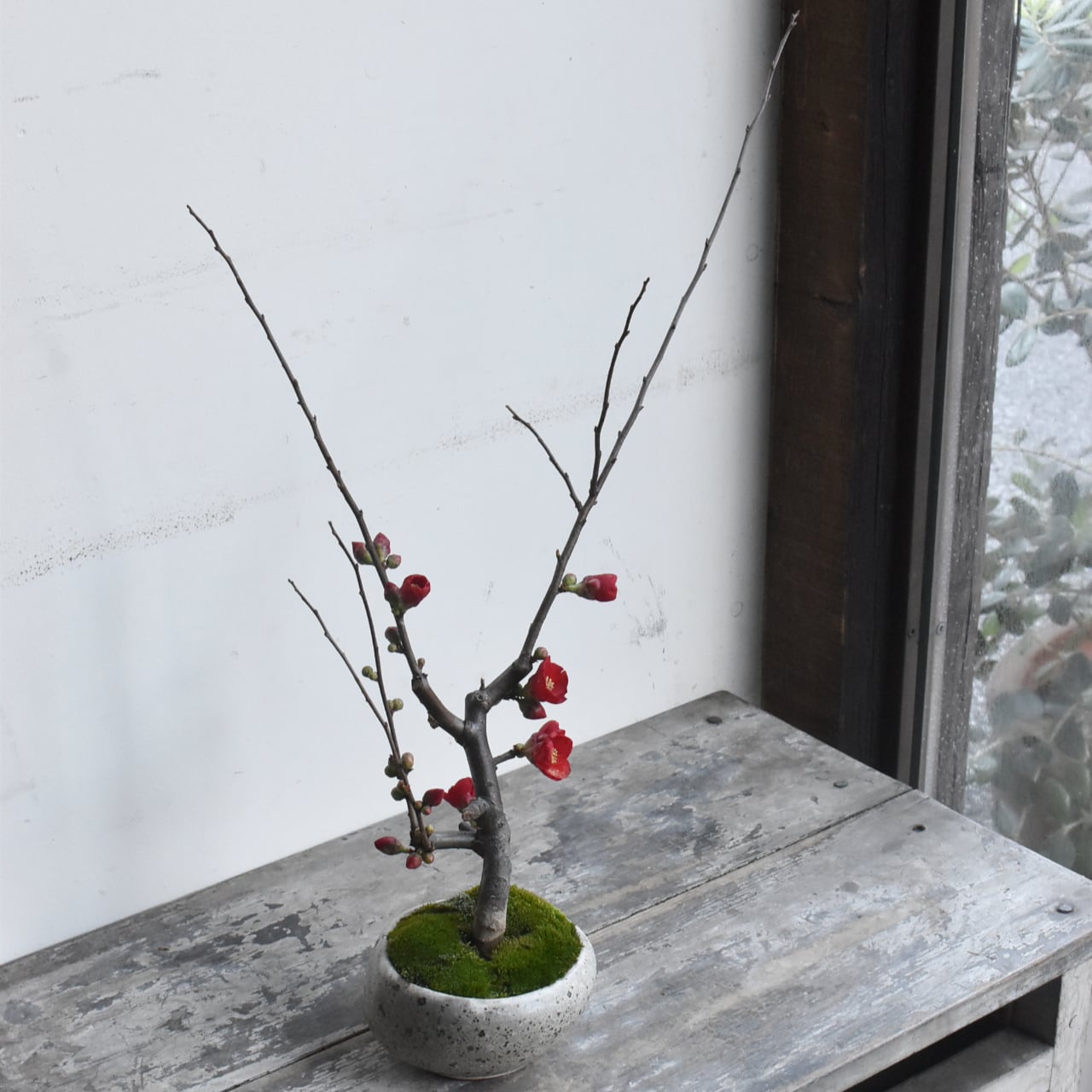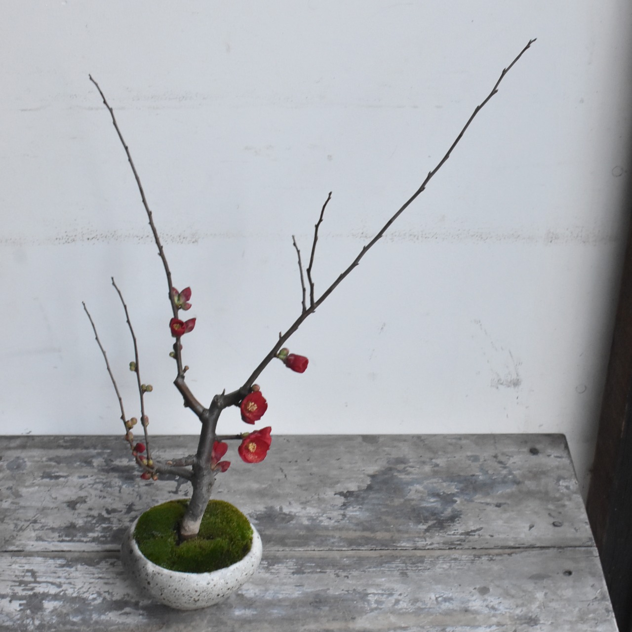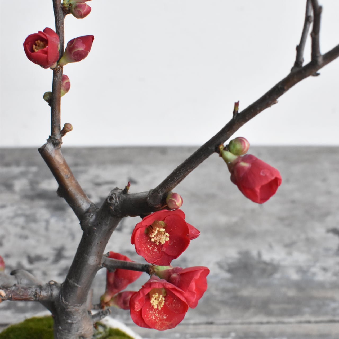 早咲きの一重緋赤の品種です。流通している多くの木瓜盆栽は枝を短く切り詰められていますが、この株は枝が伸びやかに立ち上がっています。
