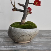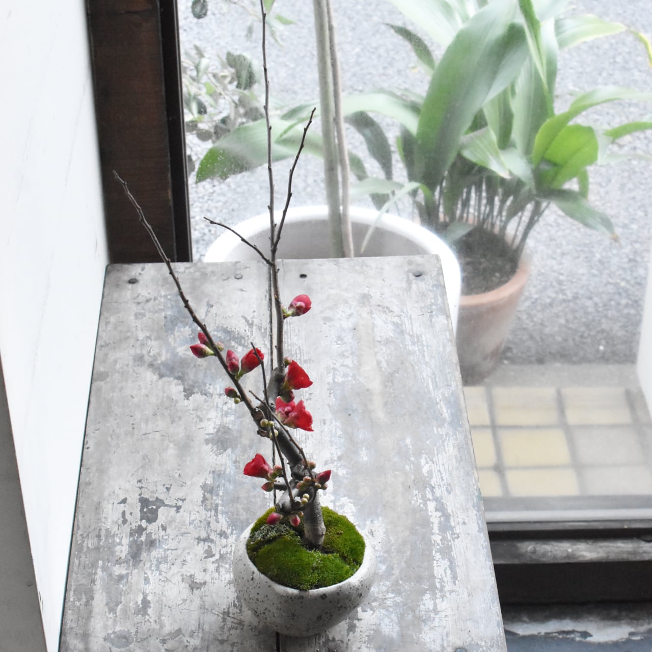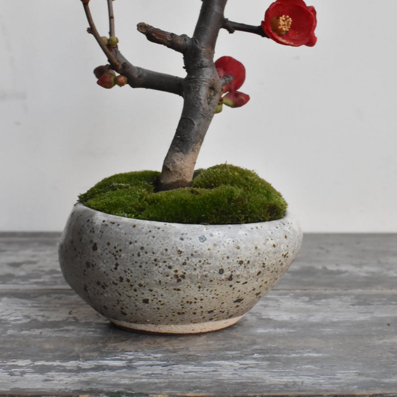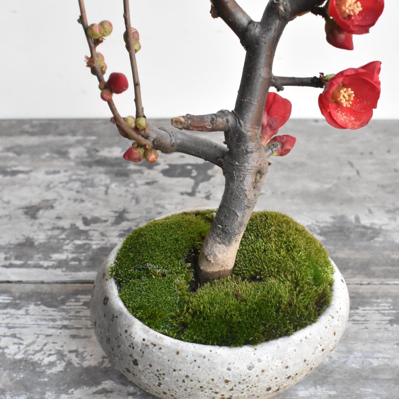 早咲きの一重緋赤の品種です。流通している多くの木瓜盆栽は枝を短く切り詰められていますが、この株は枝が伸びやかに立ち上がっています。