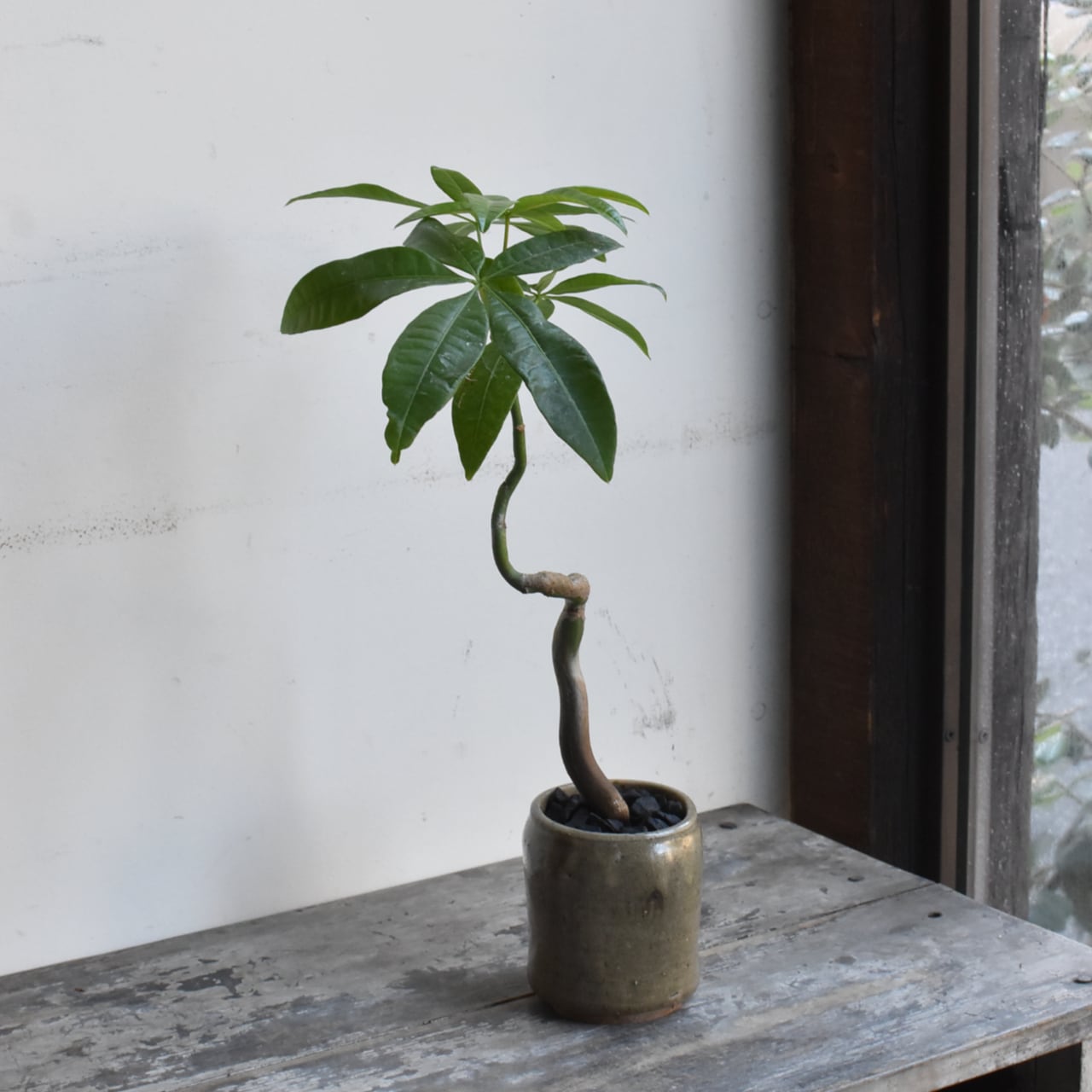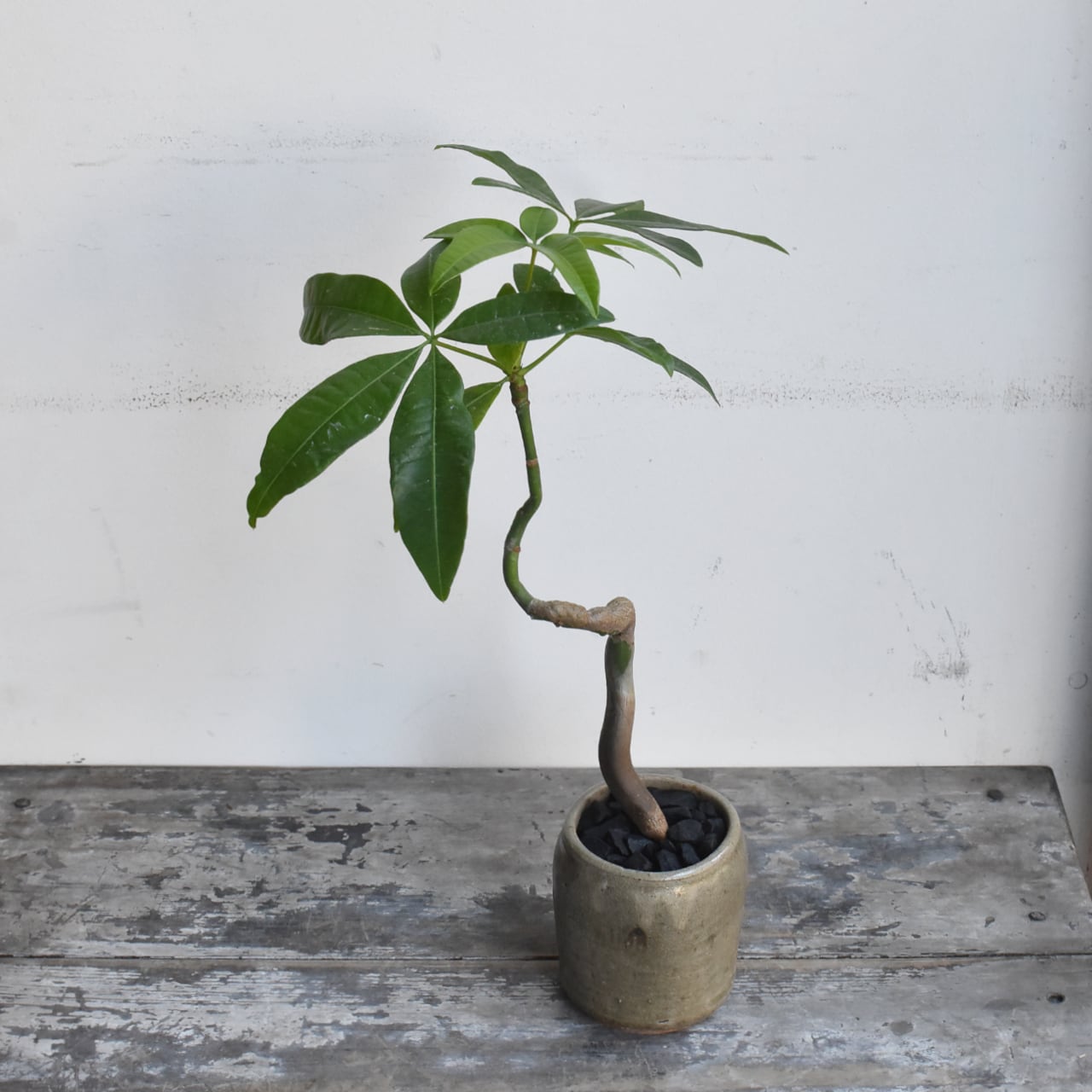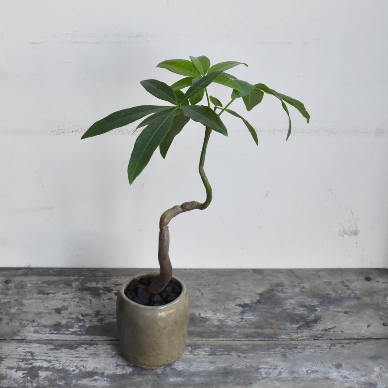 みなさんご存知、キングオブ観葉植物のパキラ。複数本を編み込んであるものが多く出回っていますが、一本だけで仕立てた株はまるで盆栽のようです。曲げられたぷっくりとした幹が魅力的。テーブルサイズですが生命力に溢れています。