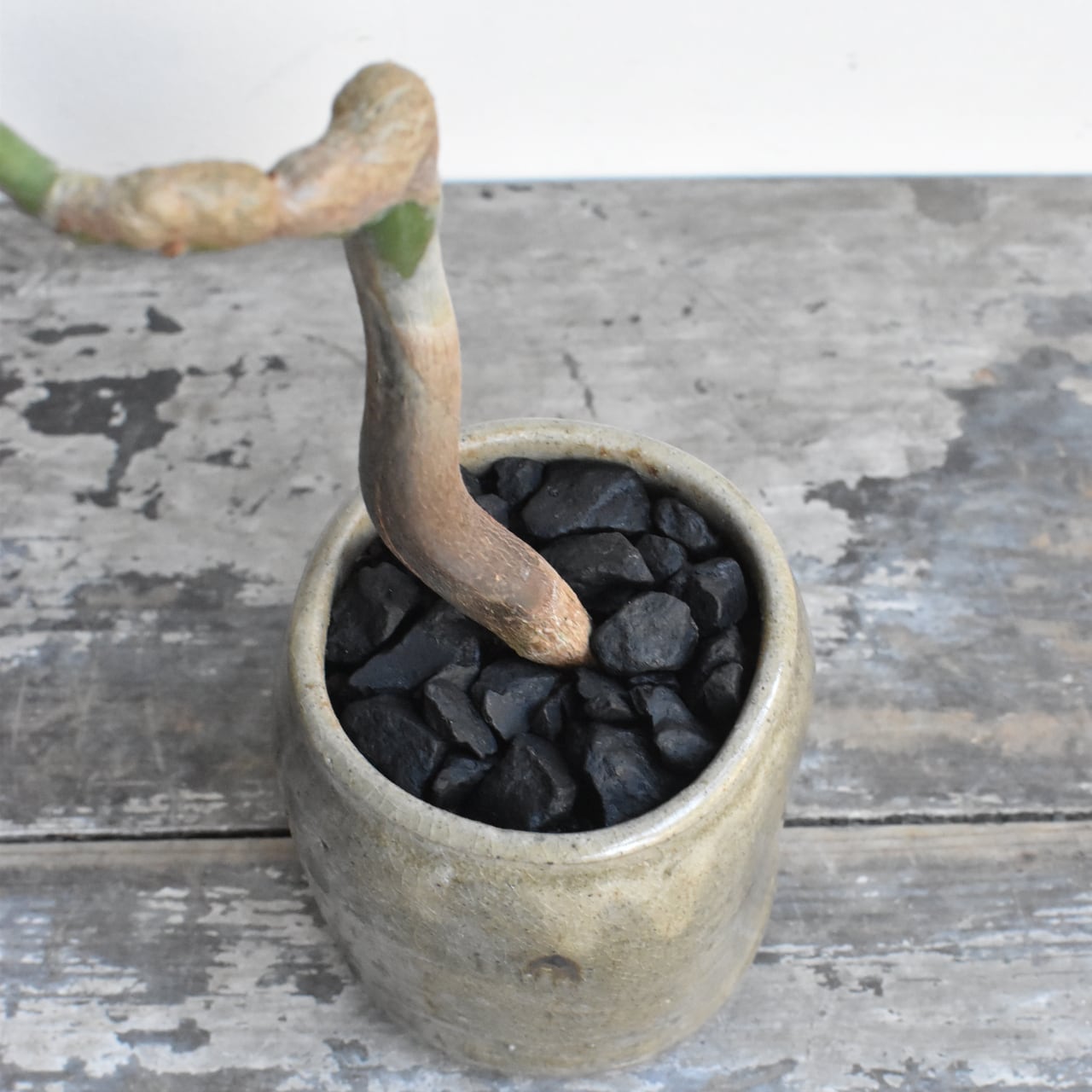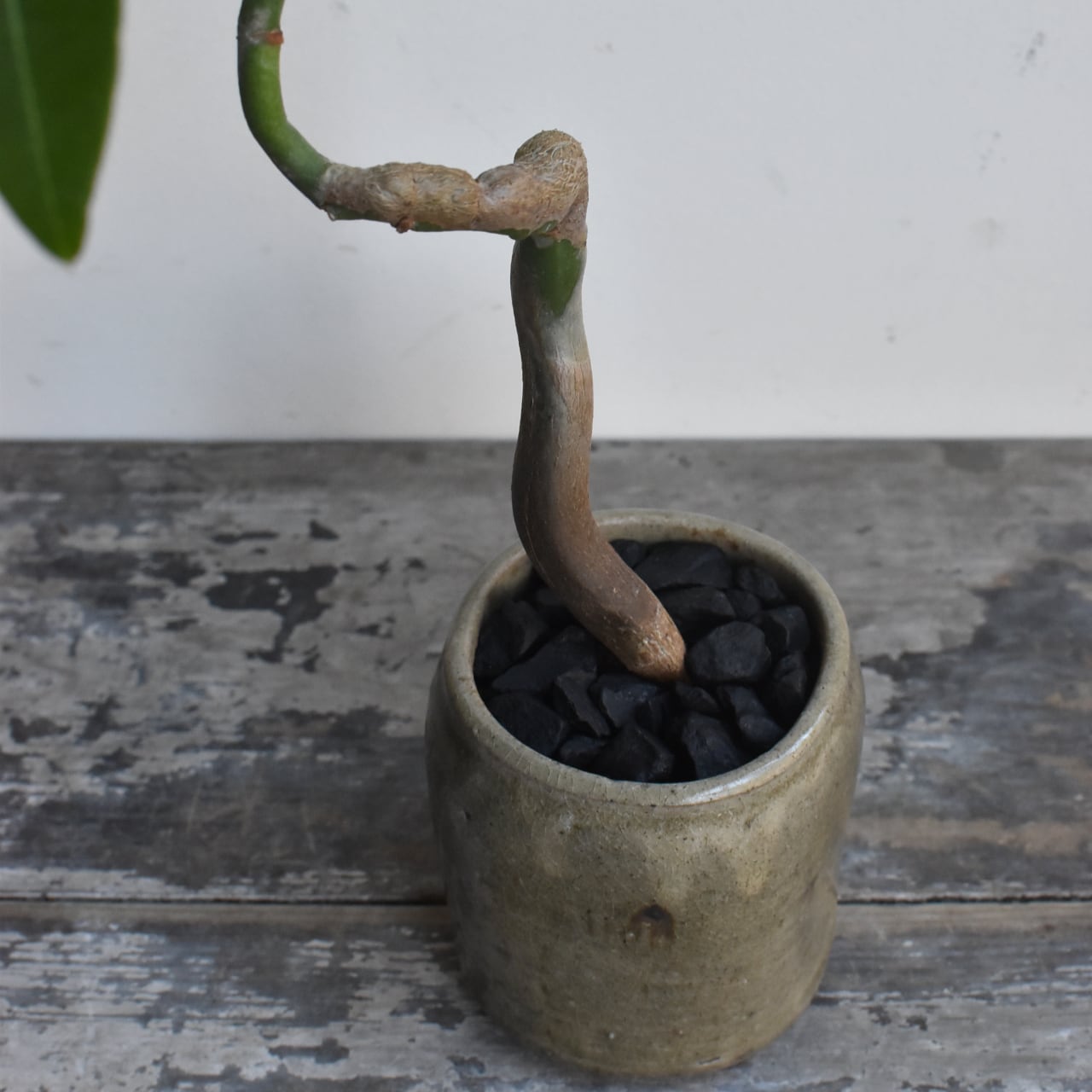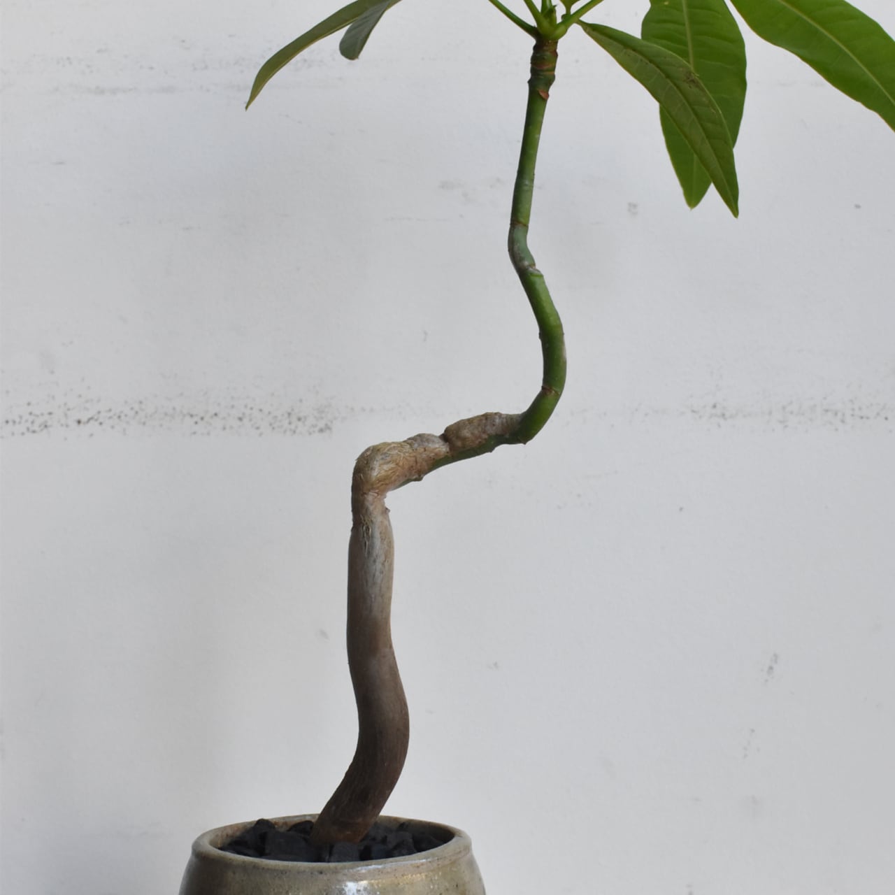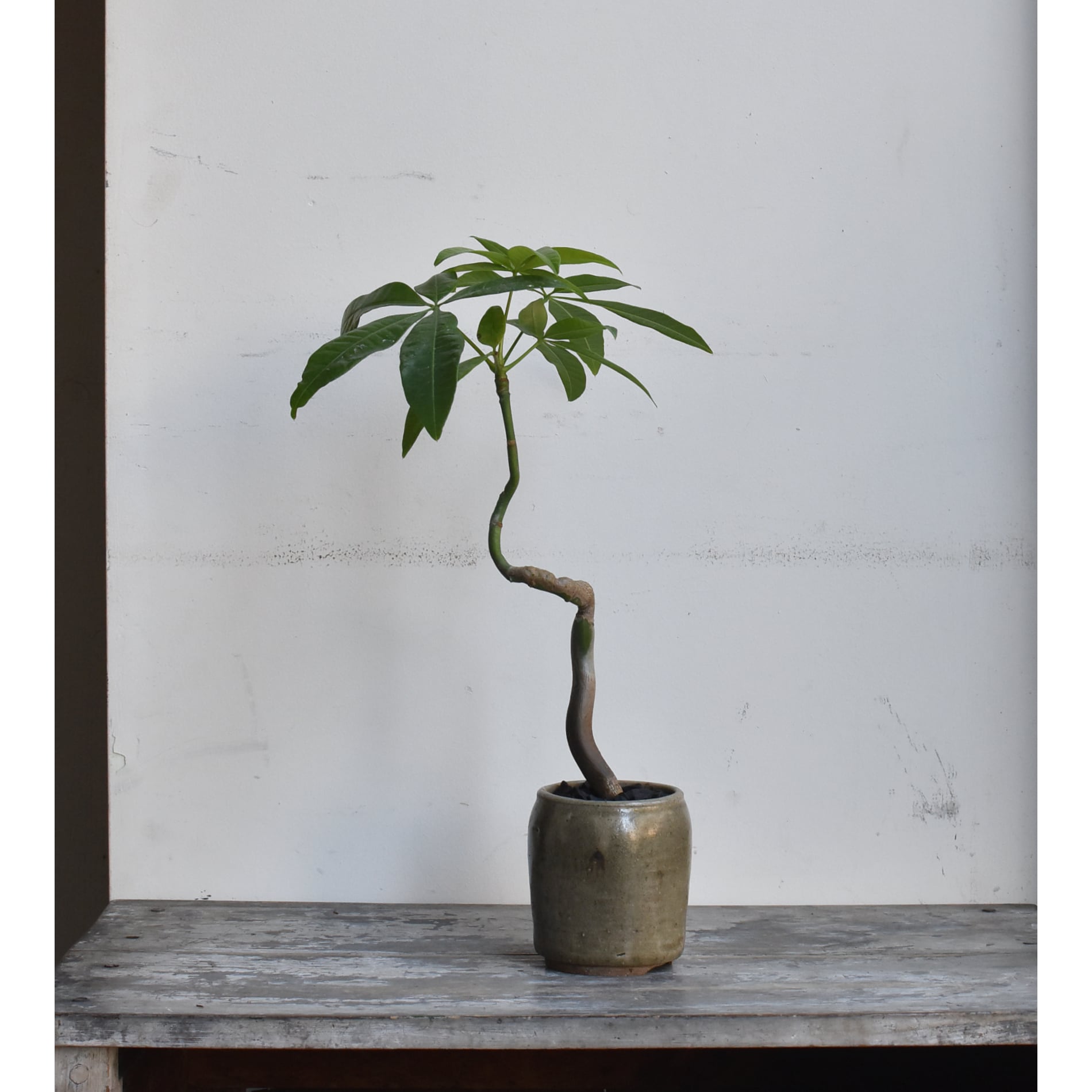 みなさんご存知、キングオブ観葉植物のパキラ。複数本を編み込んであるものが多く出回っていますが、一本だけで仕立てた株はまるで盆栽のようです。曲げられたぷっくりとした幹が魅力的。テーブルサイズですが生命力に溢れています。