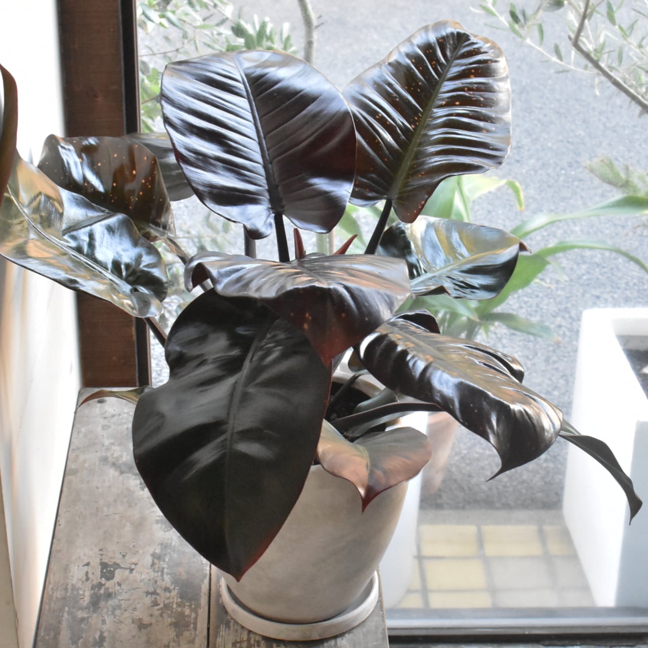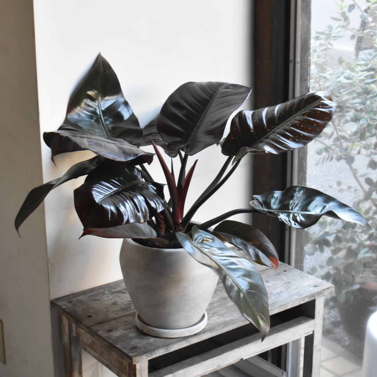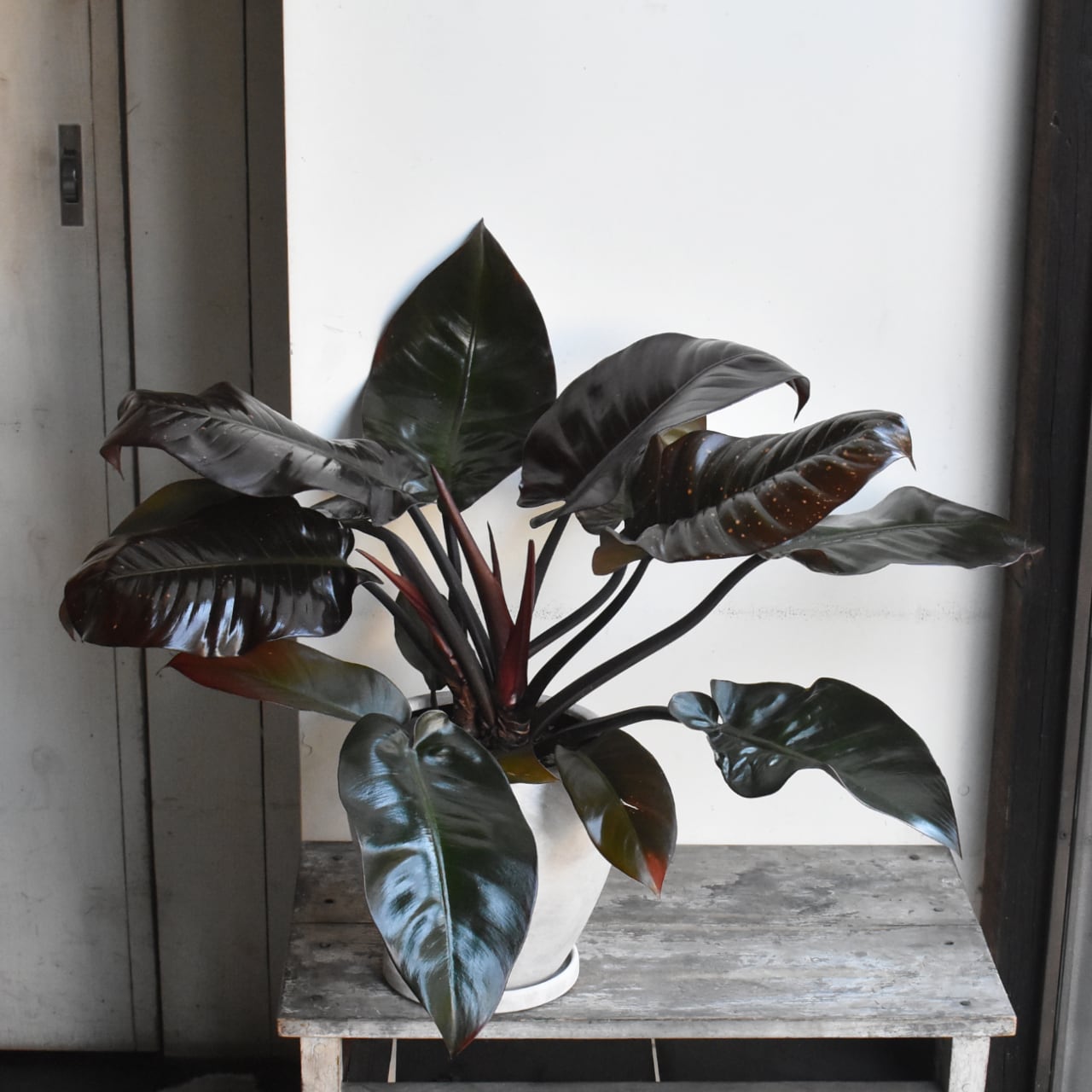 黒い葉のフィロデンドロンです。観葉植物を複数置いているお部屋のアクセントにあすすめです。新葉のエンジ色が差し色に。葉のツヤと造形をお楽しみください。育てやすさは他のフィロデンドロンと同等ですが、光量が少ないとしっかり黒くならないので置き場所に注意します。掲載写真7枚目のように、酷暑時期に発生しやすい斑点の出ている葉が数枚あります。ご了承ください。