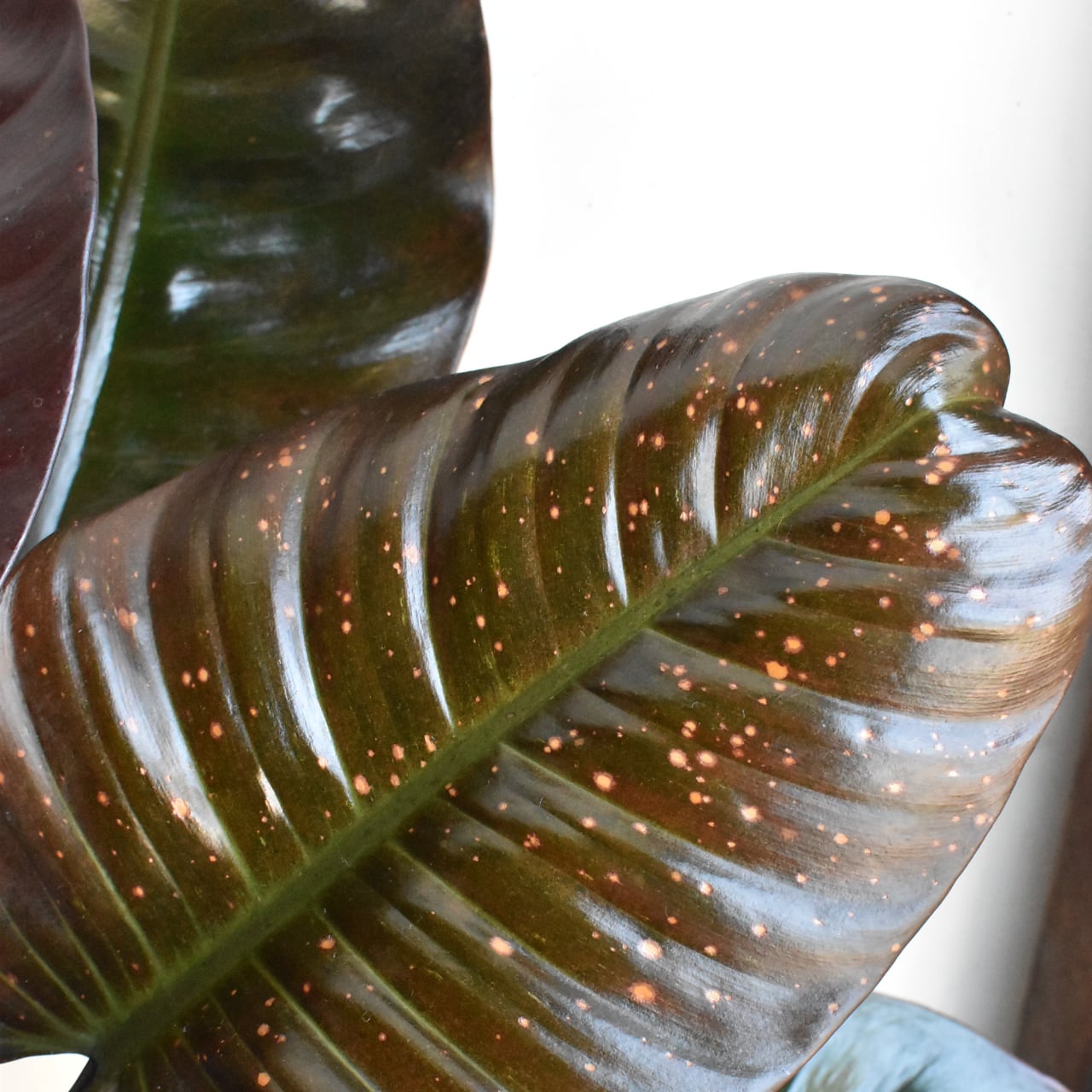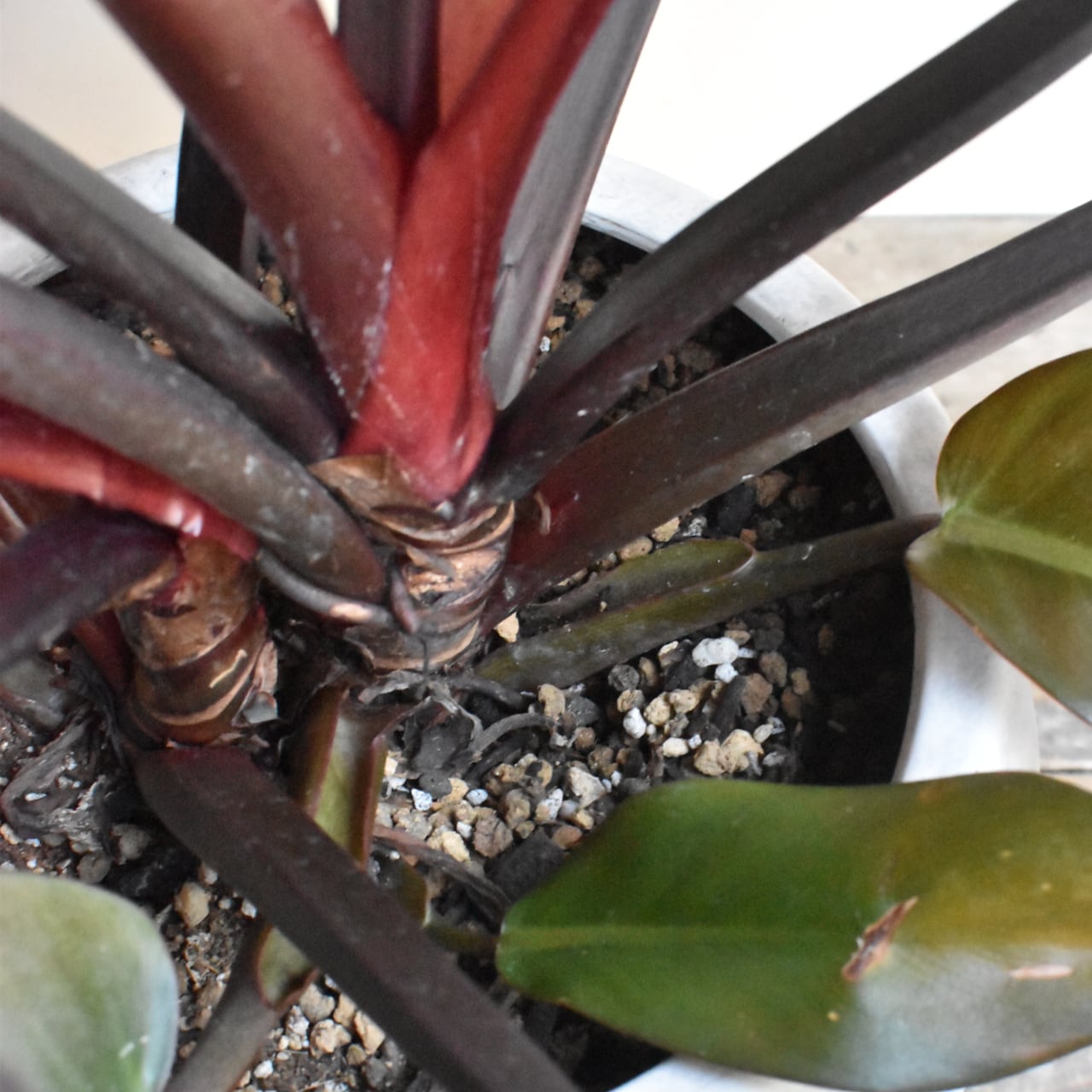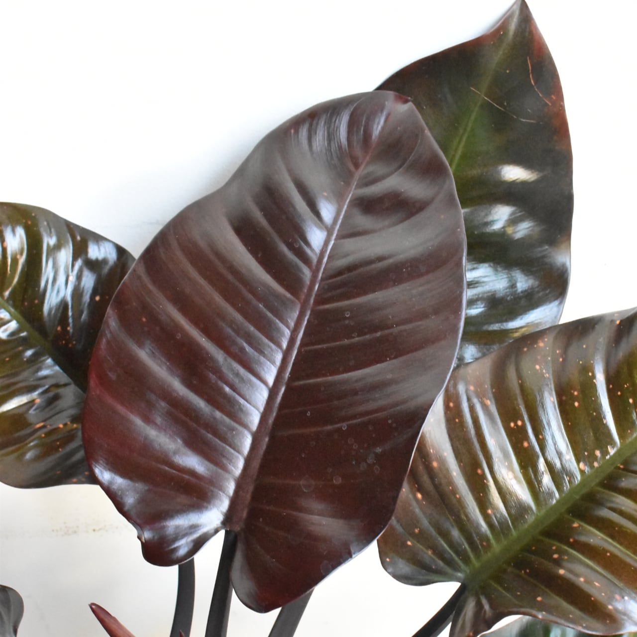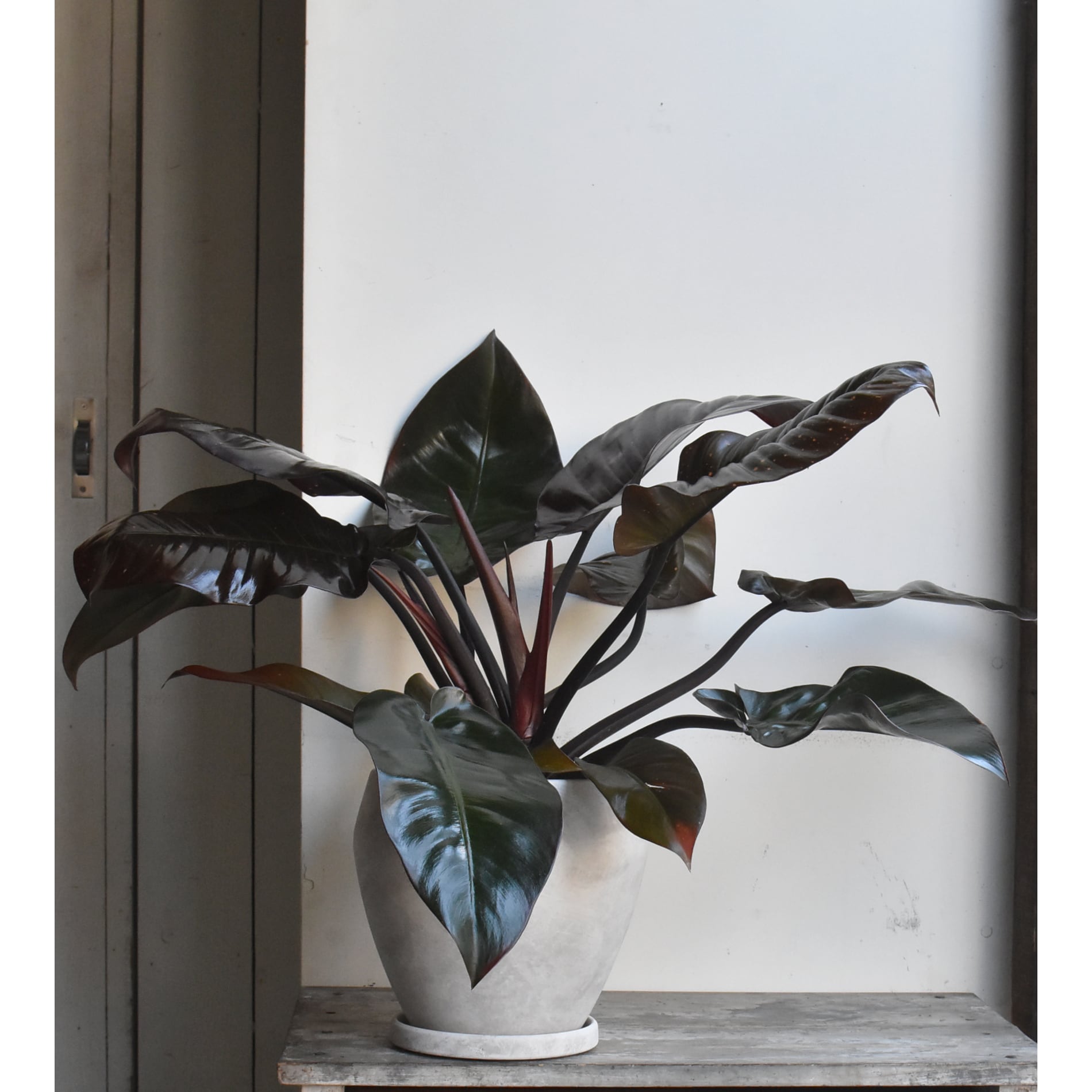 黒い葉のフィロデンドロンです。観葉植物を複数置いているお部屋のアクセントにあすすめです。新葉のエンジ色が差し色に。葉のツヤと造形をお楽しみください。育てやすさは他のフィロデンドロンと同等ですが、光量が少ないとしっかり黒くならないので置き場所に注意します。掲載写真7枚目のように、酷暑時期に発生しやすい斑点の出ている葉が数枚あります。ご了承ください。