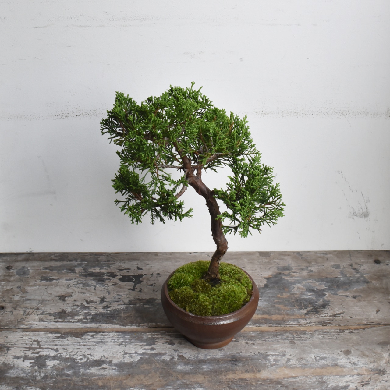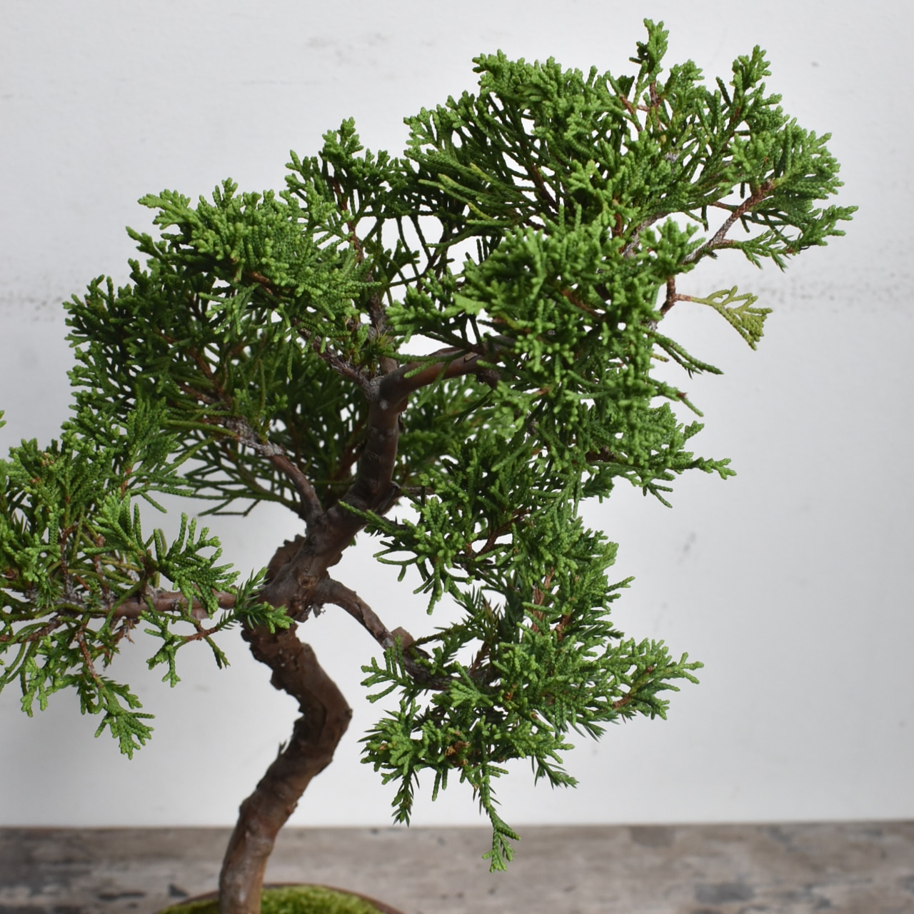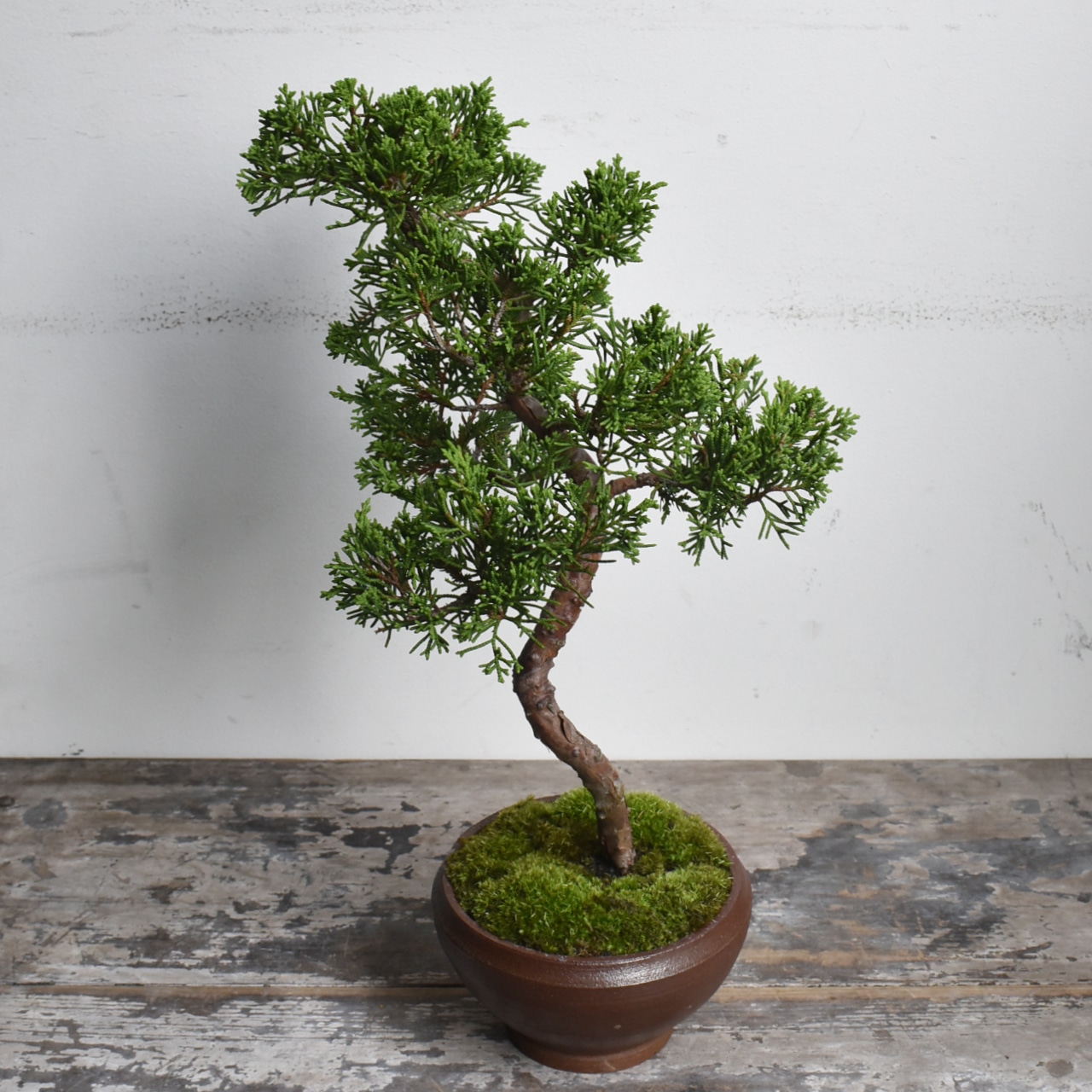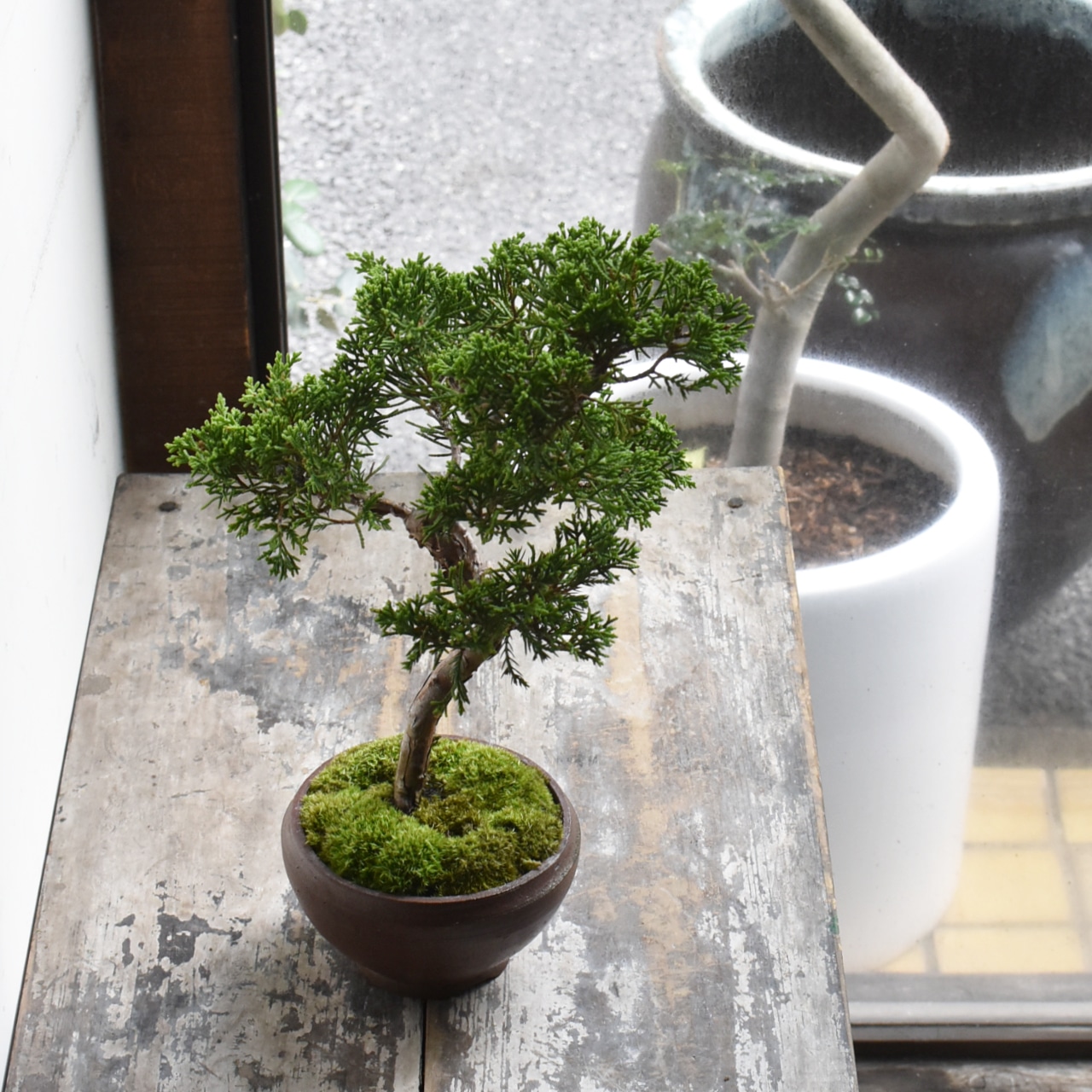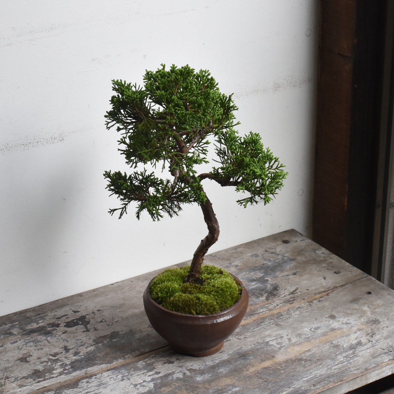 学術名はミヤマビャクシンといい、これを盆栽の世界ではシンパクと呼びます。真柏は強い曲付けにも耐え、様々な樹形を作り易いため、松に並び盆栽趣向の神髄ともいえる存在です。