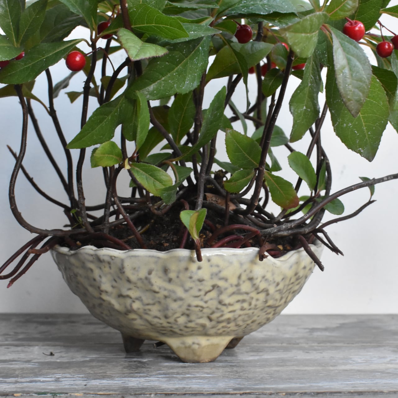 自然界では落葉樹の根元に茂る植物ですので、真夏は日陰で涼しく管理します。それ以外の季節は、午前中一杯はしっかりと直射を当てるか、一日中木漏れ日のような環境を整えてあげましょう。年間通じて屋外で季節ごとの気温変化を感じさせてあげる事で、本来の美しい真っ赤な実の色付きを楽しめます。