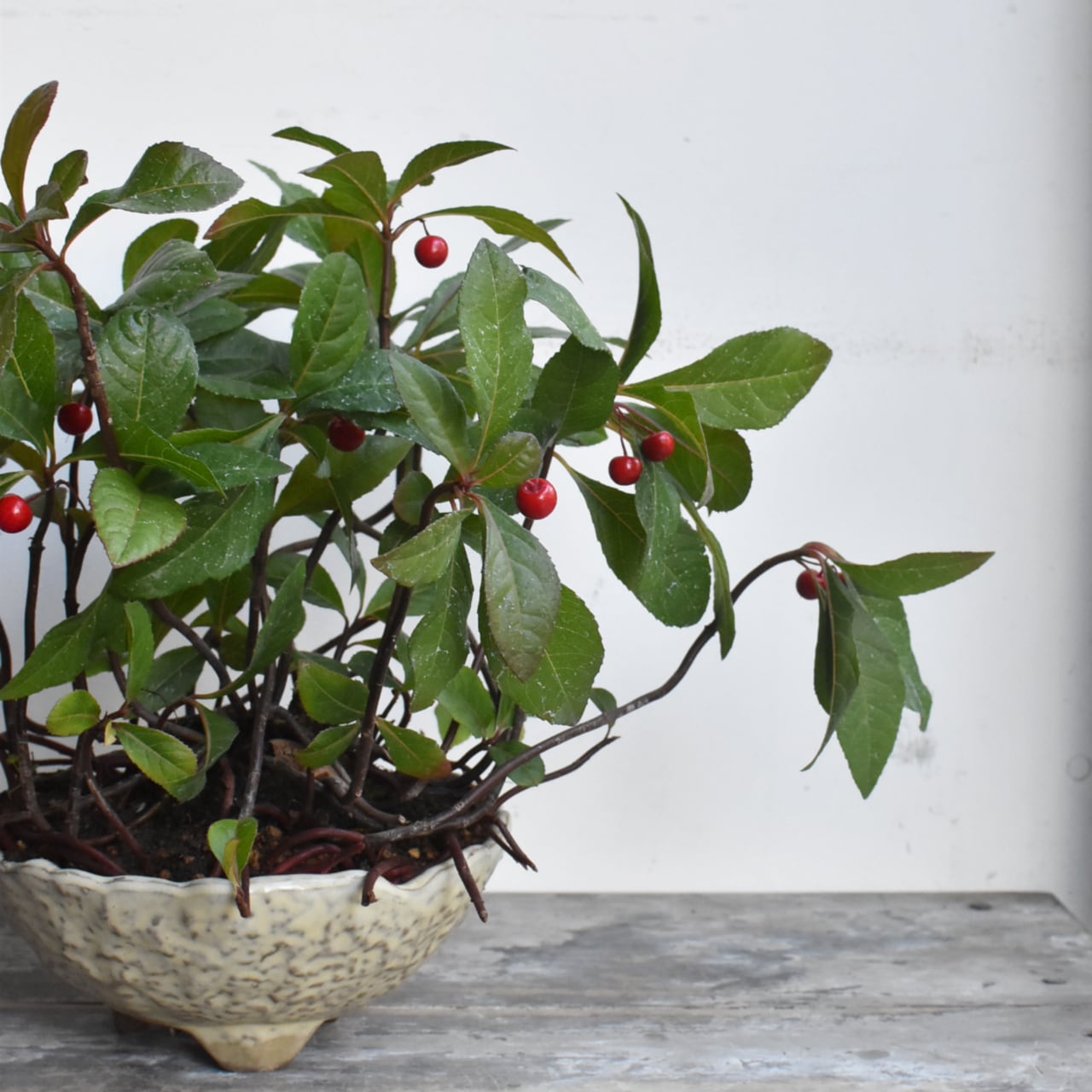 森林の湿った落ち葉を踏みしめると、足元にひっそりとルビーのような実をつけたヤブコウジに出会えます。自生地ではこんもりと茂り、身を寄せ合ってコロニーを作っています。初夏にはこれまたひっそりと白い俯いた小花を咲かせ、実をつけます。好きなタイミングで室内に取り込んで、小さな森を感じましょう。