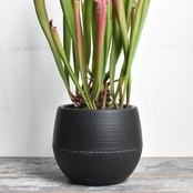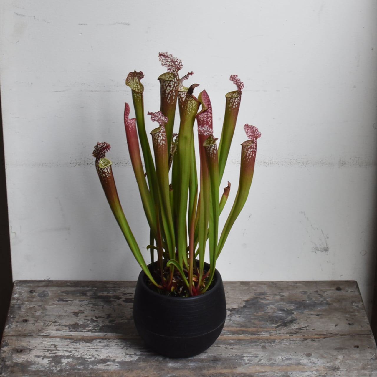 筒状になった葉(捕虫葉)を持つ食虫植物。口を開け悠々とターゲットを待ち構える姿がユニークです。葉の開口部の網目模様が美しい品種です。