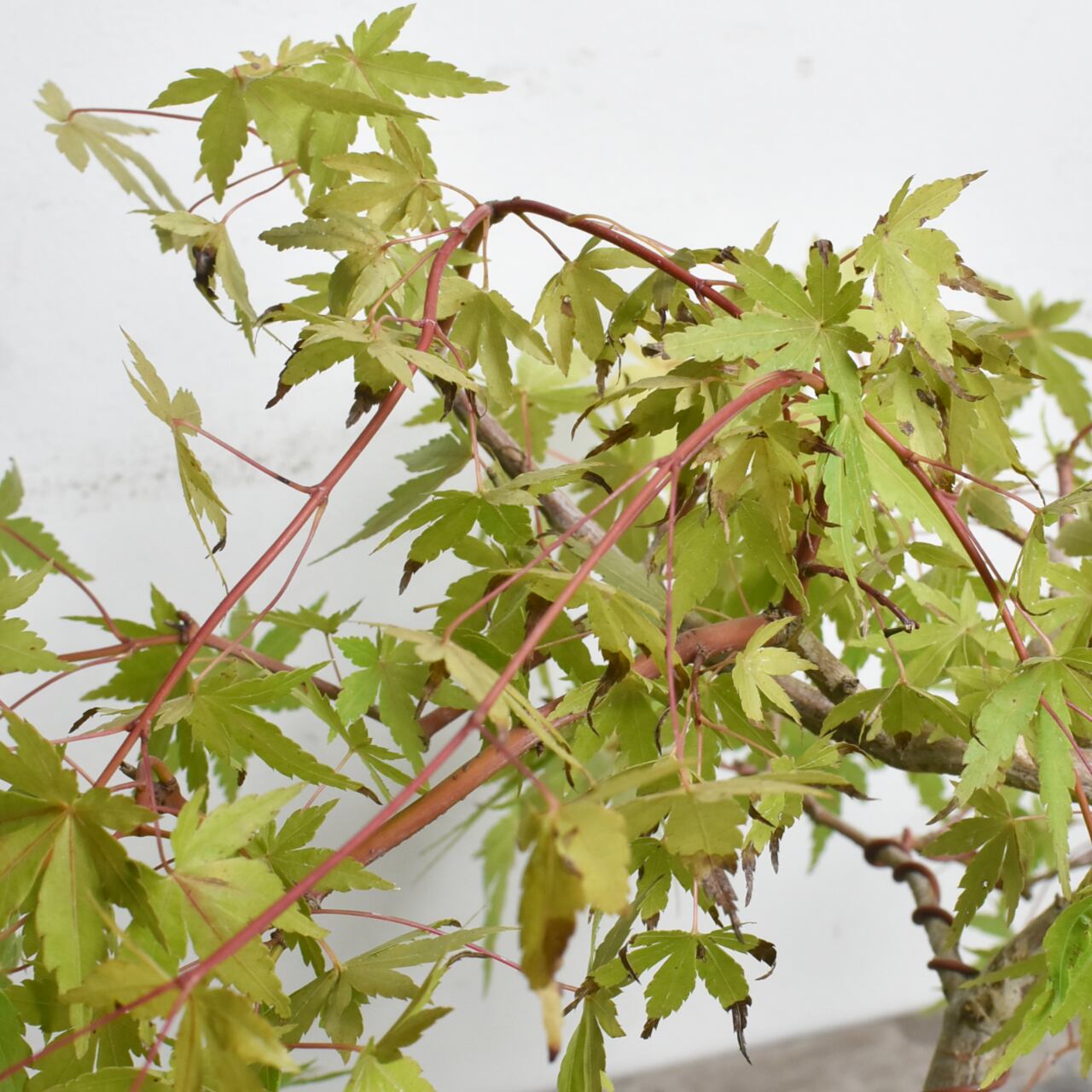 イロハモミジ系の枝垂性品種で、枝が大きく張り出したユニークな姿が特徴の株です。モミジの葉の風情と、枝垂れる樹形の組み合わせが大変美しい品種です。季節に敏感な植物と共に過ごし、四季の移ろいを身近で楽しんでください。
