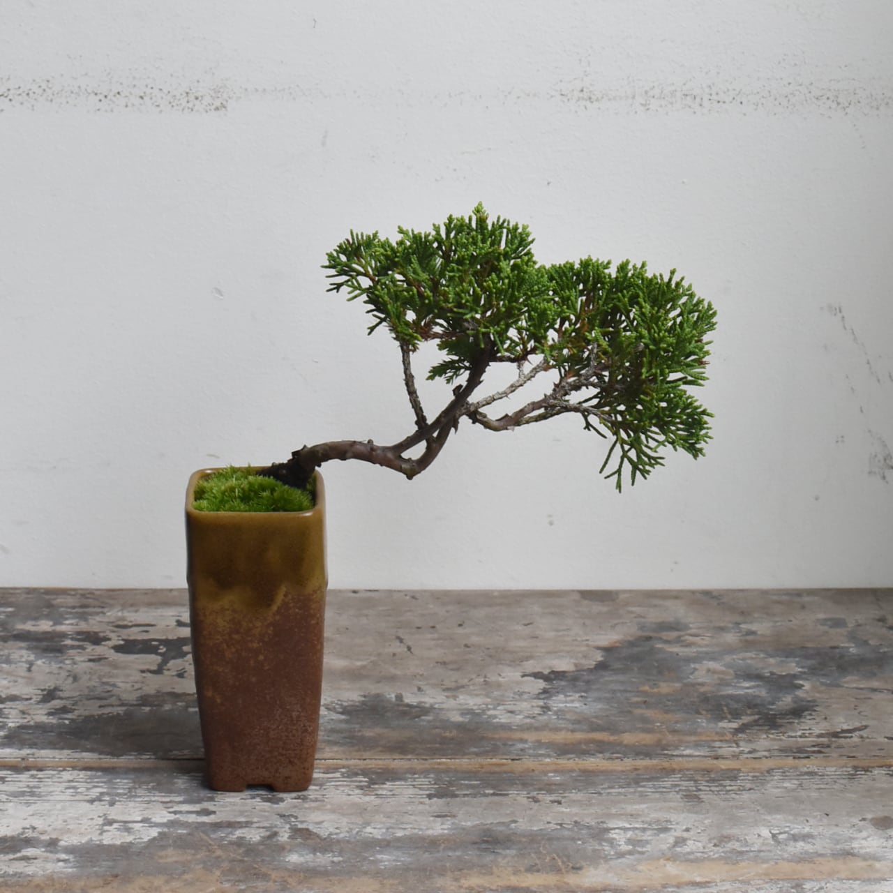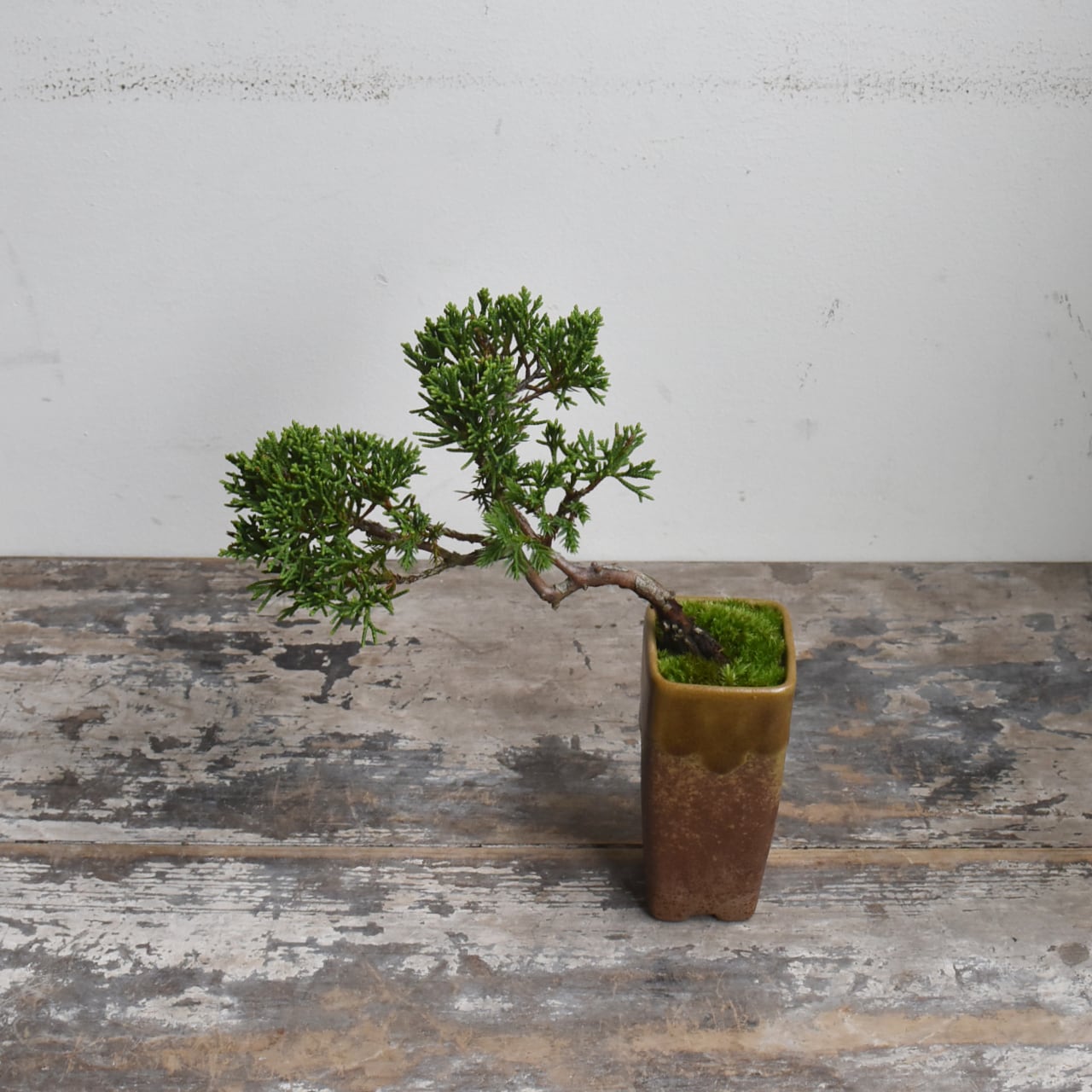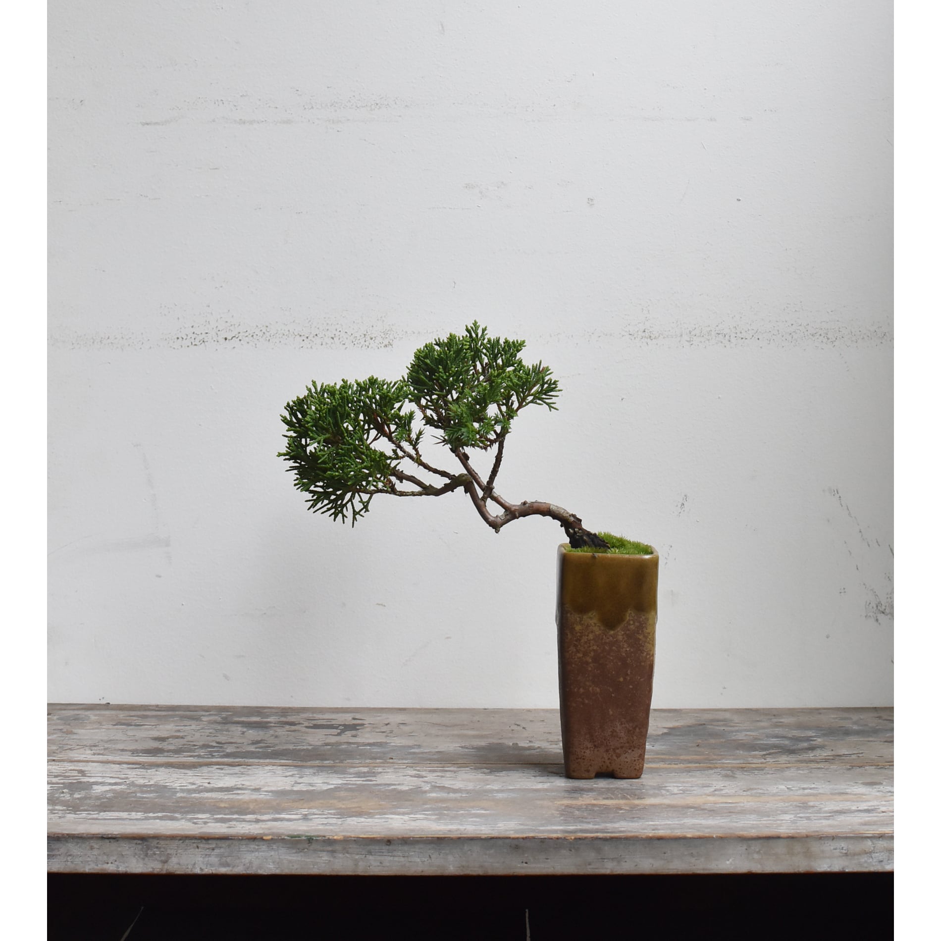 まだ若い木ですが、懸崖鉢から迫り出した仕立てが、小さいながらも深山の過酷な自然環境をイメージさせてくれる一品です。まだまだ枝葉の密度は足りませんが、あなたの手で秀逸な樹にしてあげてください。