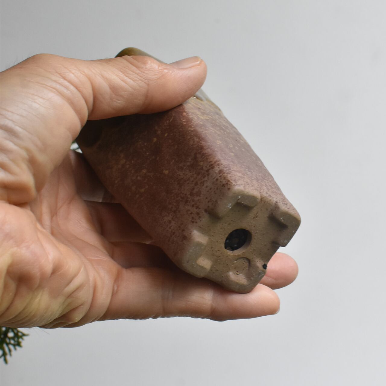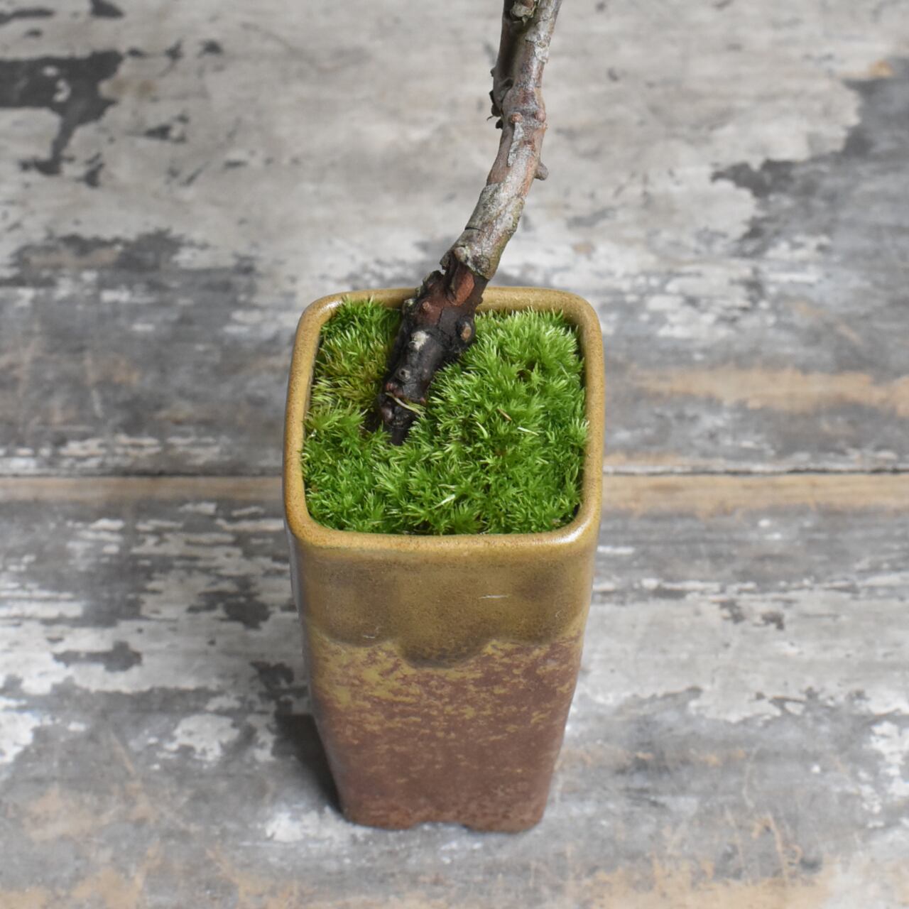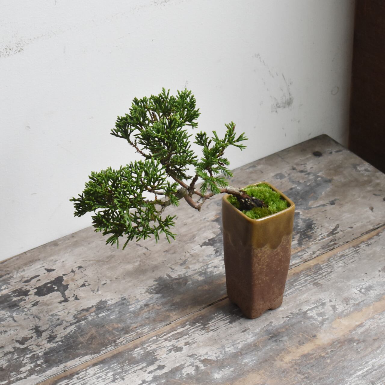 まだ若い木ですが、懸崖鉢から迫り出した仕立てが、小さいながらも深山の過酷な自然環境をイメージさせてくれる一品です。まだまだ枝葉の密度は足りませんが、あなたの手で秀逸な樹にしてあげてください。