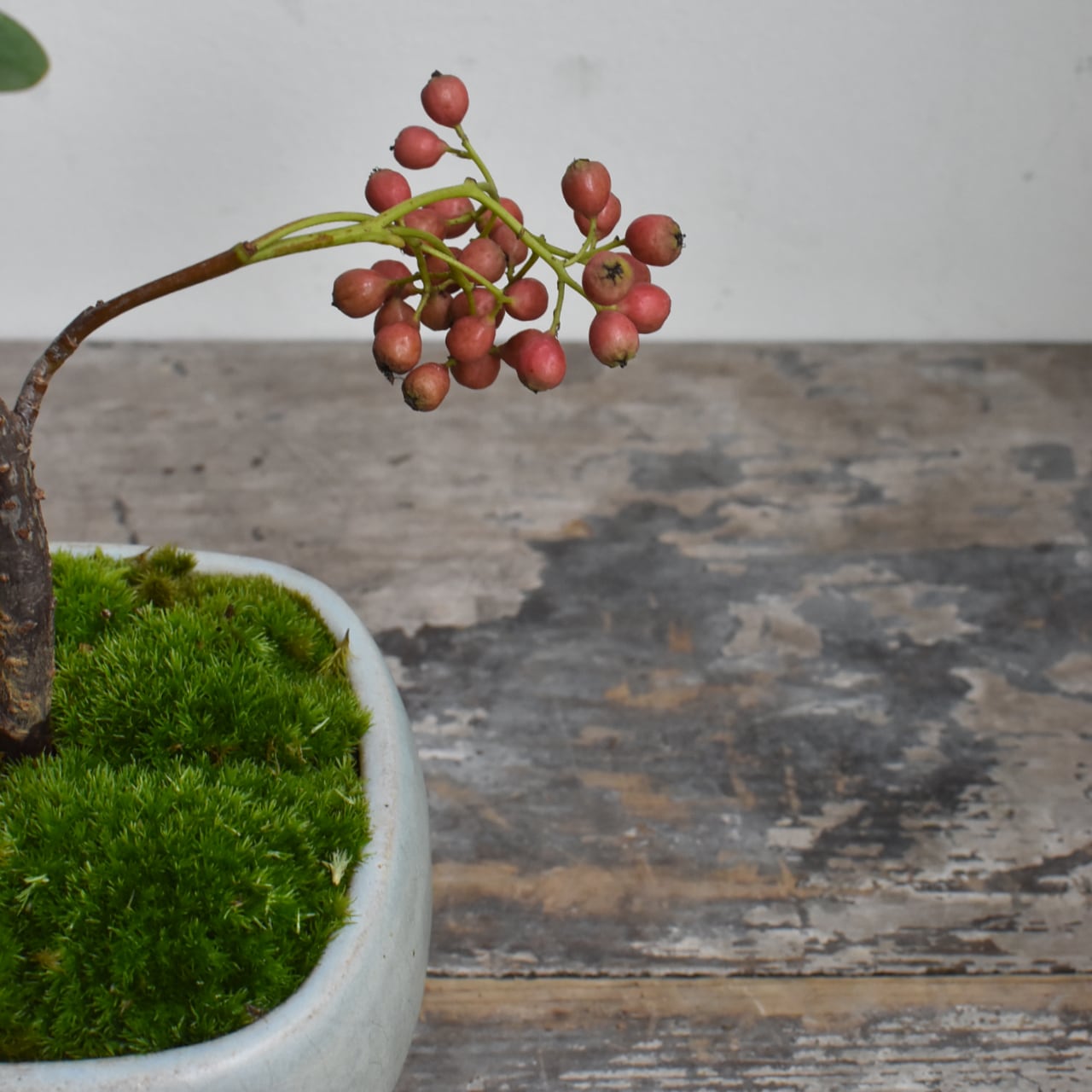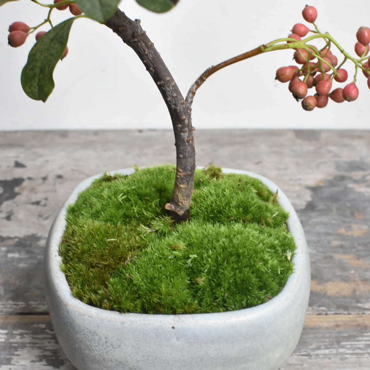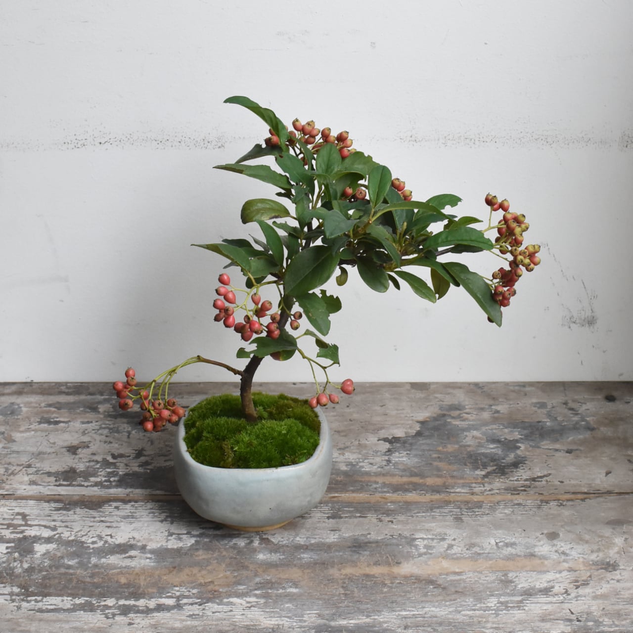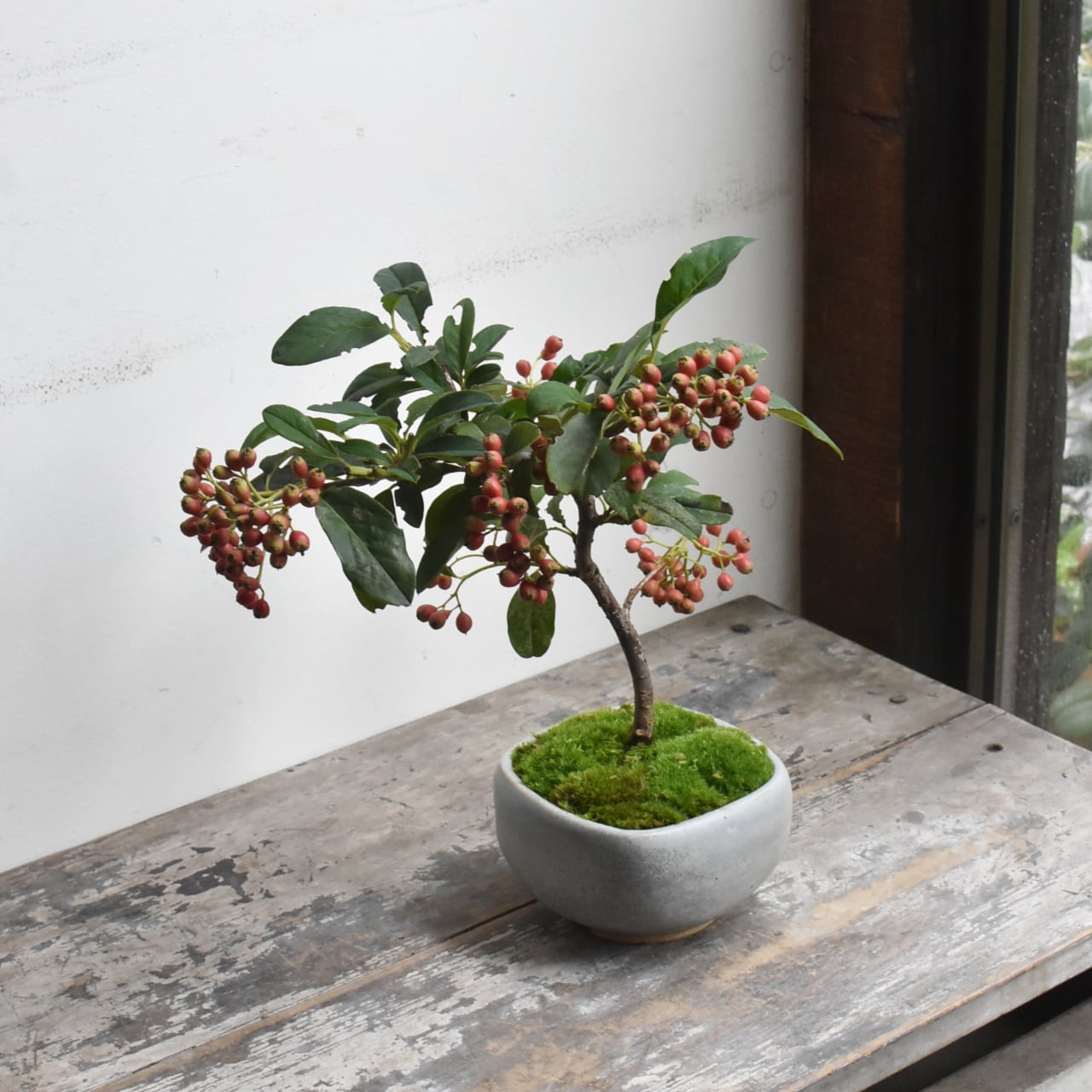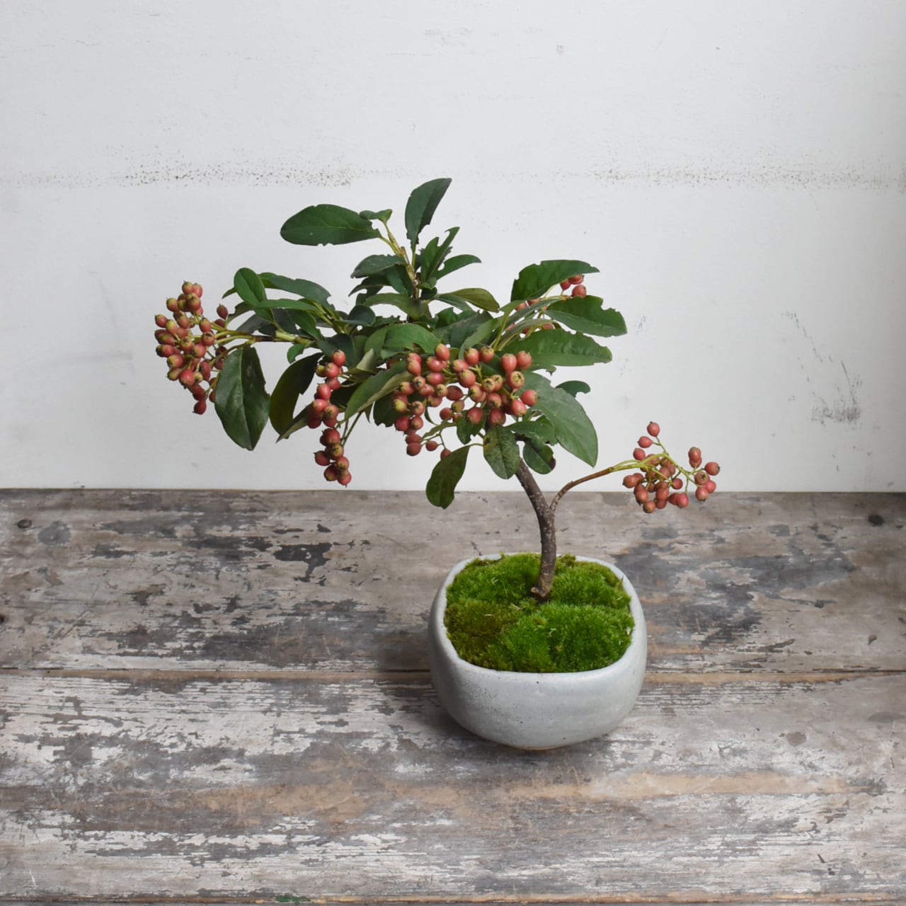庭木でよく見かける樹種も、小さく仕立てるとこんな上品に。春には白い花、秋には可憐な実姿と一年を通してながく楽しめます。育て易く、毎年実を付けやすいのも魅力です。
