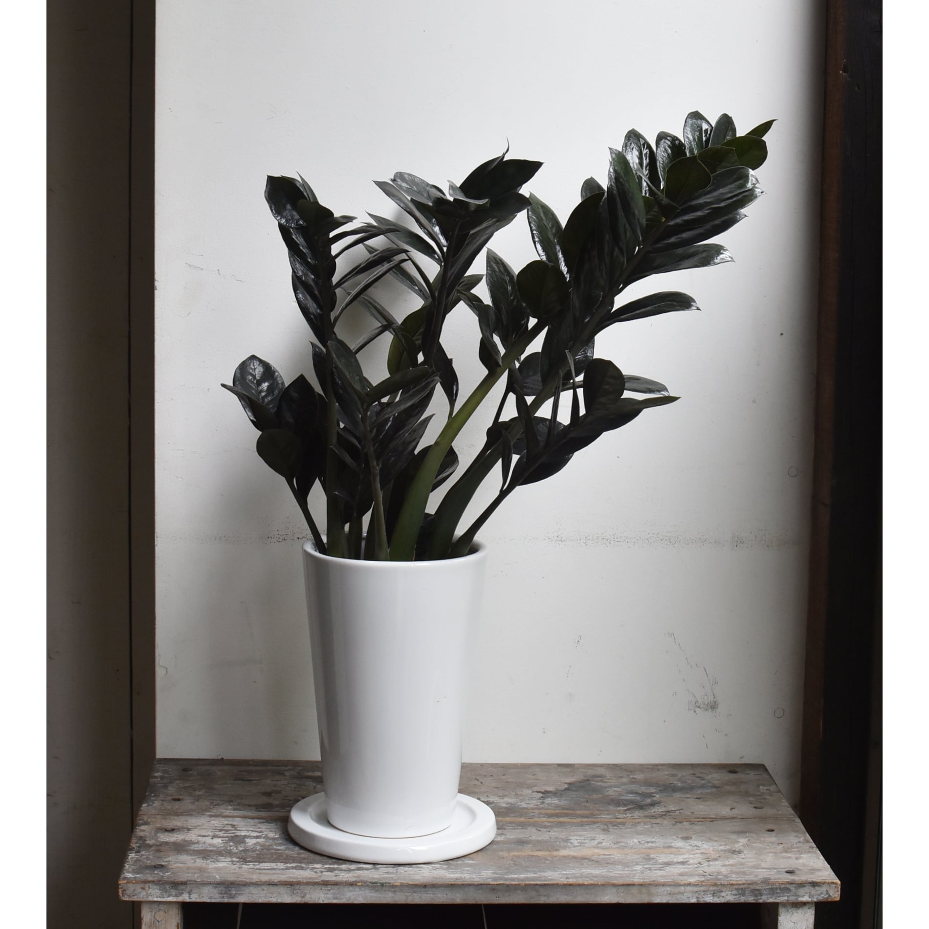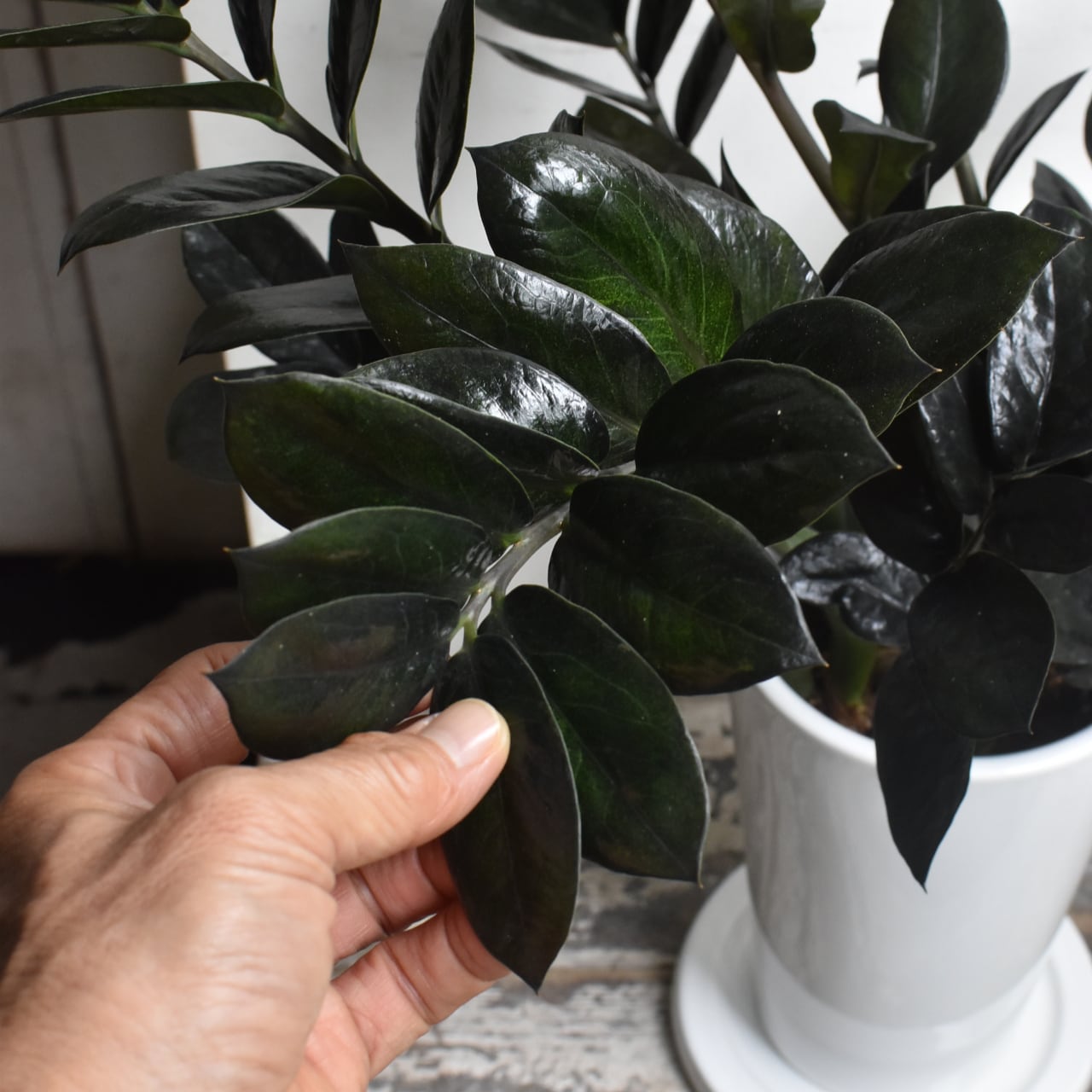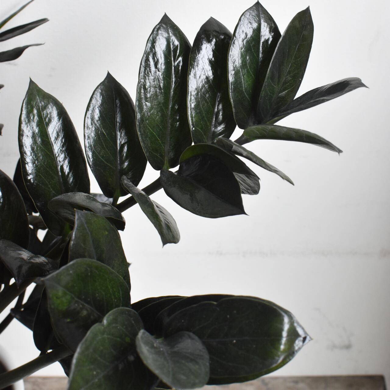 人気種、黒葉のザミオクルカスです。光沢のある葉が連なるように展開し、根元から葉先へとゆるやかな曲線を描きます。多肉質な葉柄は力強く、対して葉は空気を纏ったようにふわりと広がります。柔らかな日差しを好むため、室内用でお探しの方には環境に馴染みやすくオススメです。