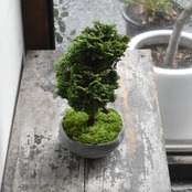 岡山県津山地方で発見された八房性のヒノキです。小さい葉が密生してくれるので小さくても大木感があります。冬の間は寒さでやや赤茶色を帯びますが、春になると緑色に戻ります。管理もたやすく強健なので、はじめて盆栽を育てる方にもお勧めです。伸びすぎた葉を摘むことで、樹形を維持します。