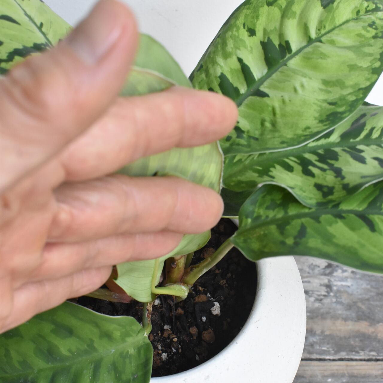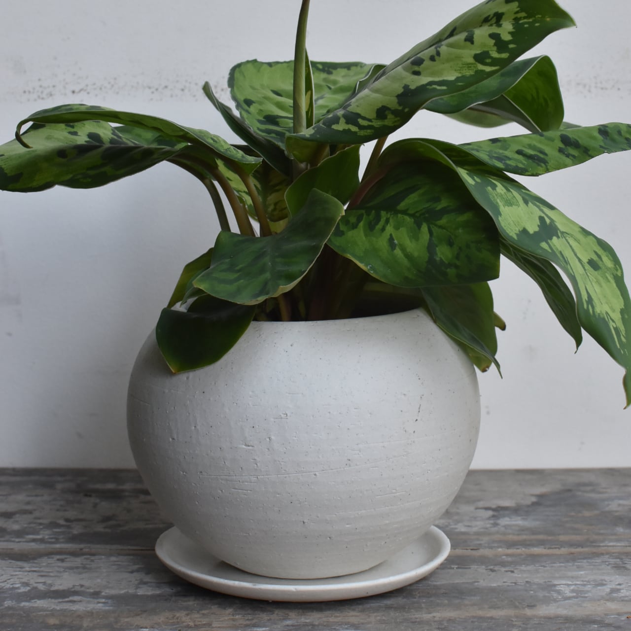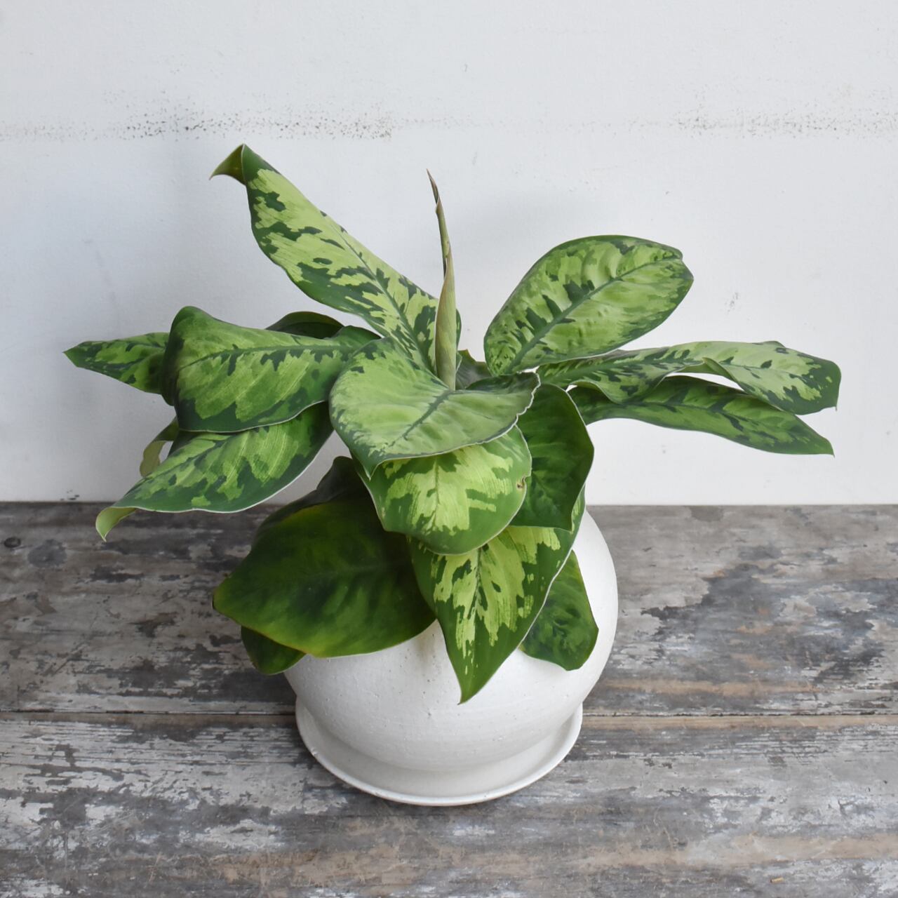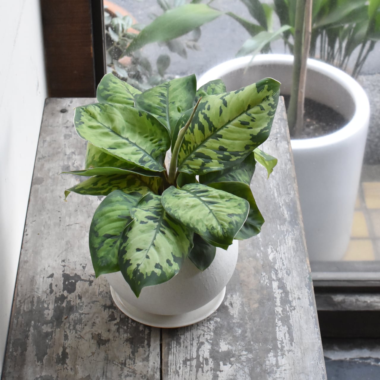 名前の通りカモフラージュ柄の葉が目を惹く品種。株元や鉢を覆うように葉が広がります。アグラオネマやディフェンバキアのように背が高くならず、長期間コンパクトな草姿を楽しんでいただけます。