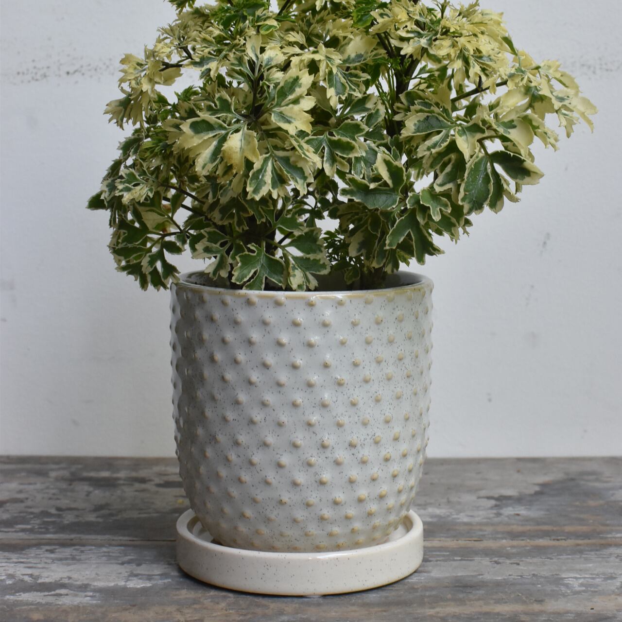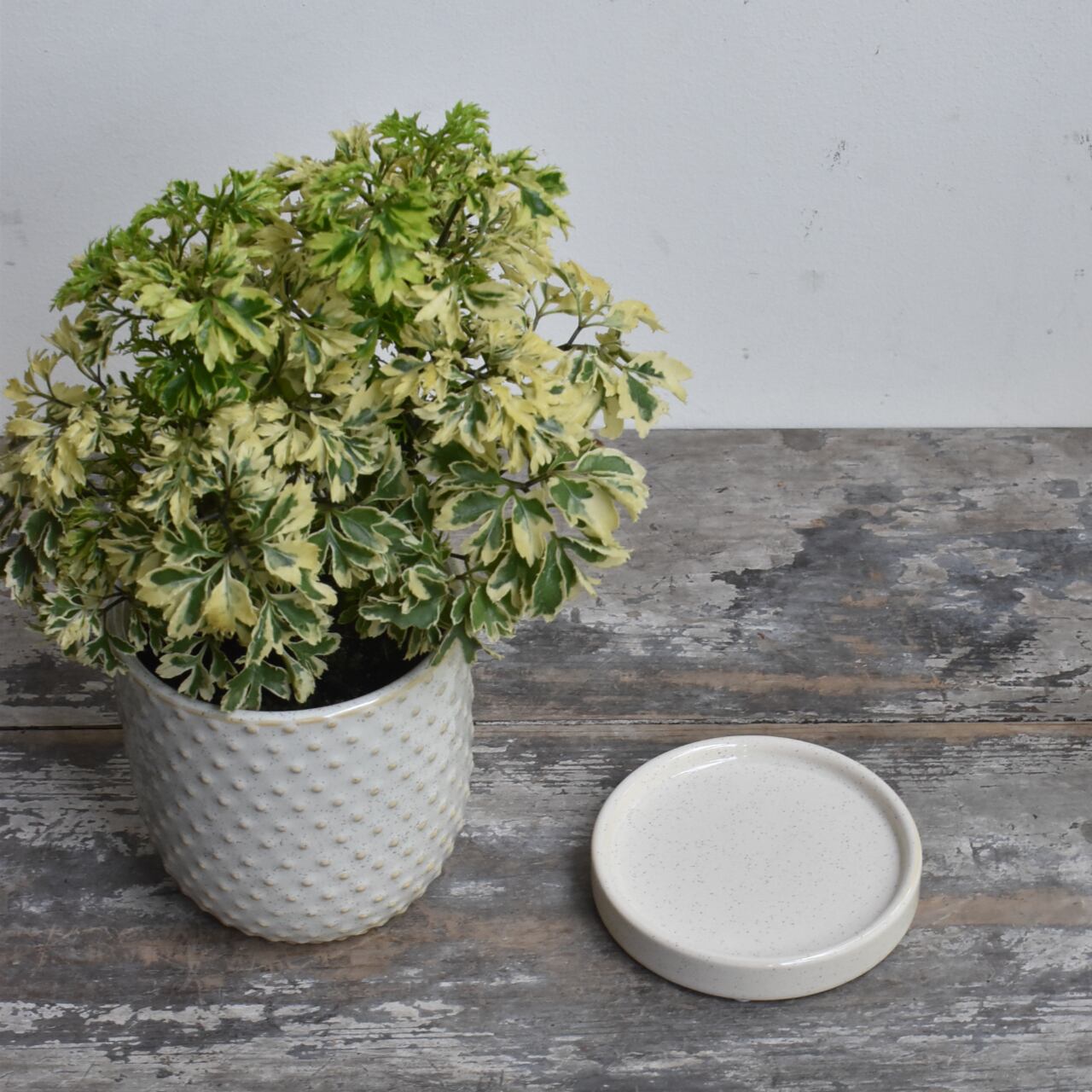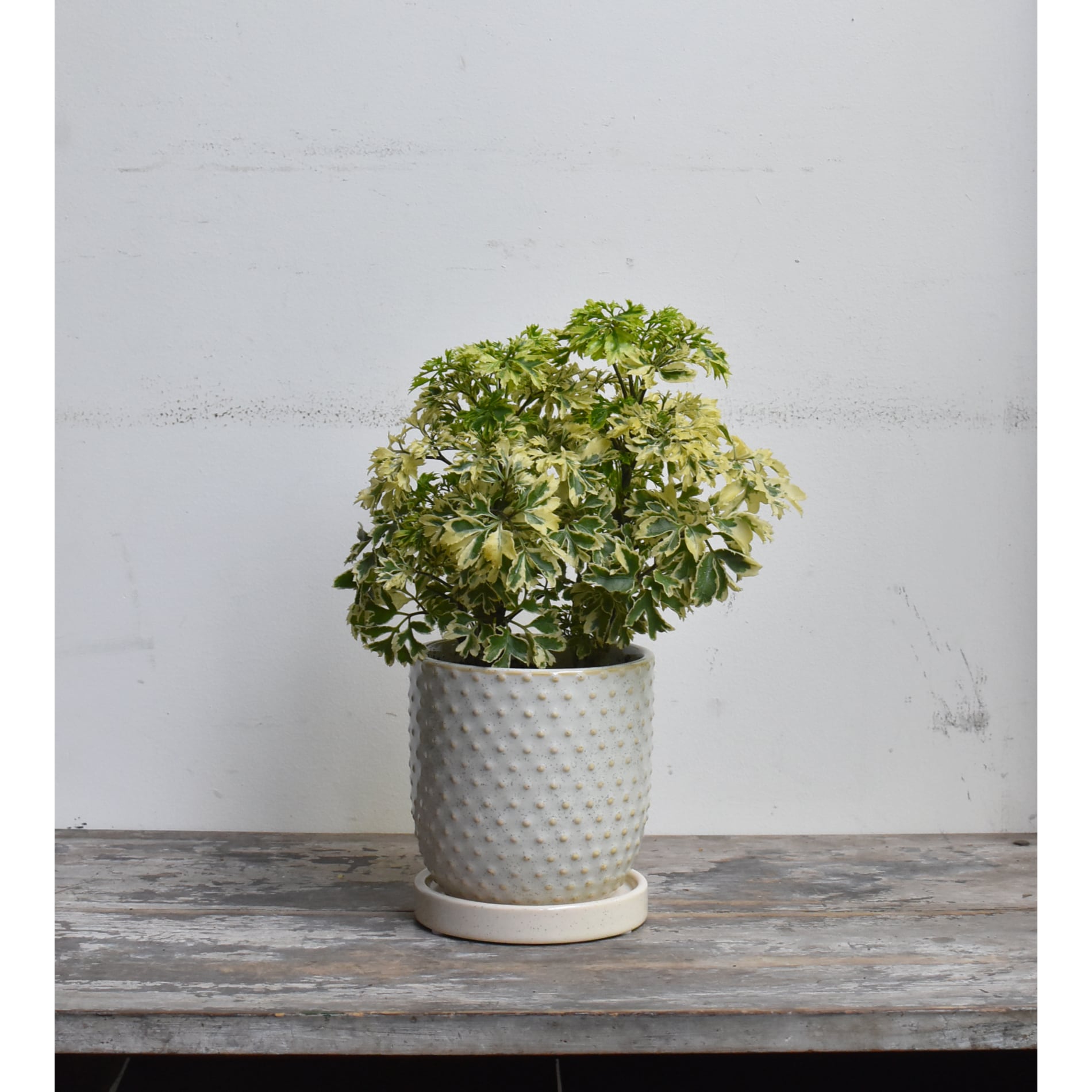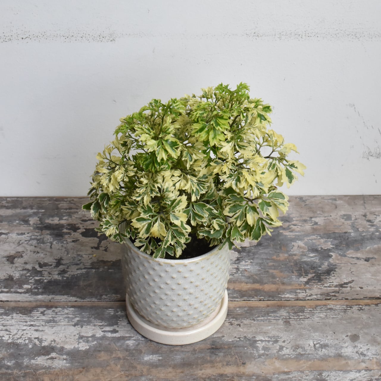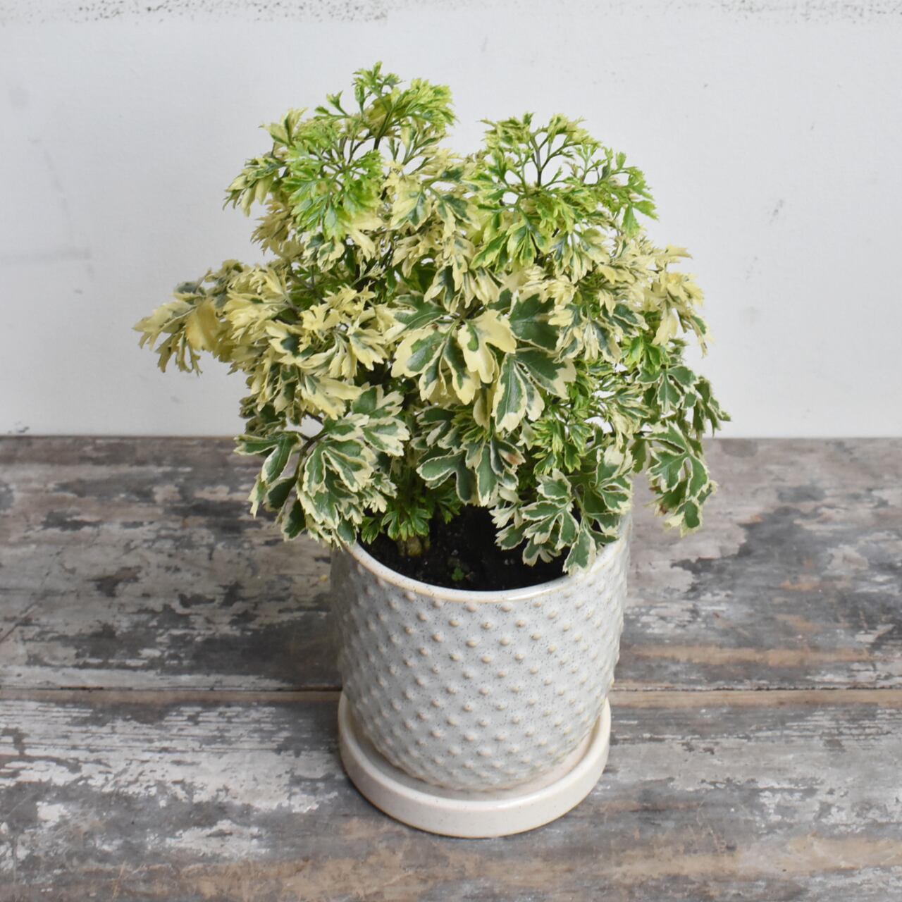 切れ込みの入った斑入り葉がふんわりと繁り、品種名通りの涼しげで透き通るような印象の品種です。生長スピードが遅く、コンパクトで可愛らしい姿を長期間楽しませてくれます。