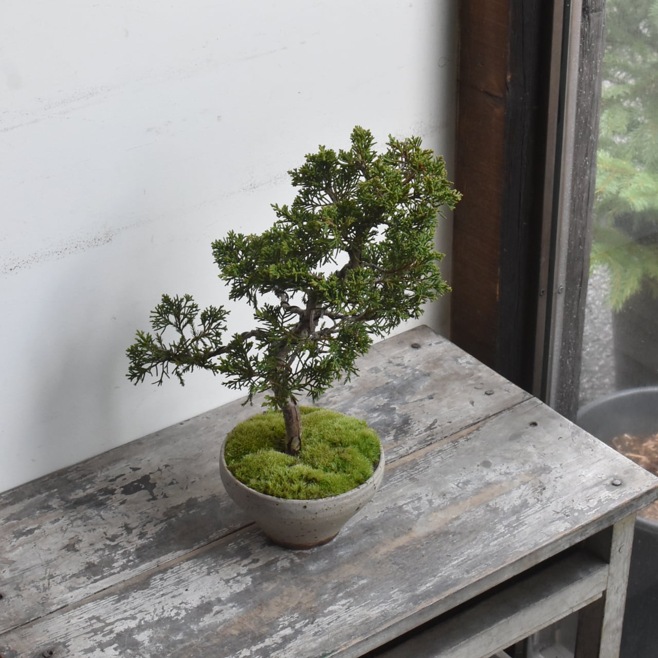 学術名はミヤマビャクシンといい、これを盆栽の世界ではシンパクと呼びます。真柏は強い曲付けにも耐え、様々な樹形を作り易いため、松に並び盆栽趣向の神髄ともいえる存在です。