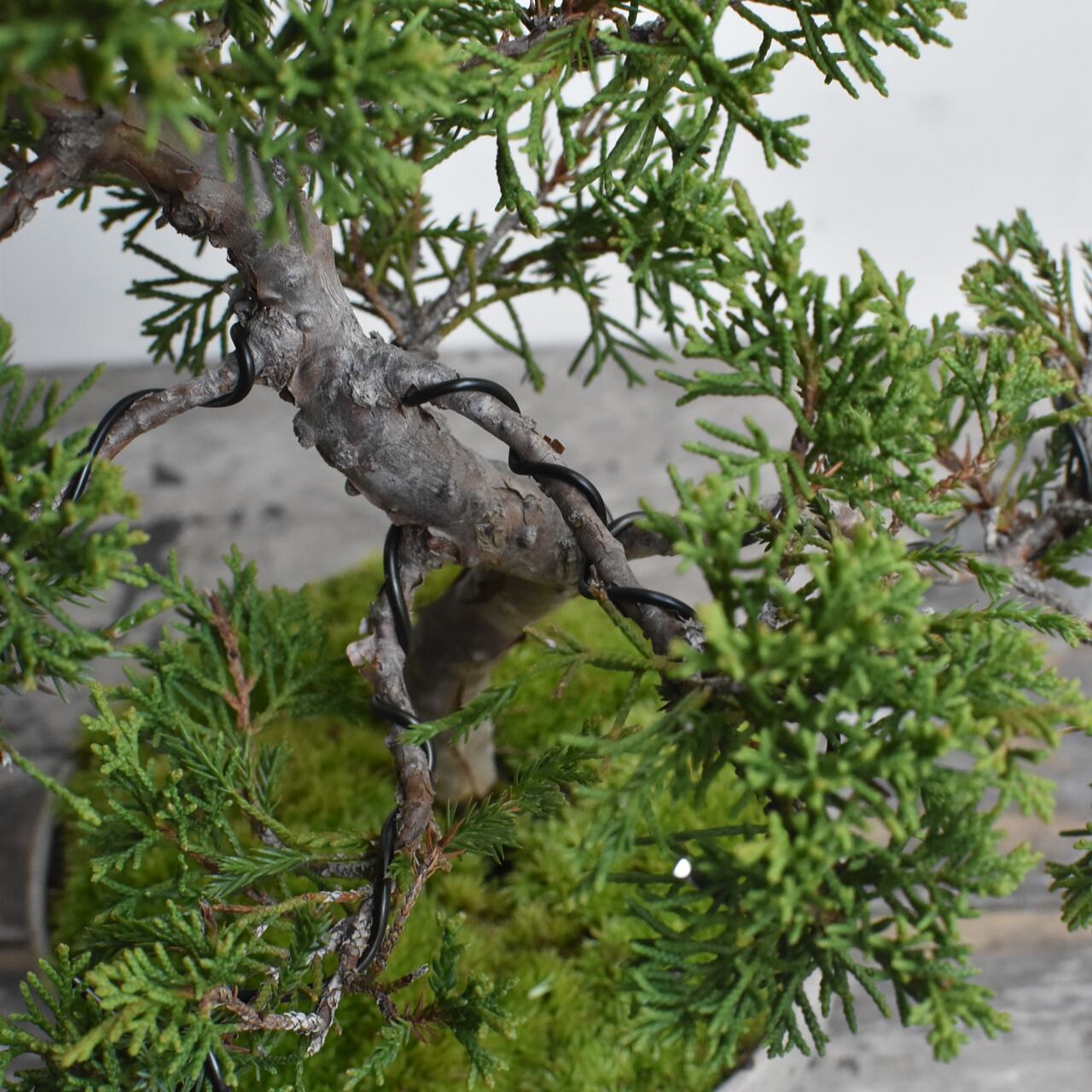 曲付けされた幹が一旦完成しているので、小さいながらも古木感や生命力を味わうことができる一品です。まだまだ枝葉の密度は足りませんが、あなたの手で秀逸な樹にしてあげてください。掲載写真6枚目のように枝にアルミ線がかけてある状態で、未だ固まっておりませんのでご注意ください。