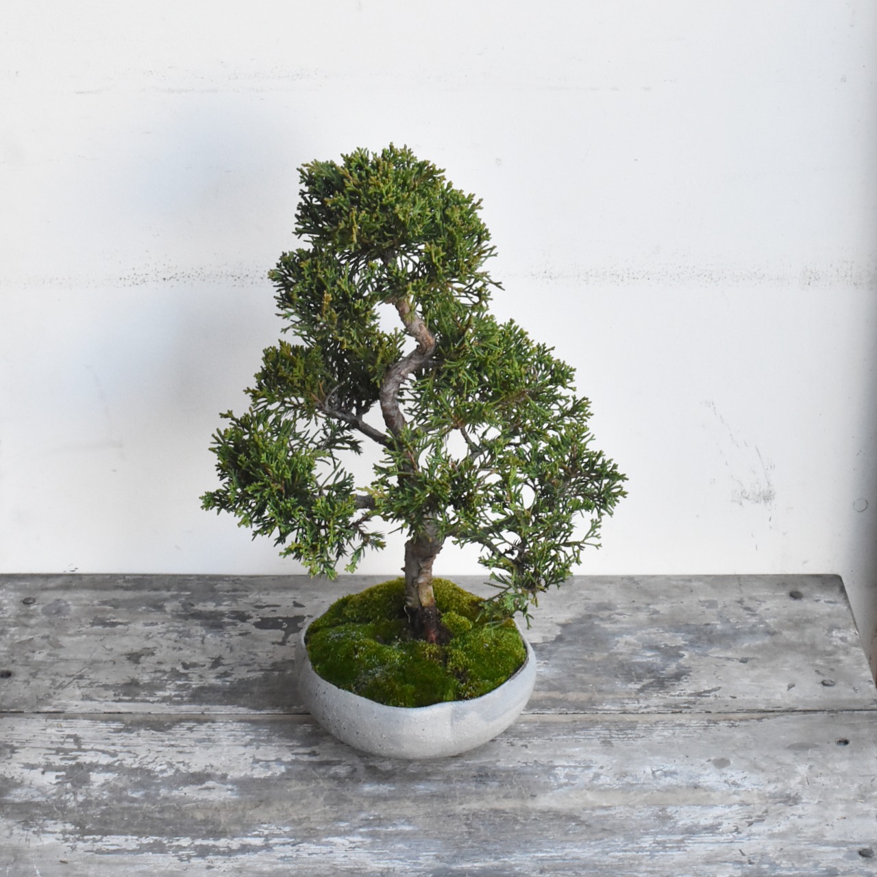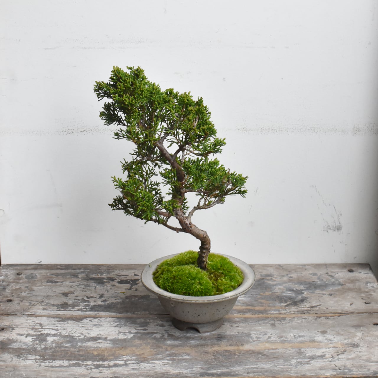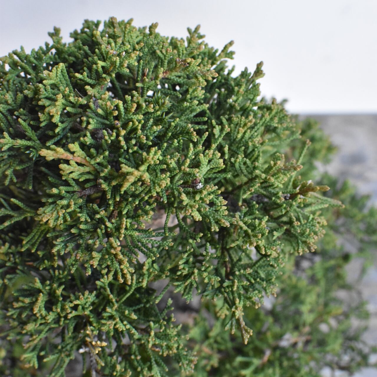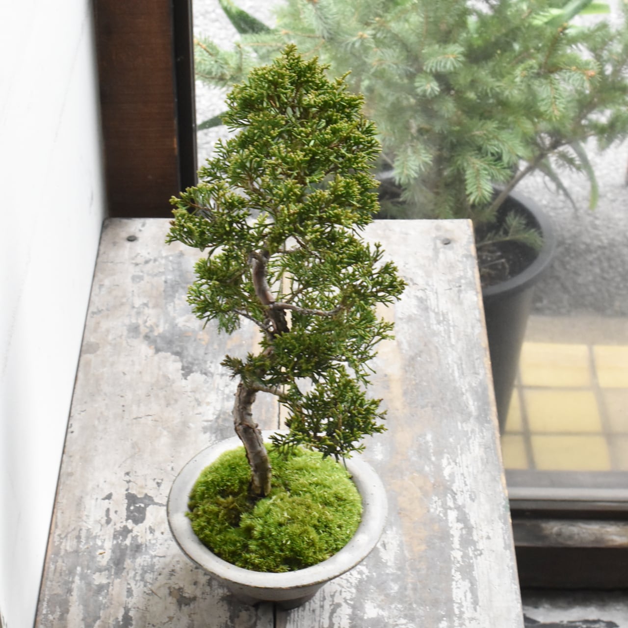 学術名はミヤマビャクシンといい、これを盆栽の世界ではシンパクと呼びます。真柏は強い曲付けにも耐え、様々な樹形を作り易いため、松に並び盆栽趣向の神髄ともいえる存在です。