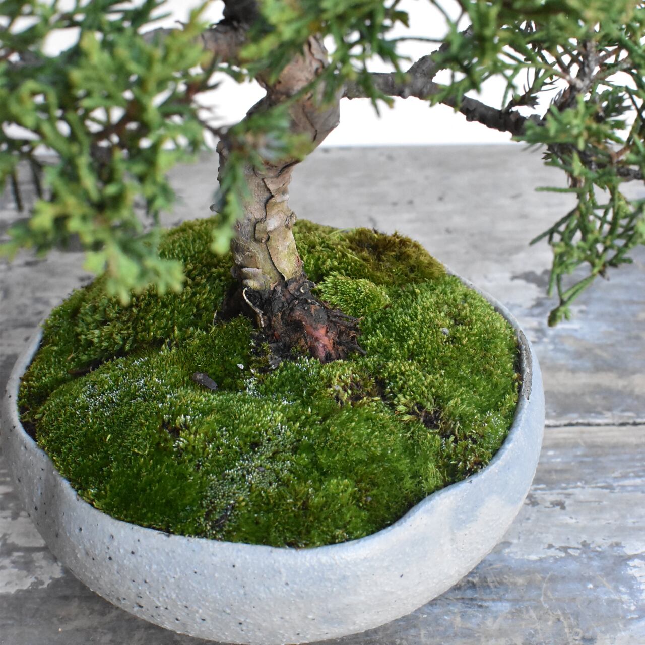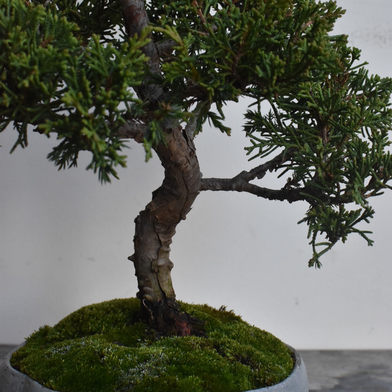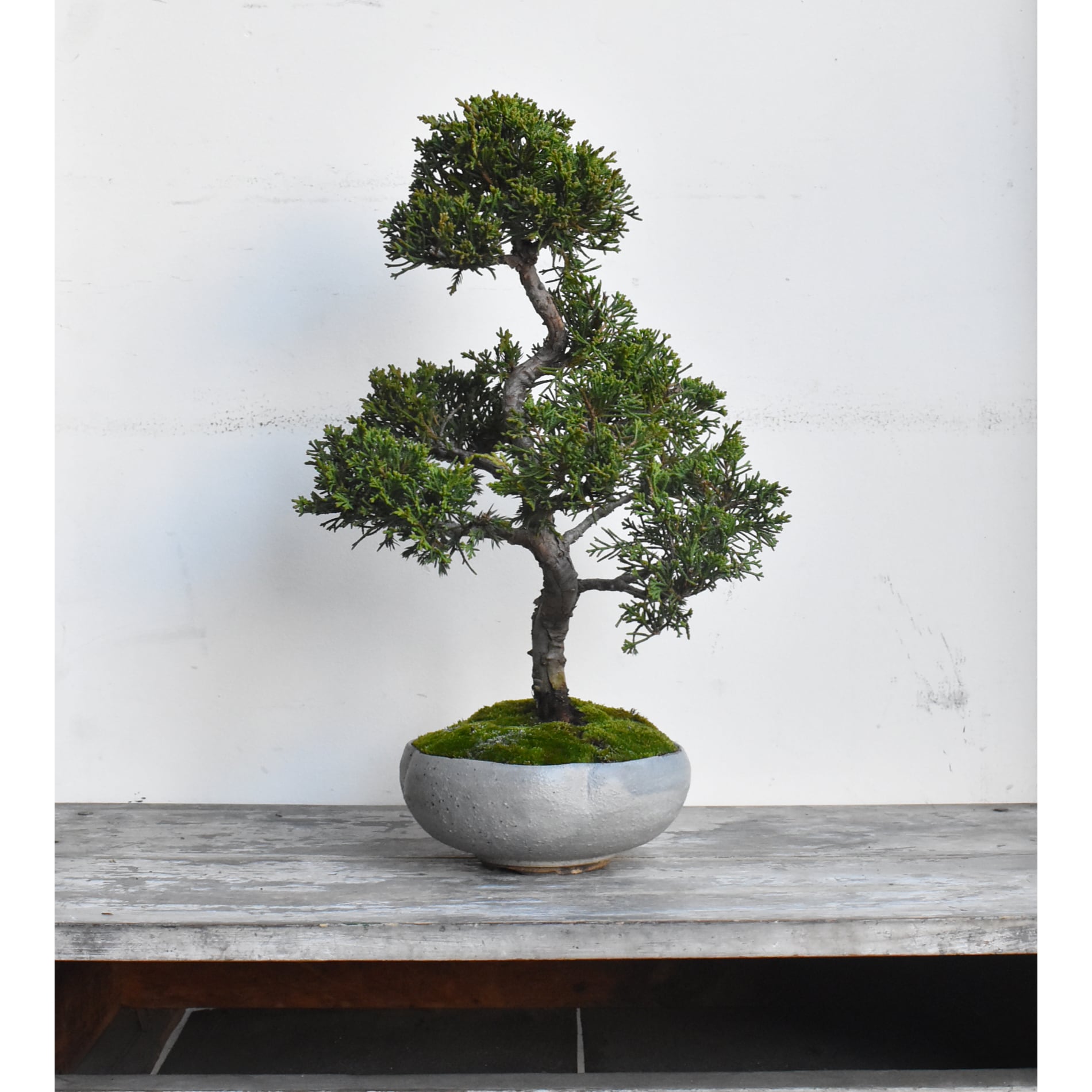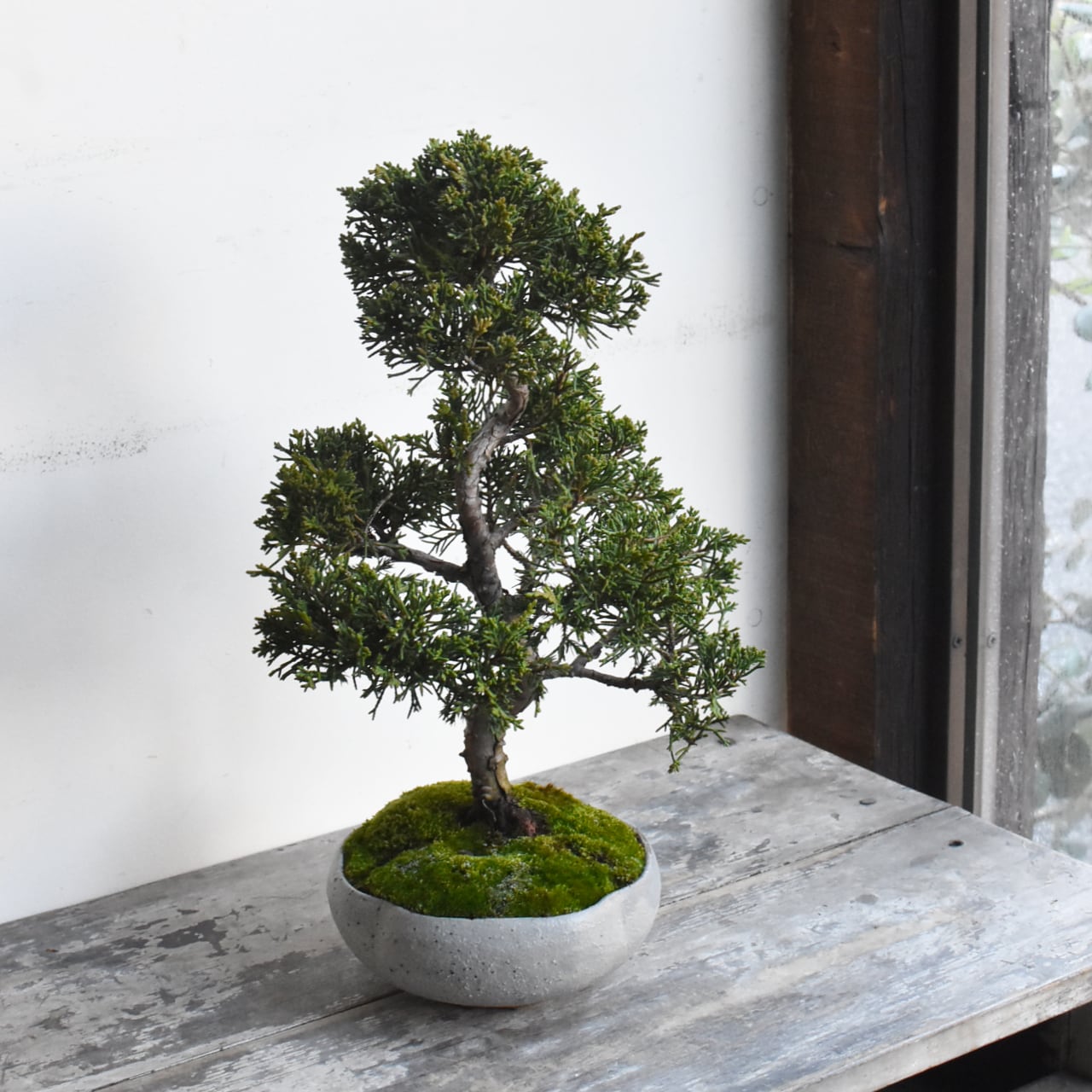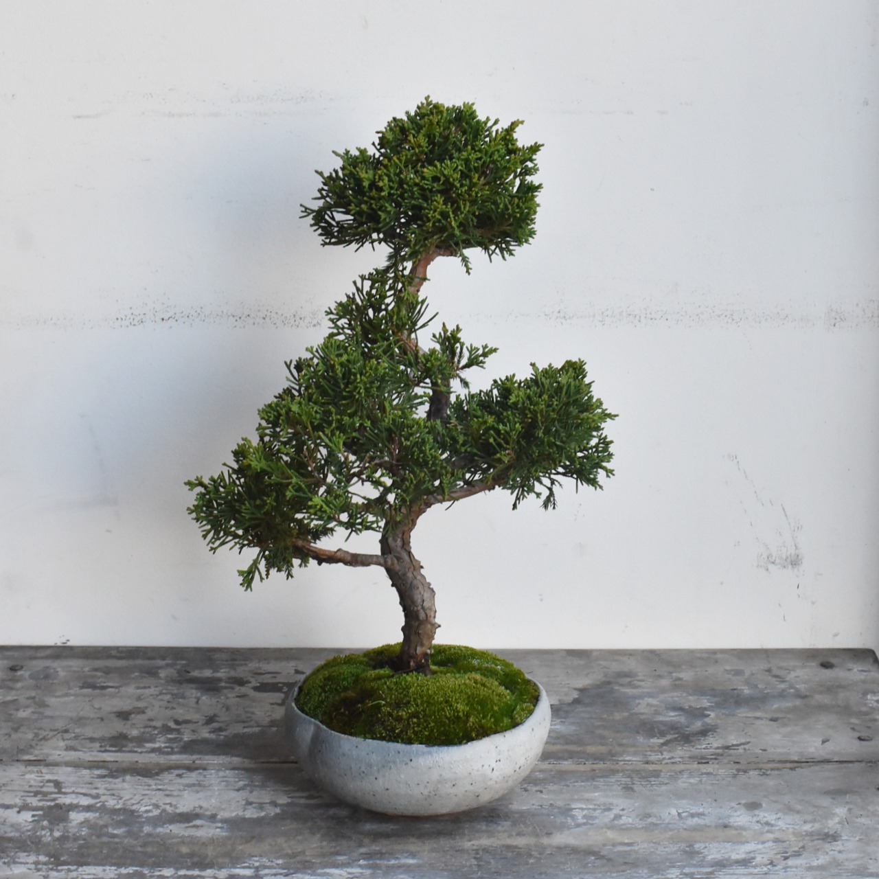学術名はミヤマビャクシンといい、これを盆栽の世界ではシンパクと呼びます。真柏は強い曲付けにも耐え、様々な樹形を作り易いため、松に並び盆栽趣向の神髄ともいえる存在です。