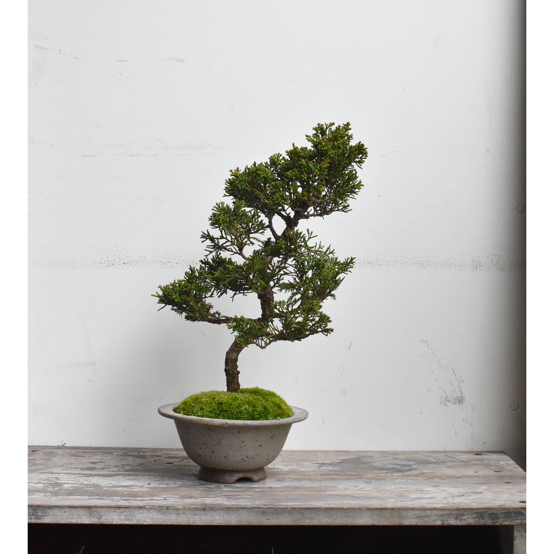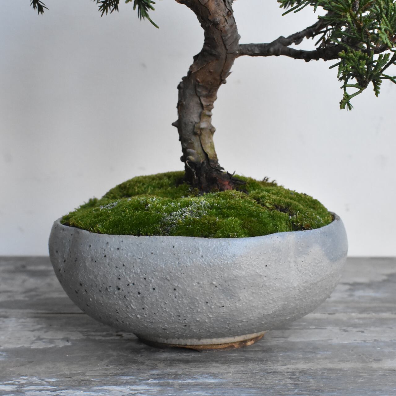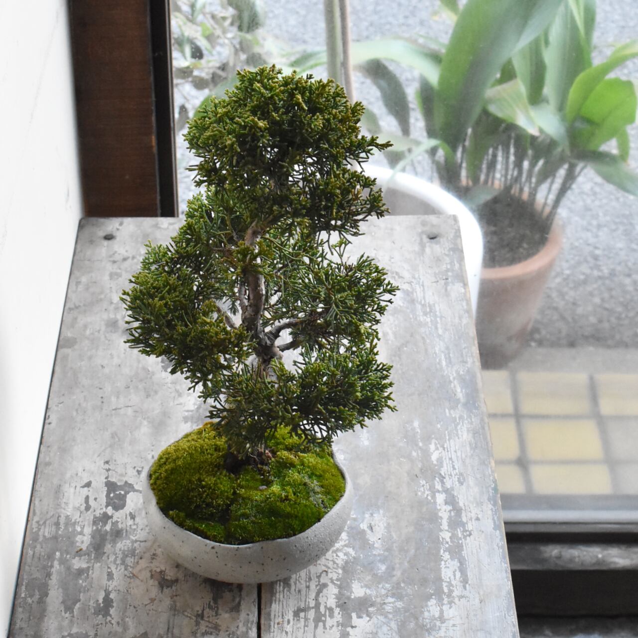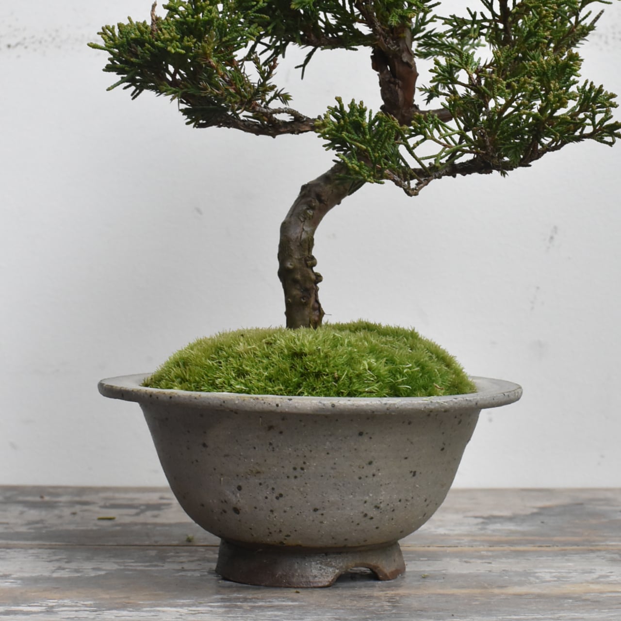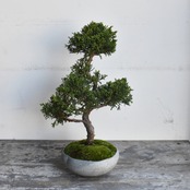 学術名はミヤマビャクシンといい、これを盆栽の世界ではシンパクと呼びます。真柏は強い曲付けにも耐え、様々な樹形を作り易いため、松に並び盆栽趣向の神髄ともいえる存在です。
