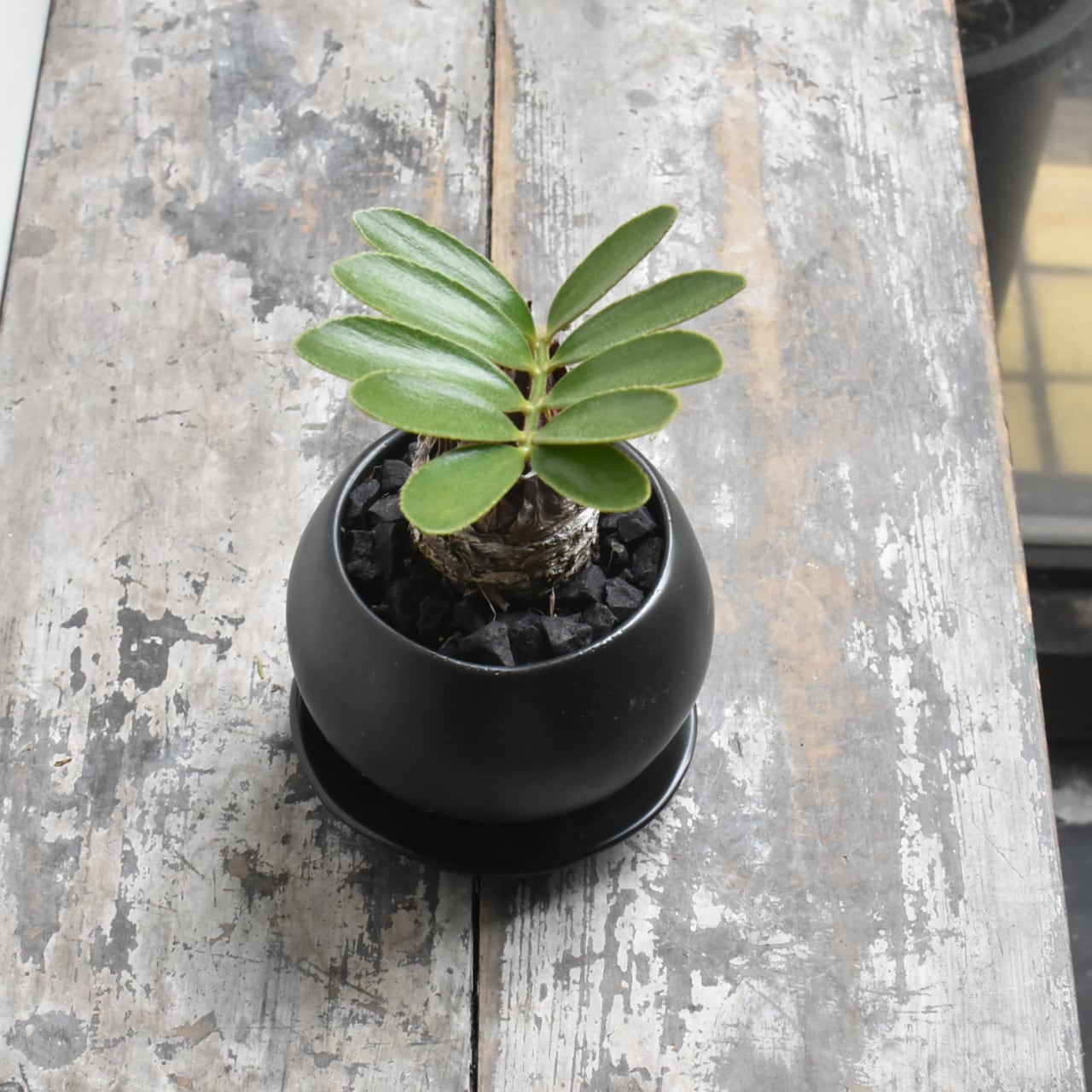 産毛の生えた丸い葉は手触りが良く、可愛らしい姿のメキシコ産のソテツです。管理は比較的簡単ですが、よく日に当てることで充実した株に生長します。この株は小鉢で締めて栽培された株で、幹が太いにもかかわらず小さな葉なので、まるで盆栽のよう。