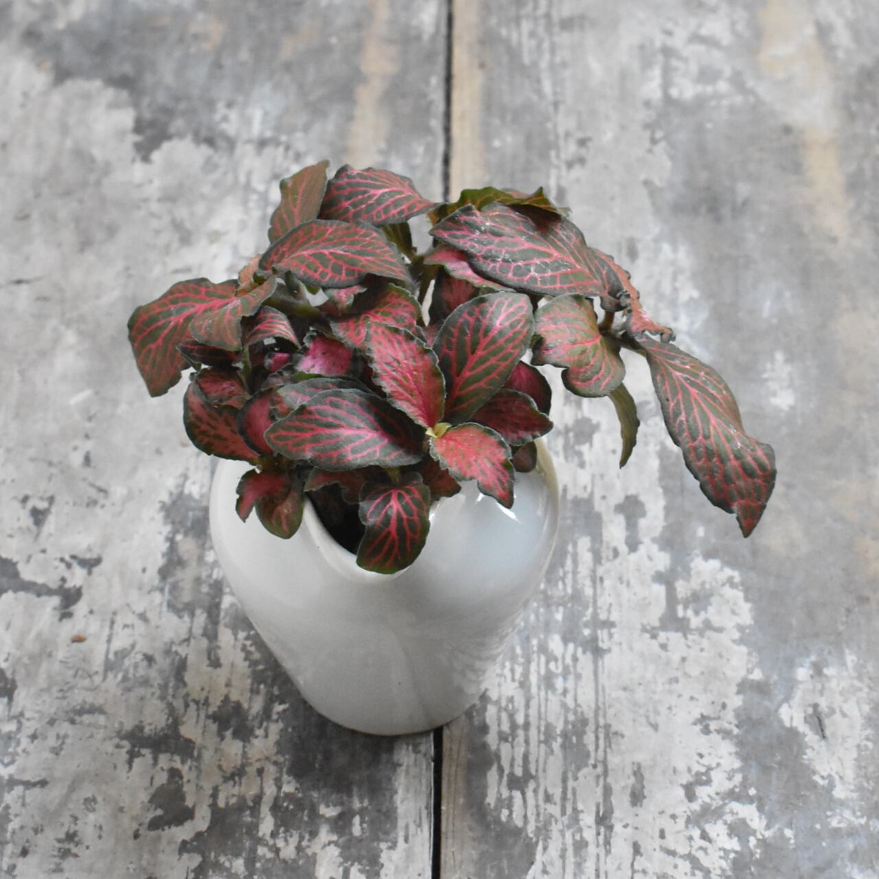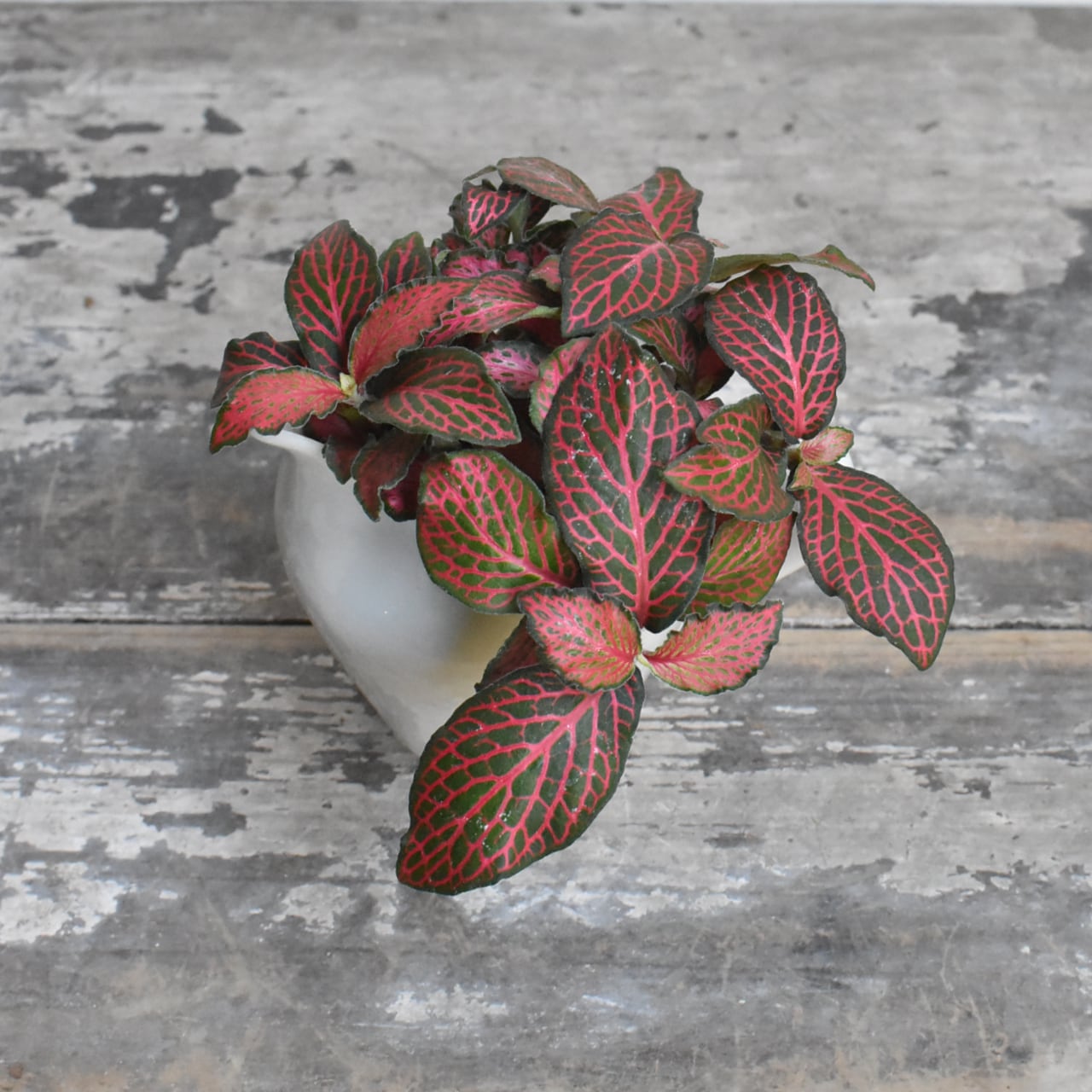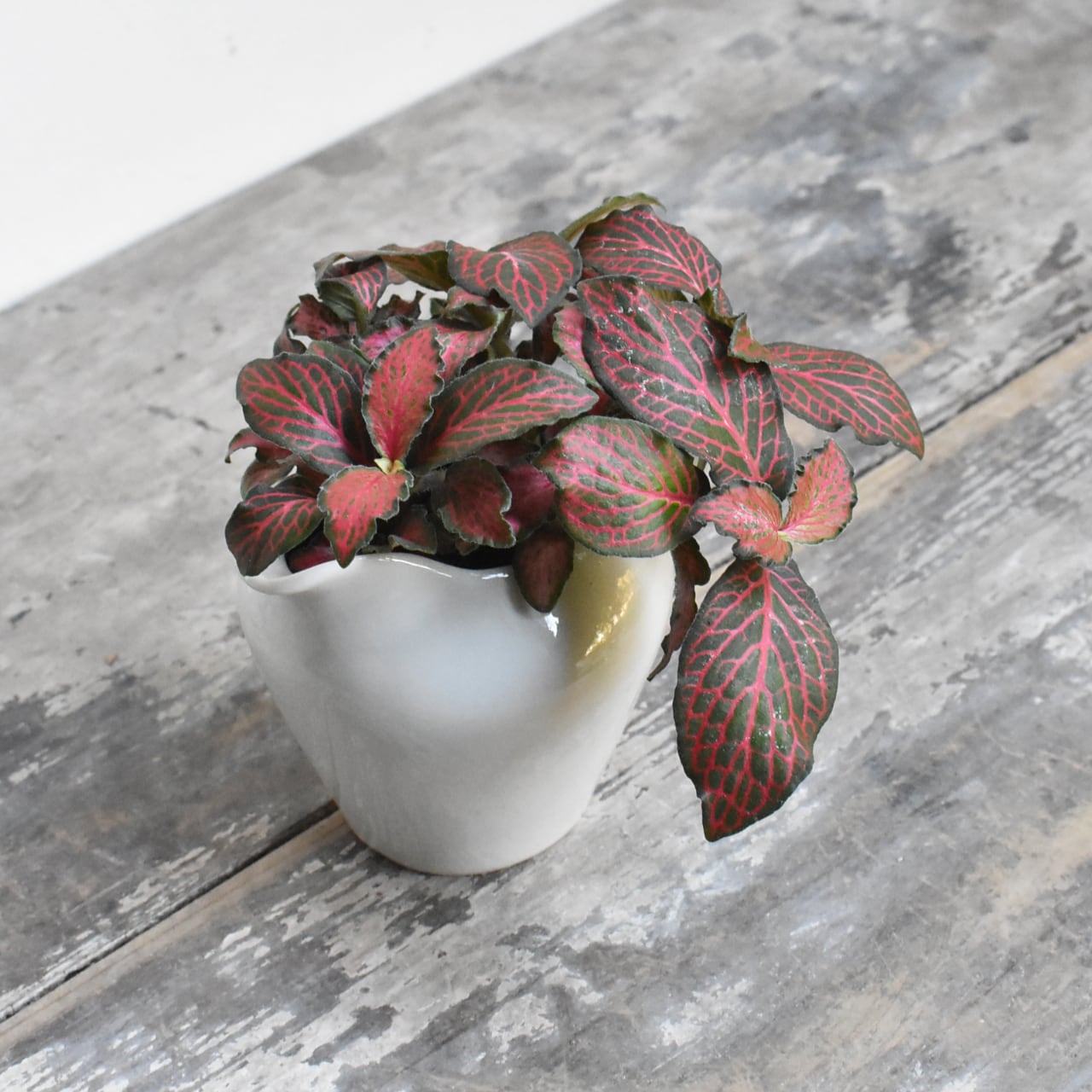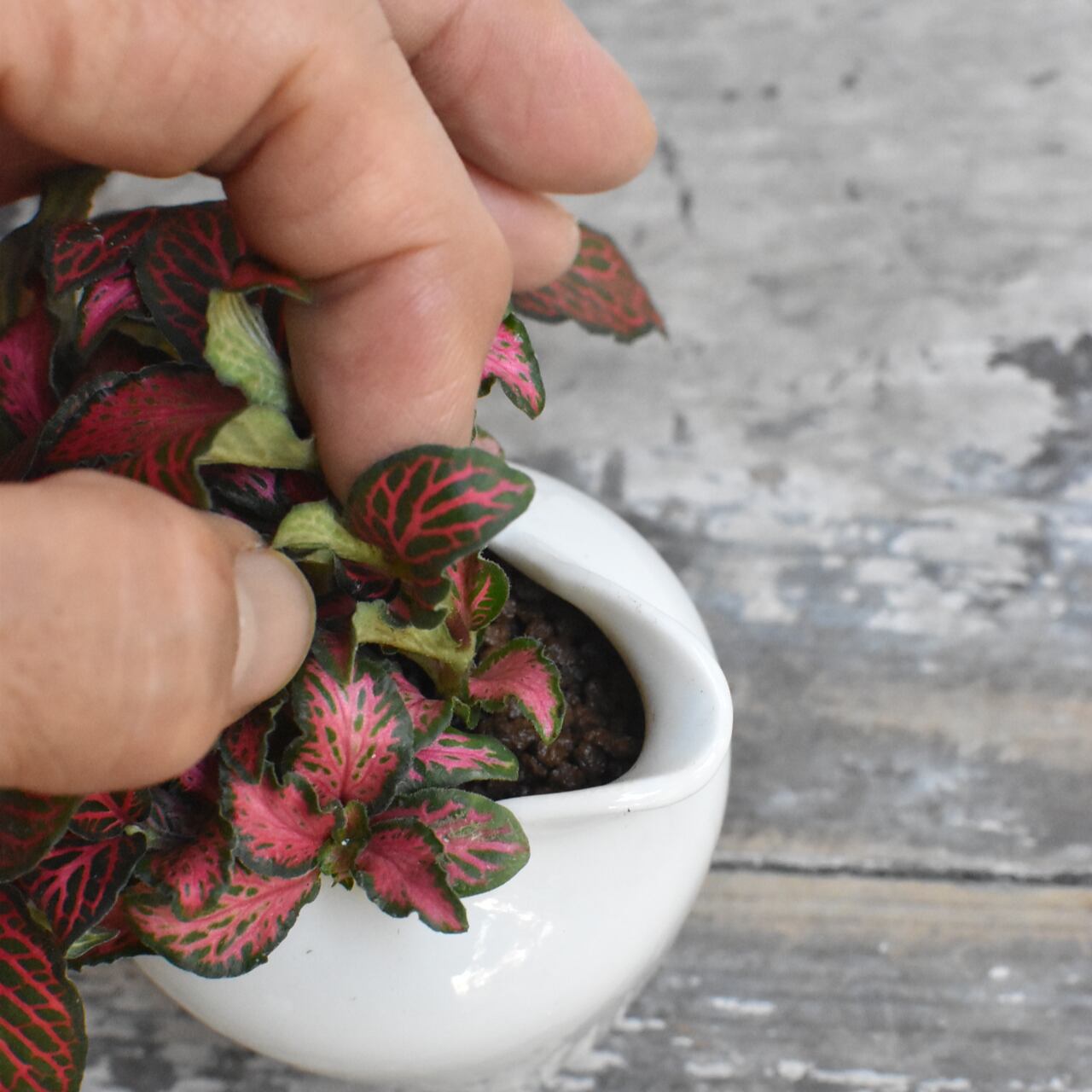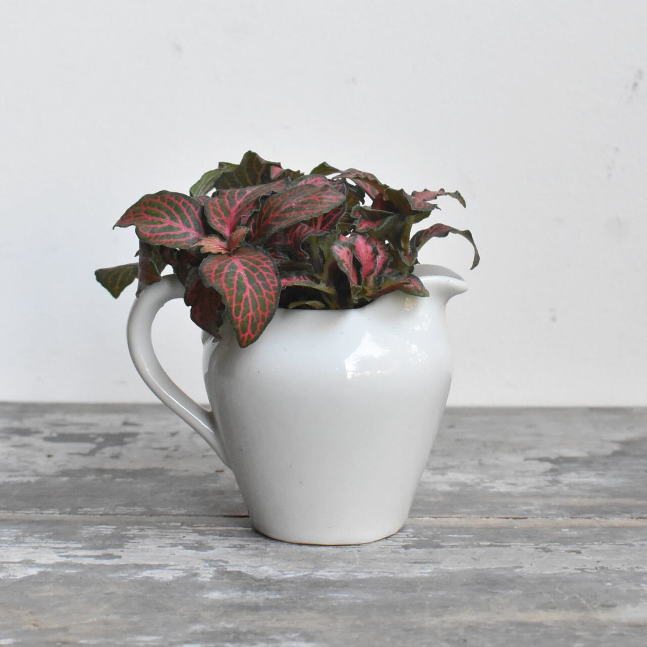湿度の高い林床に自生しているため、木漏れ日程度の光と、キリフキ等で湿度を保つことが美しさを維持するコツです。水抜き穴を開けたフレッシュミルクピッチャーに植え込みました。清潔感のある一鉢なので、お茶をいただくときにテーブル上に移動して、華やかさを添えてみてはいかがでしょうか。