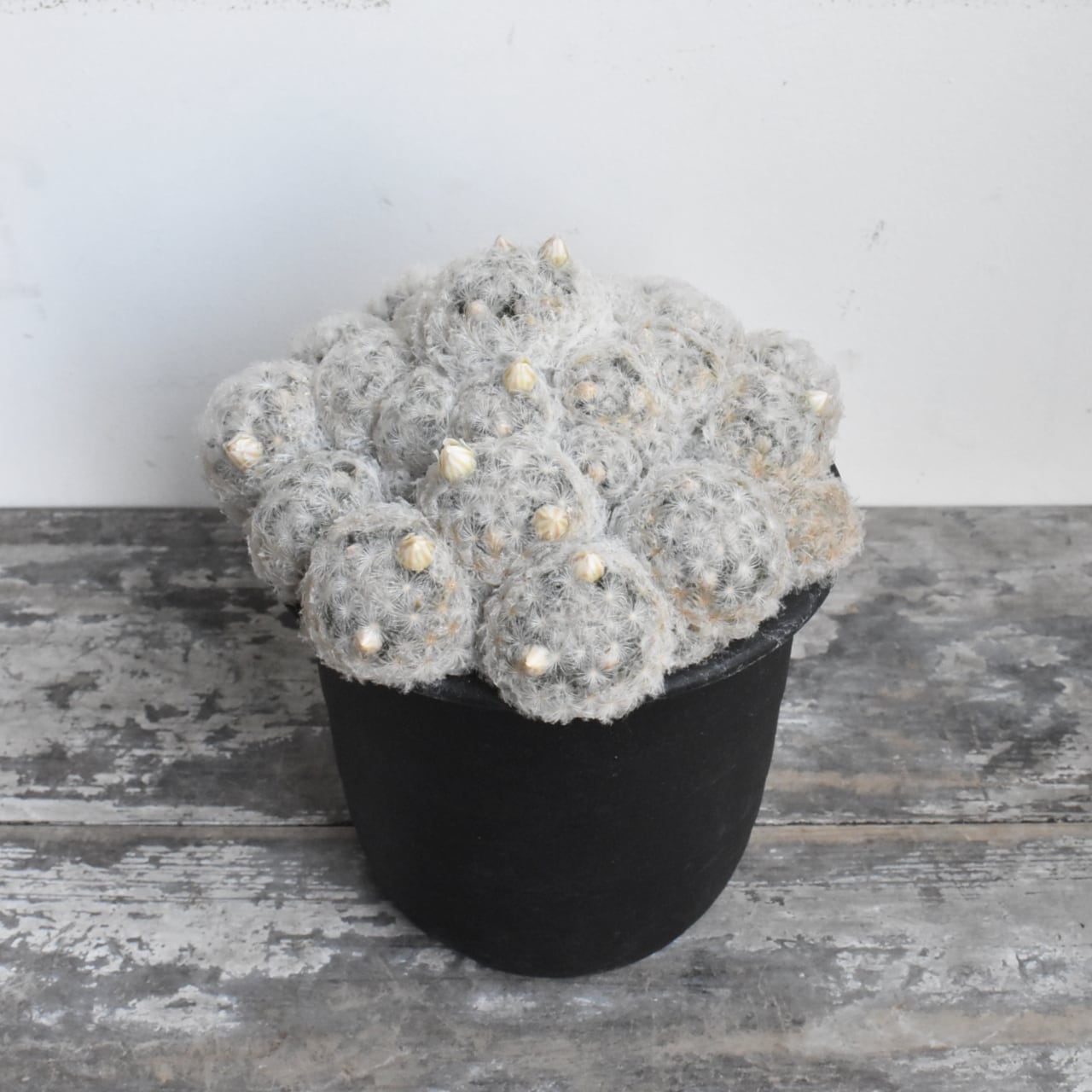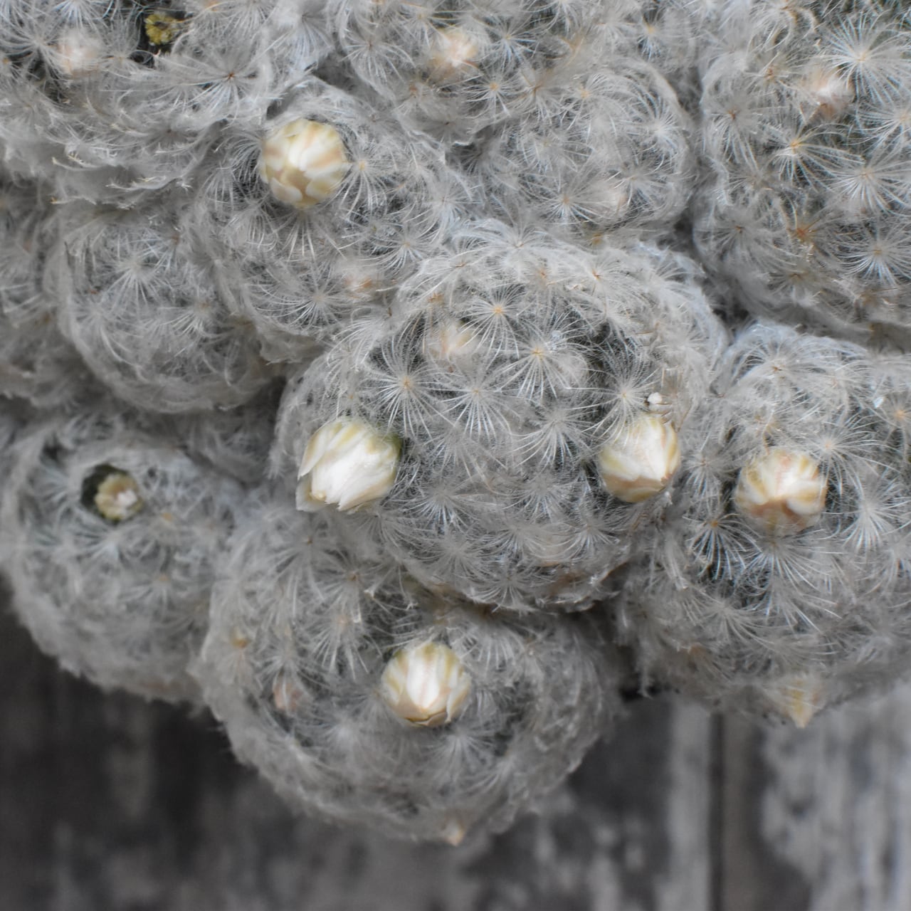 触れてもチクチクしない真綿のような棘に覆われた品種。棘をよけながら花が上がってきます。幻想的な白のグラデーションが魅力的。直射日光ができるだけ長時間あたる場所での管理を心がけて、トゲの密度を保ってください。