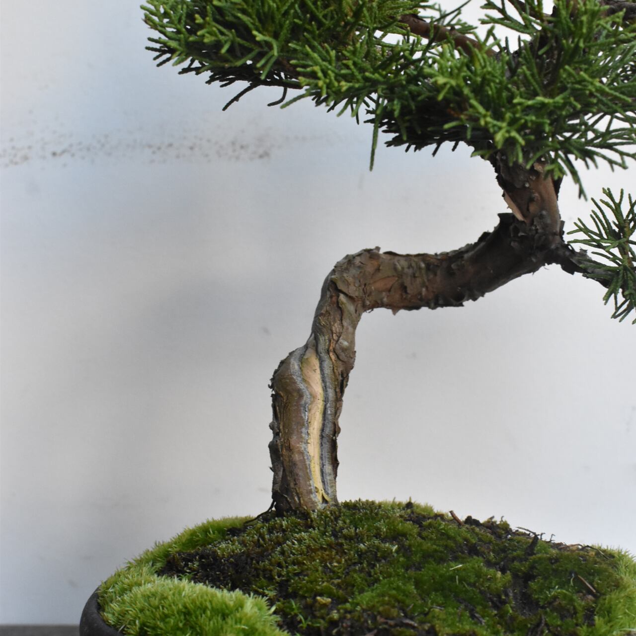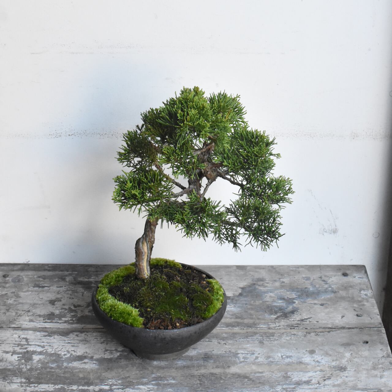 学術名はミヤマビャクシンといい、これを盆栽の世界ではシンパクと呼びます。真柏は強い曲付けにも耐え、様々な樹形を作り易いため、松に並び盆栽趣向の神髄ともいえる存在です。