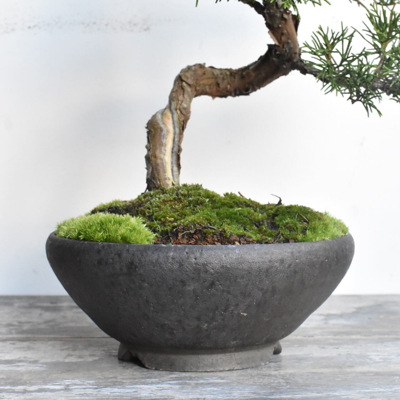 幹の太さはまだ足りませんが曲付けされた幹とその立ち上がりが上品な一鉢です。控えめながらも施された舎利が木に風格を持たせています。まだまだ枝葉の密度は足りませんが、あなたの手で秀逸な樹にしてあげてください。8枚目の写真のように高台にカケがあります。ご了承ください。