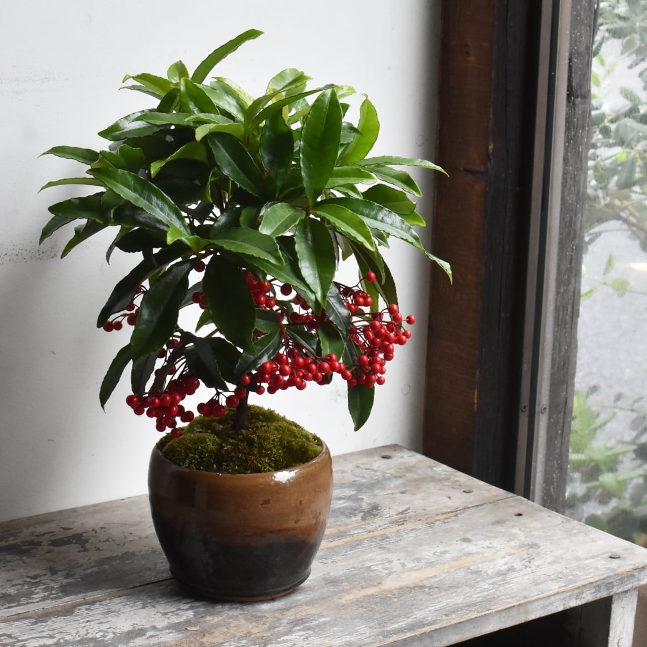 お正月の縁起物としてなじみ深い万両ですが、こちらはオランダで育種された洋種万両です。矮性の草姿に、茎がしなるほどたわわに実る豊かな姿がお正月を盛り上げてくれます。初夏に咲く花も可愛らしく、1年中楽しむことができる一鉢です。