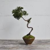 まだ若い木ですが、大きく曲げられた幹が味わい深い一品です。まだまだ枝葉の密度は足りませんが、あなたの手で秀逸な樹にしてあげてください。