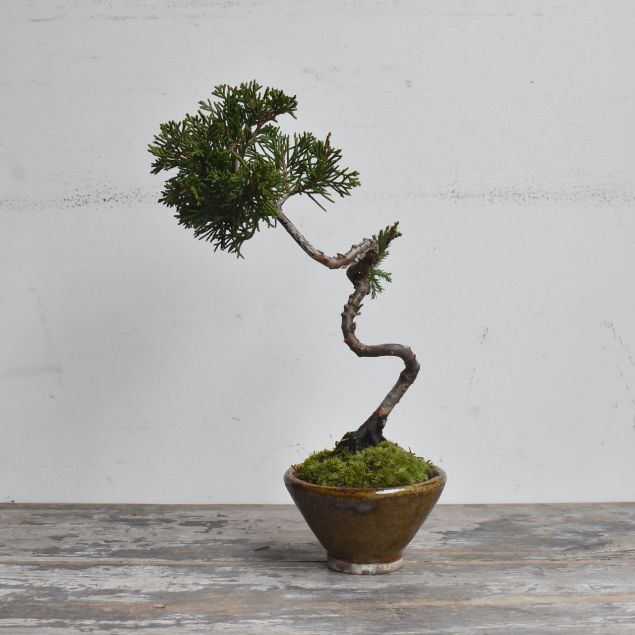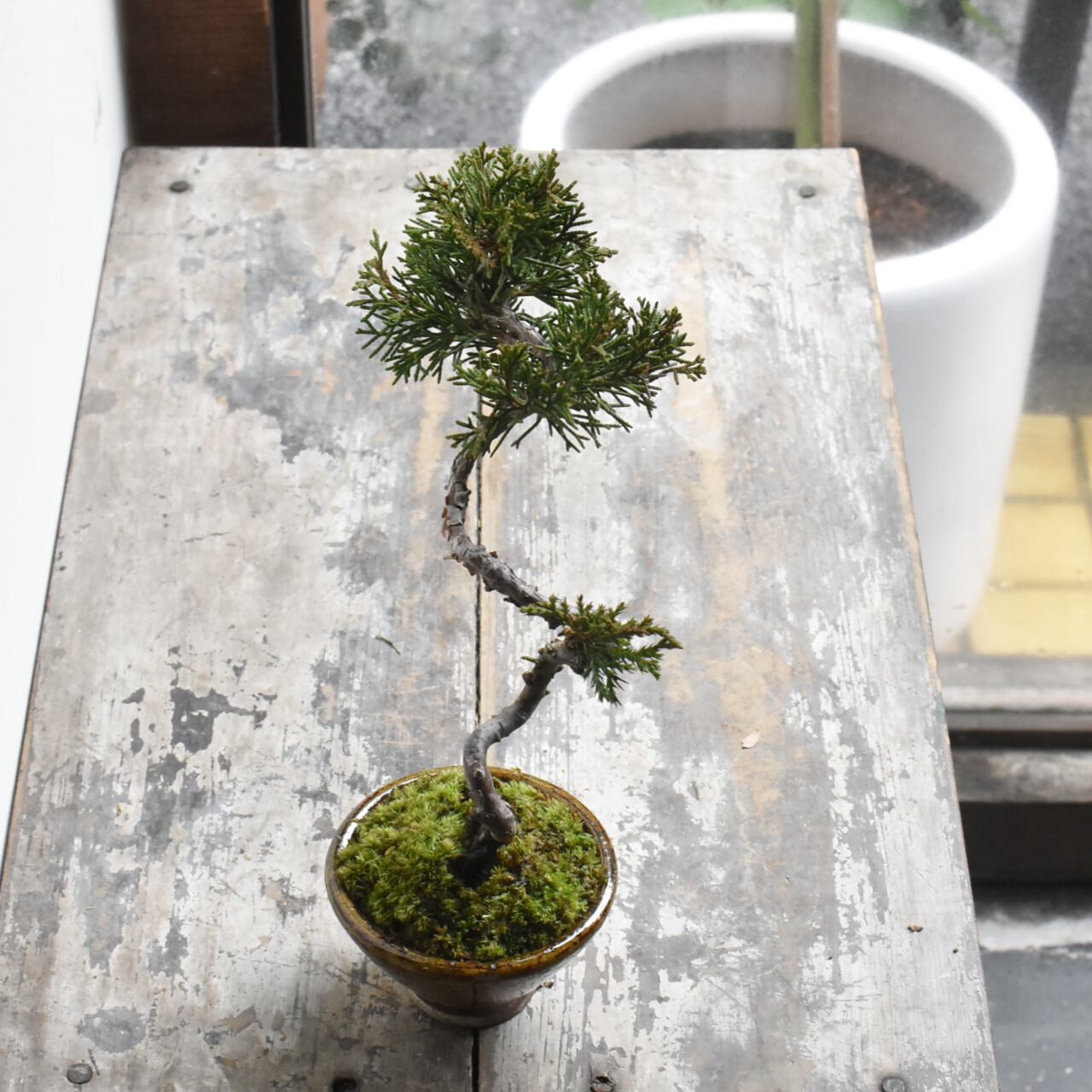 学術名はミヤマビャクシンといい、これを盆栽の世界ではシンパクと呼びます。真柏は強い曲付けにも耐え、様々な樹形を作り易いため、松に並び盆栽趣向の神髄ともいえる存在です。