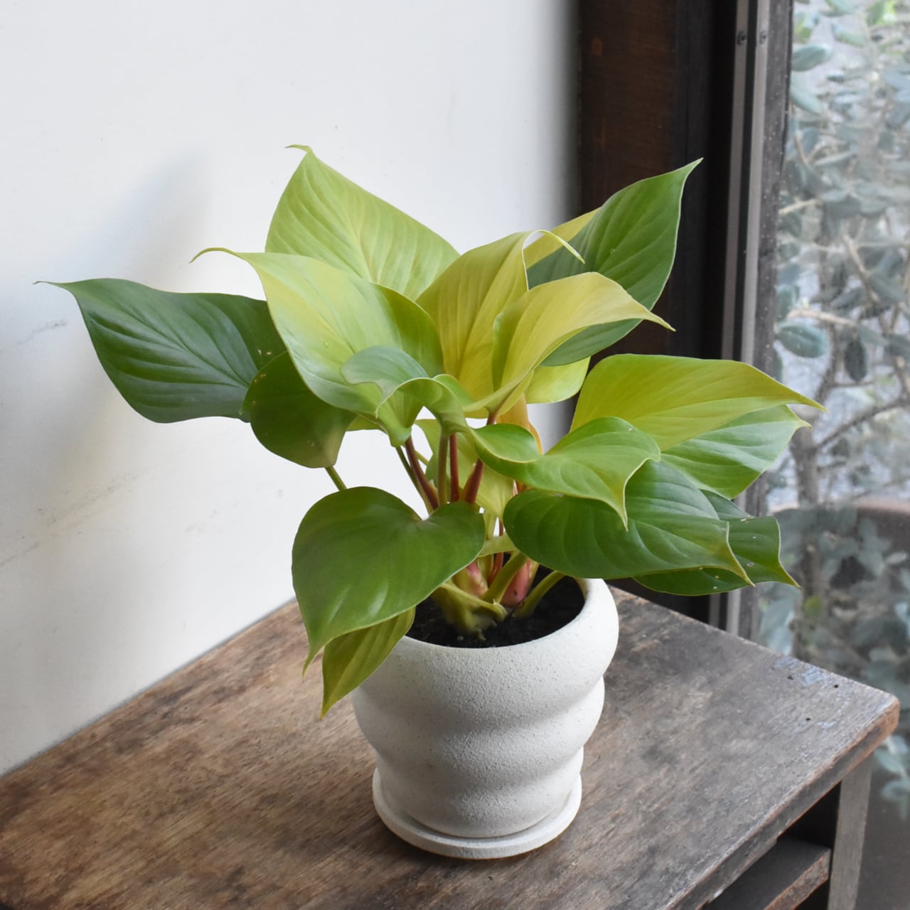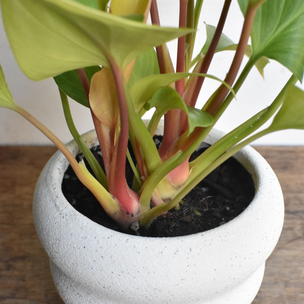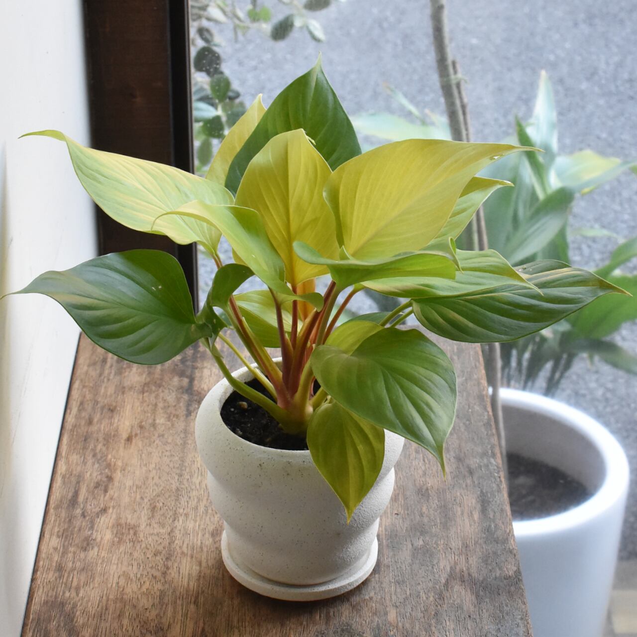 新葉は淡いオレンジ色。その後淡いグリーンに、そして古葉はミドルグリーンに。背が高くなりずらくコンパクトにまとまるので、テーブルグリーンにうってつけ。清潔感のある色合いなので、キッチンやダイニングテーブルなどに飾っていただくのもお勧めです。