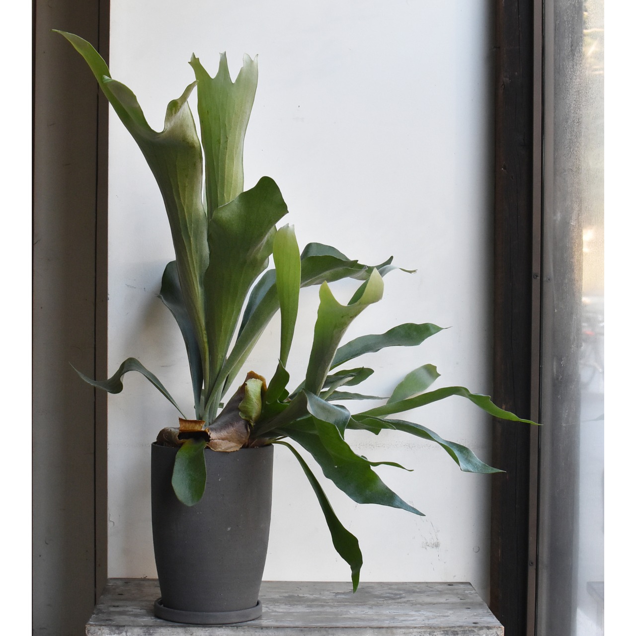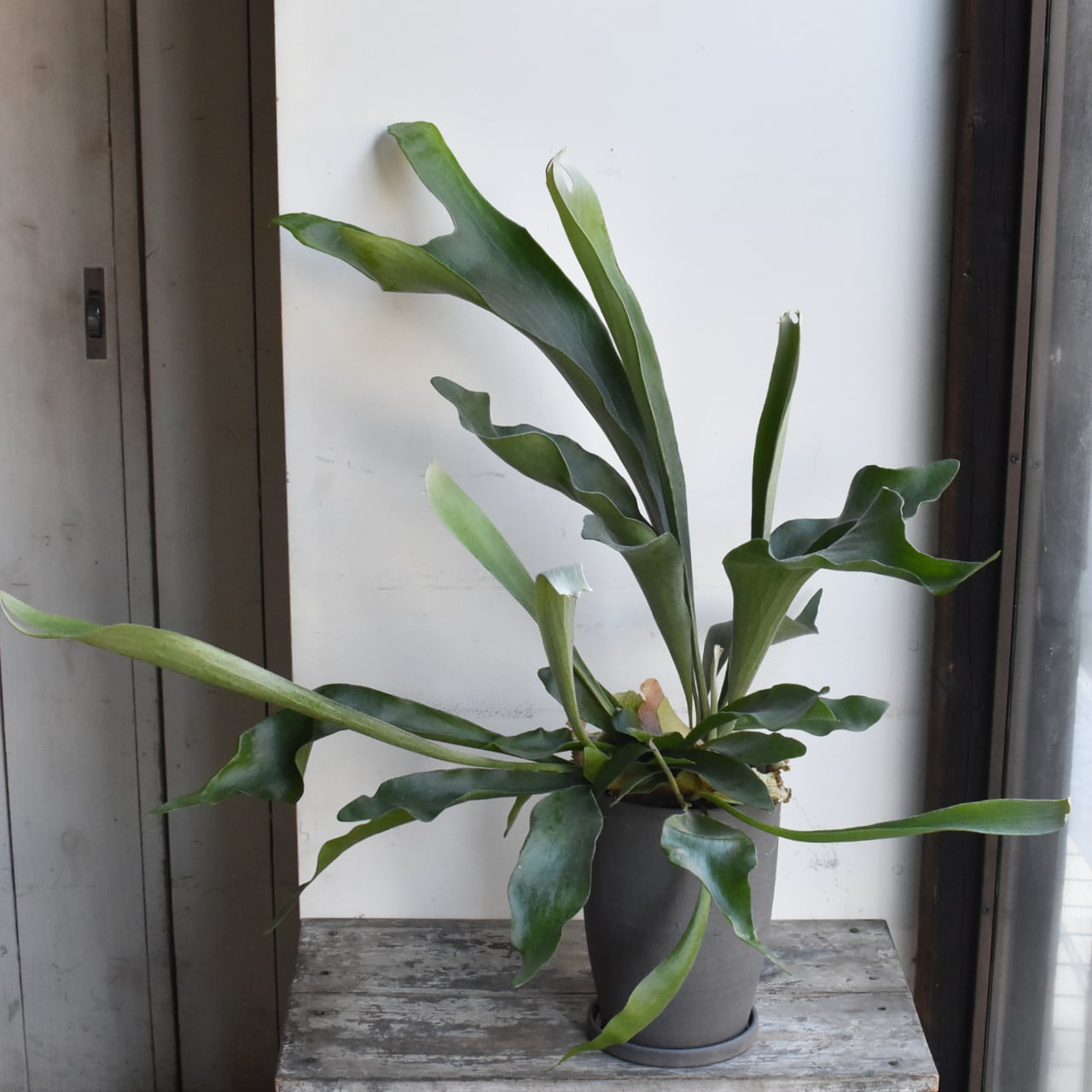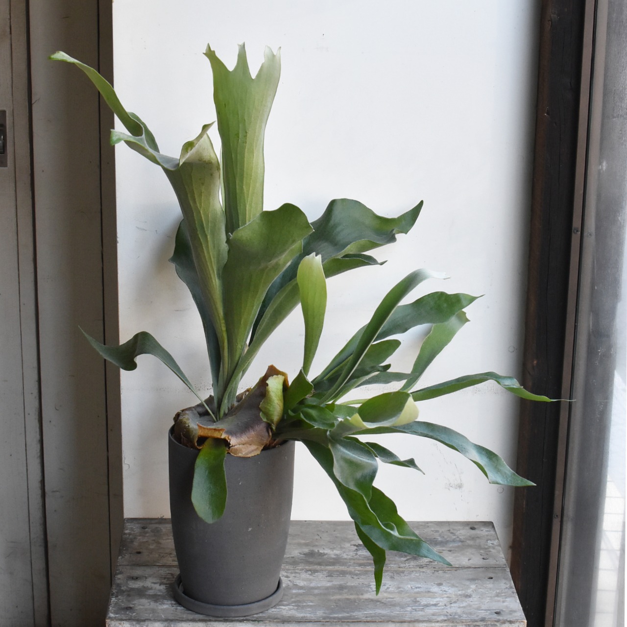 鉢から飛び出す胞子葉が美しく、鉢を飲みこむ豪快さは生命力に溢れています。