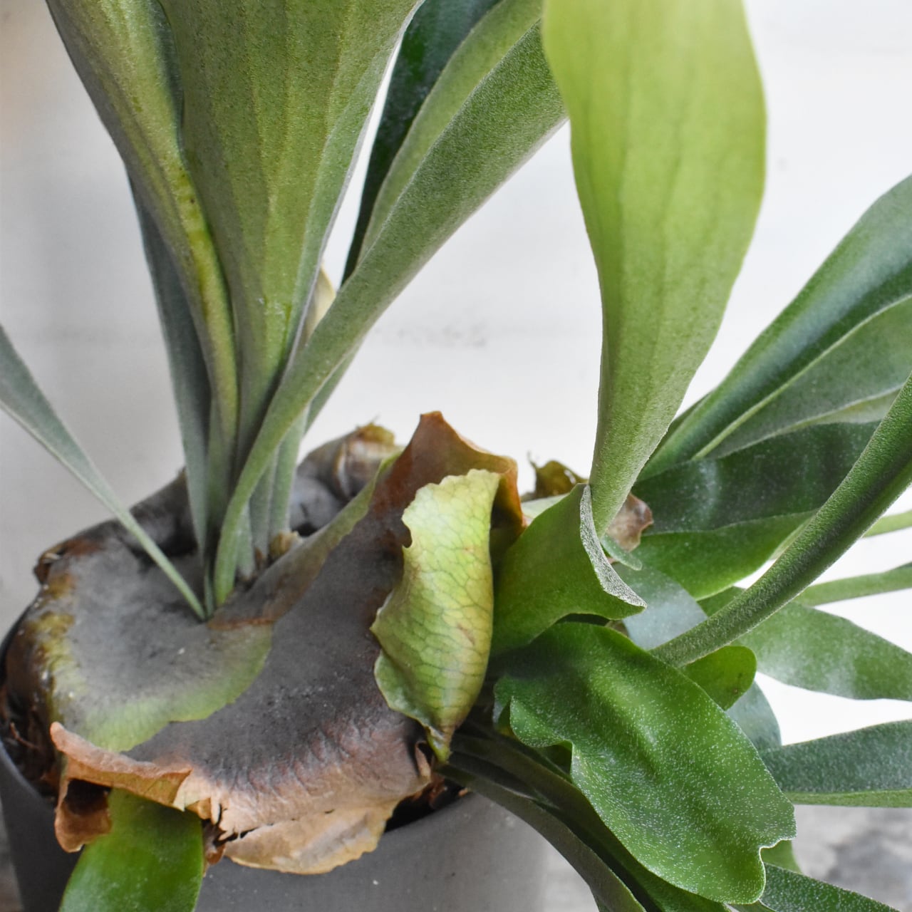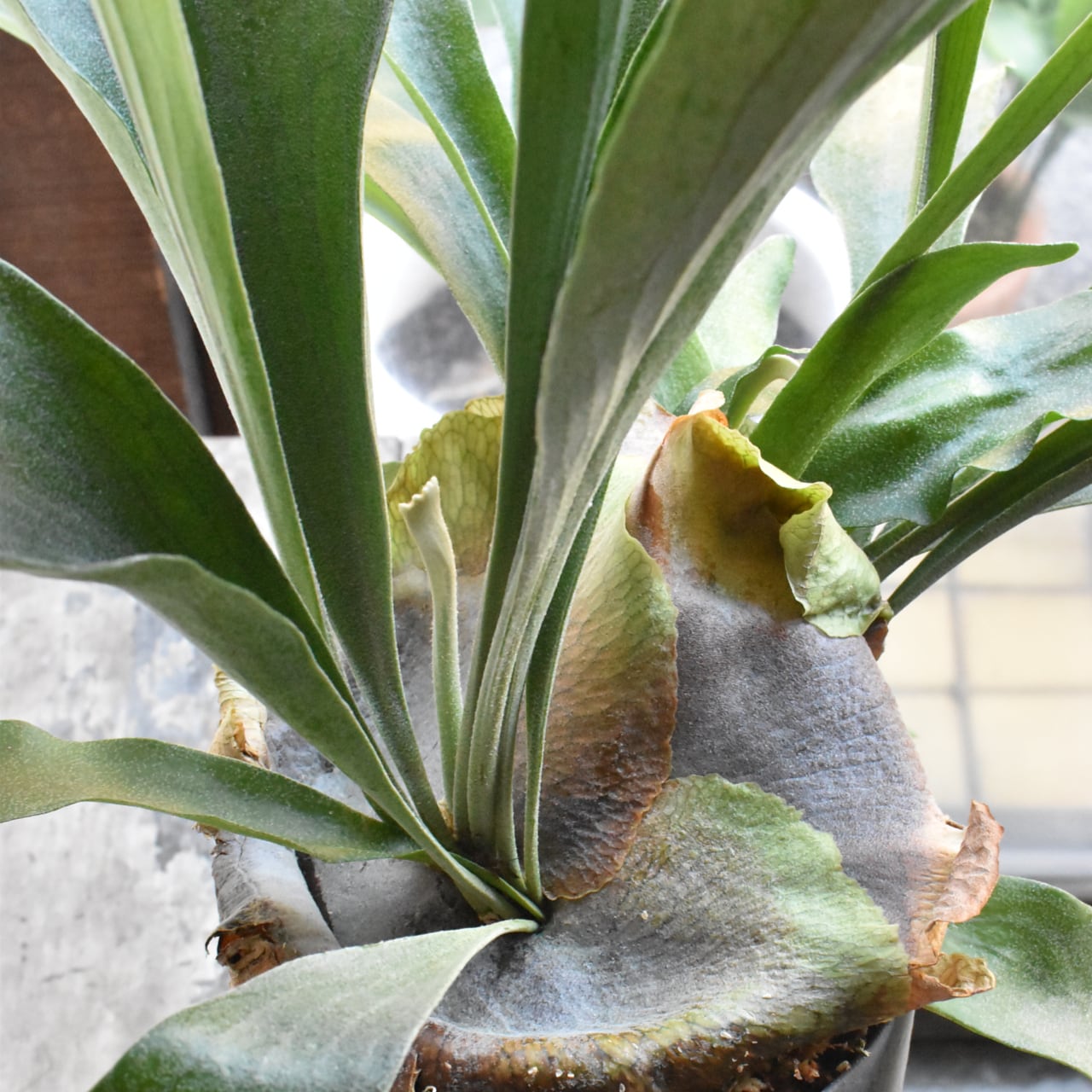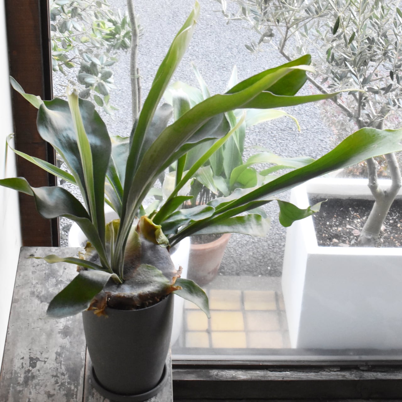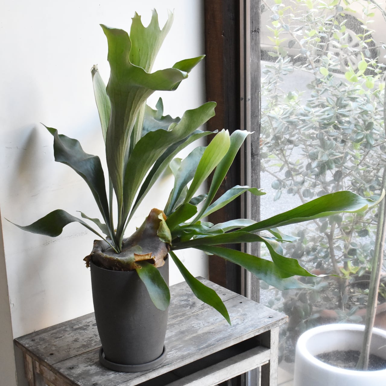 鉢から飛び出す胞子葉が美しく、鉢を飲みこむ豪快さは生命力に溢れています。