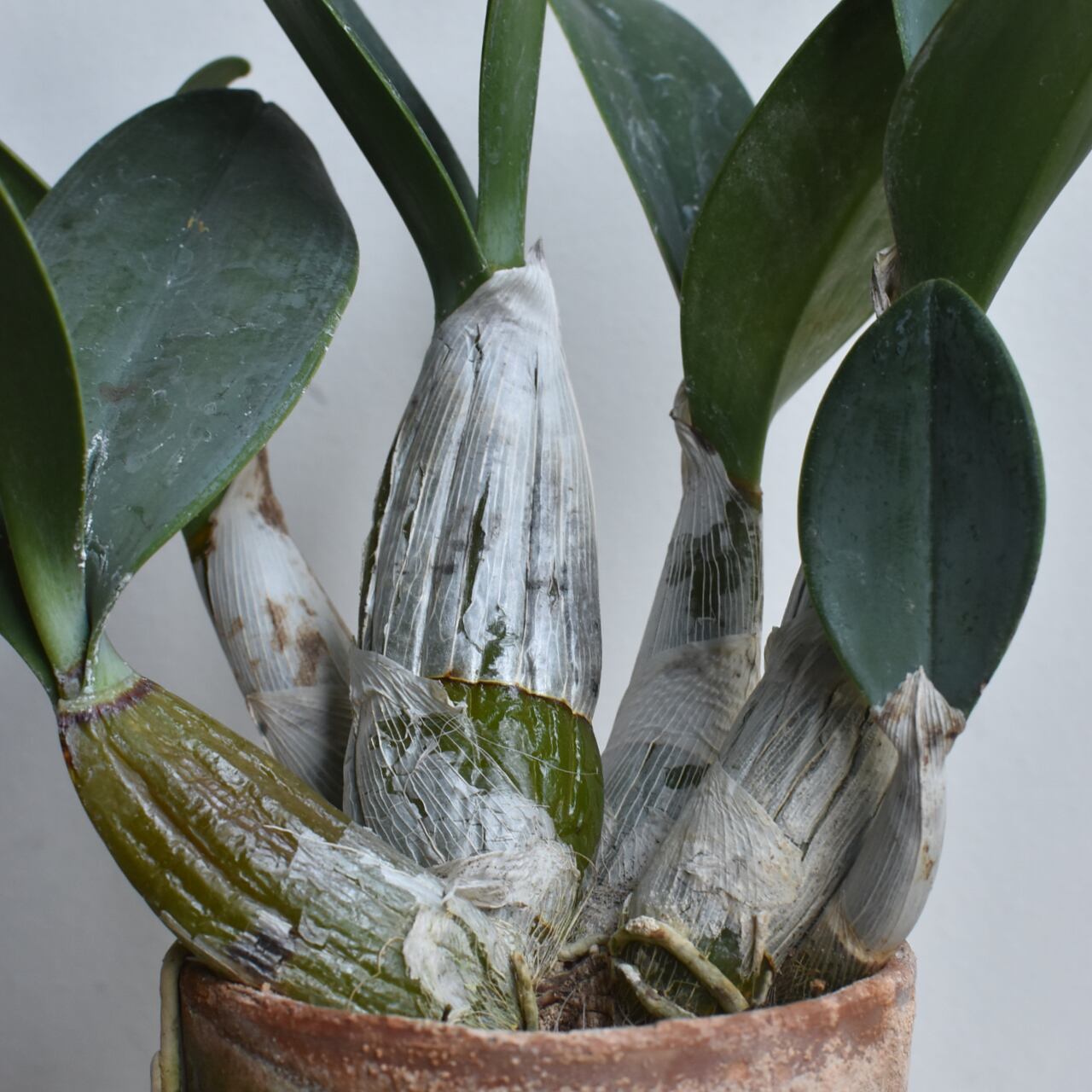 牛の角のような形をした大きなバルブが特徴の品種で、学名はデンドロビウム・スペシオーサム。これはその矮性種です。開花は冬〜春にかけてで、クリーム色の小さな花を沢山連ねて咲かせます。開花期でなくとも充分魅力的な、観葉植物として付き合える一鉢です。