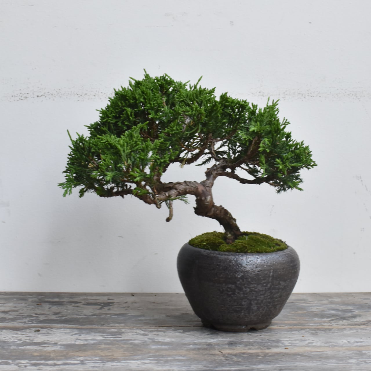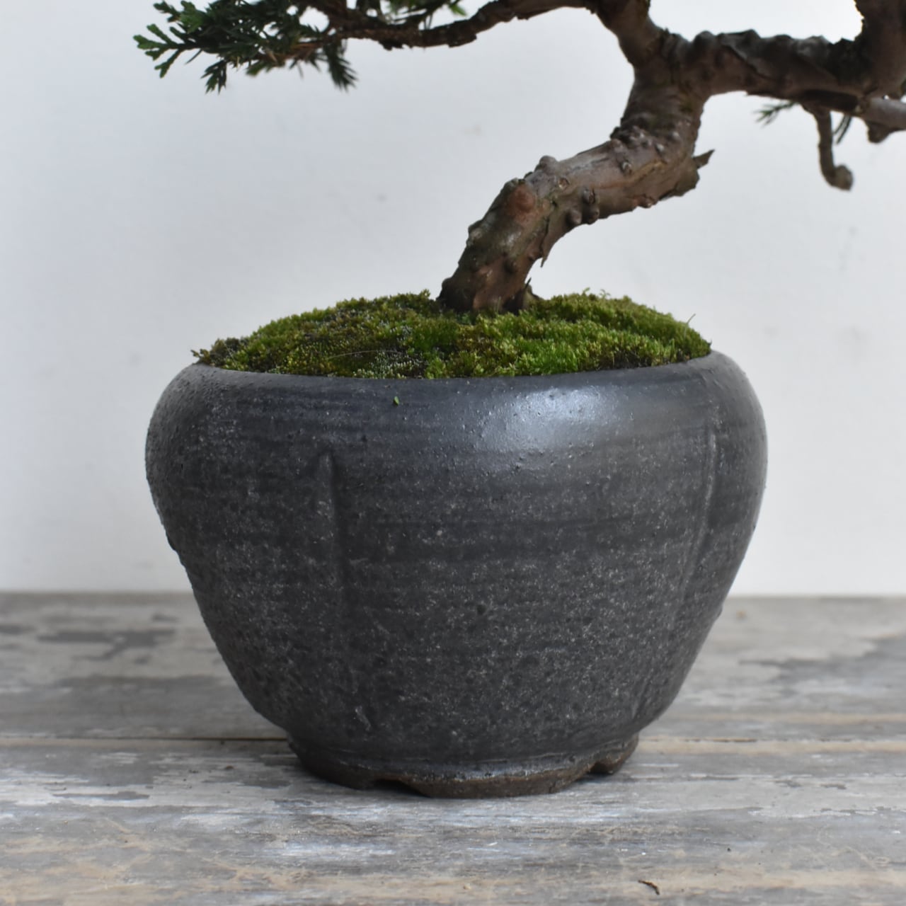 松柏盆栽の柏(カシワ)とはヒノキの仲間のことで、特に真柏は強い曲付けにも耐え様々な樹形を作り易いため、松に並び盆栽趣向の神髄ともいえる存在です。