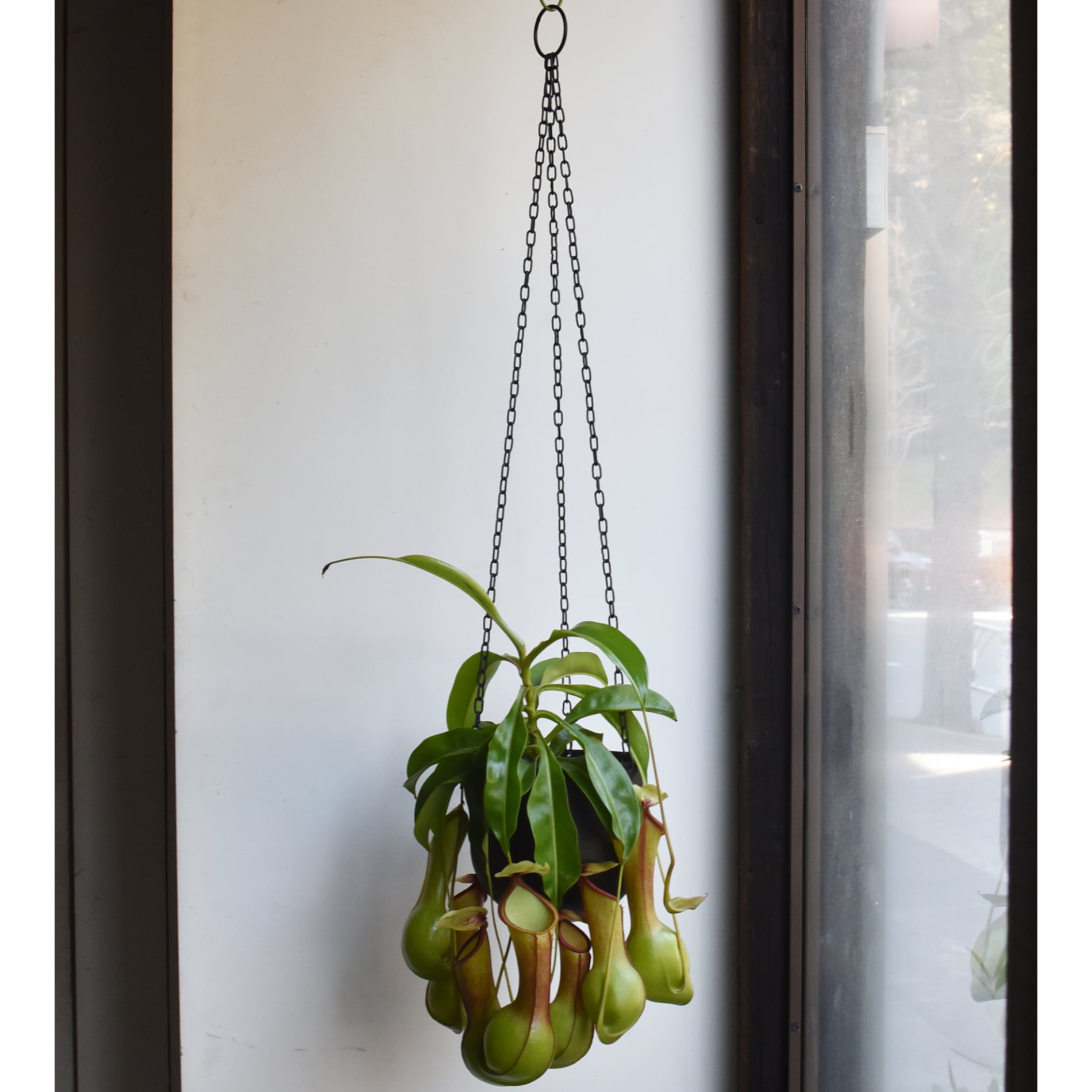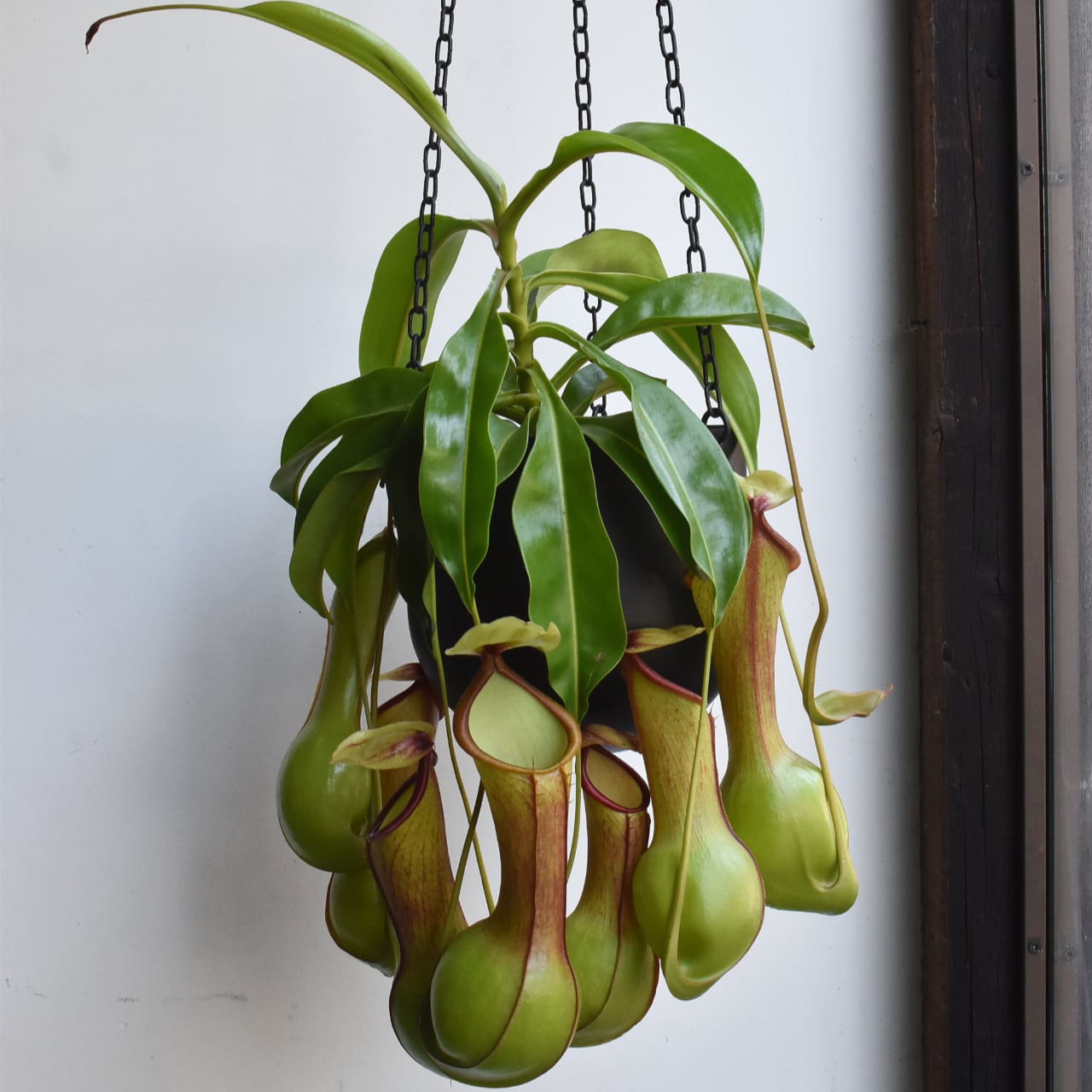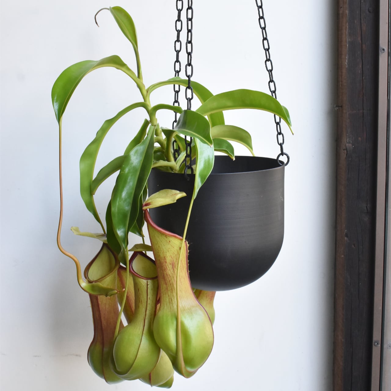 通常のアラータは赤い捕虫袋ですが、こちらは大きく膨れたヒップの部分がフレッシュグリーンでなんとも妖艶な姿です。袋のサイズも20cmほどあり迫力満点。プラスティック製培養鉢に植えた植物と金属製吊り鉢とのセット販売です。捕虫袋内の消化液は全て出した状態での発送となります。