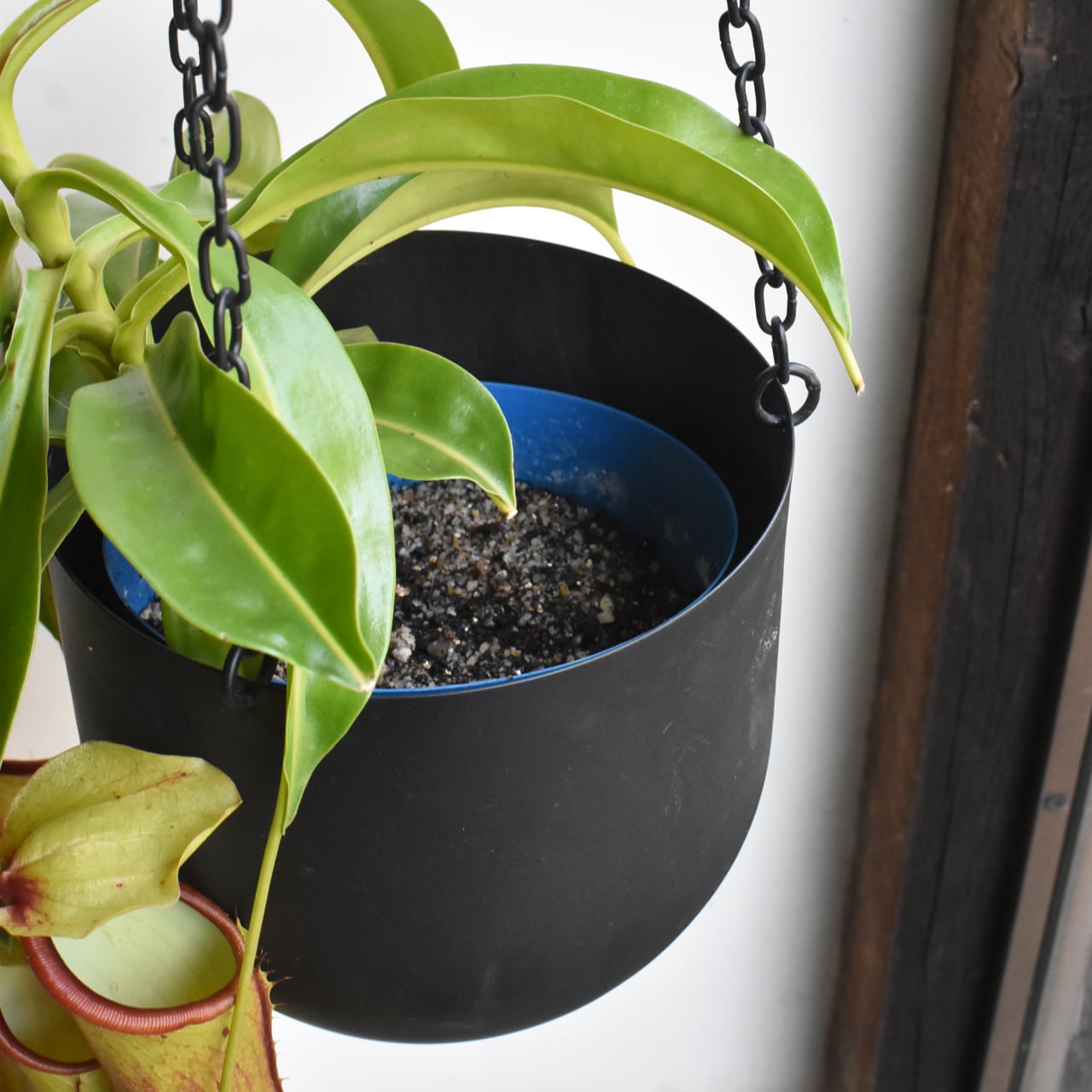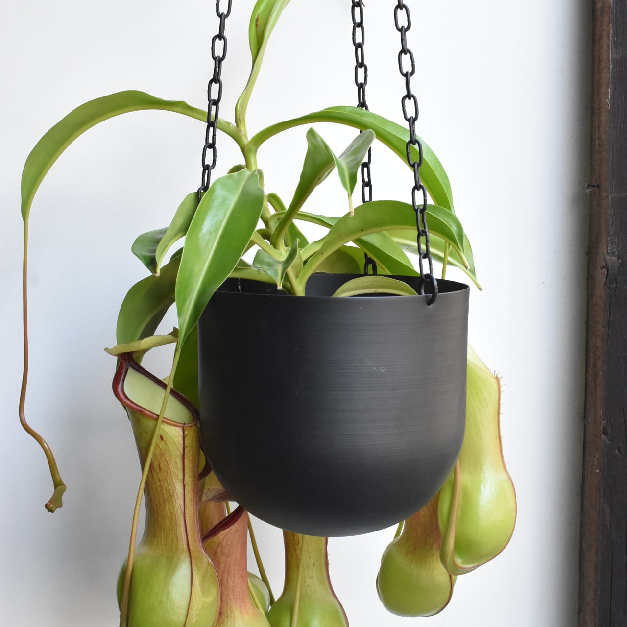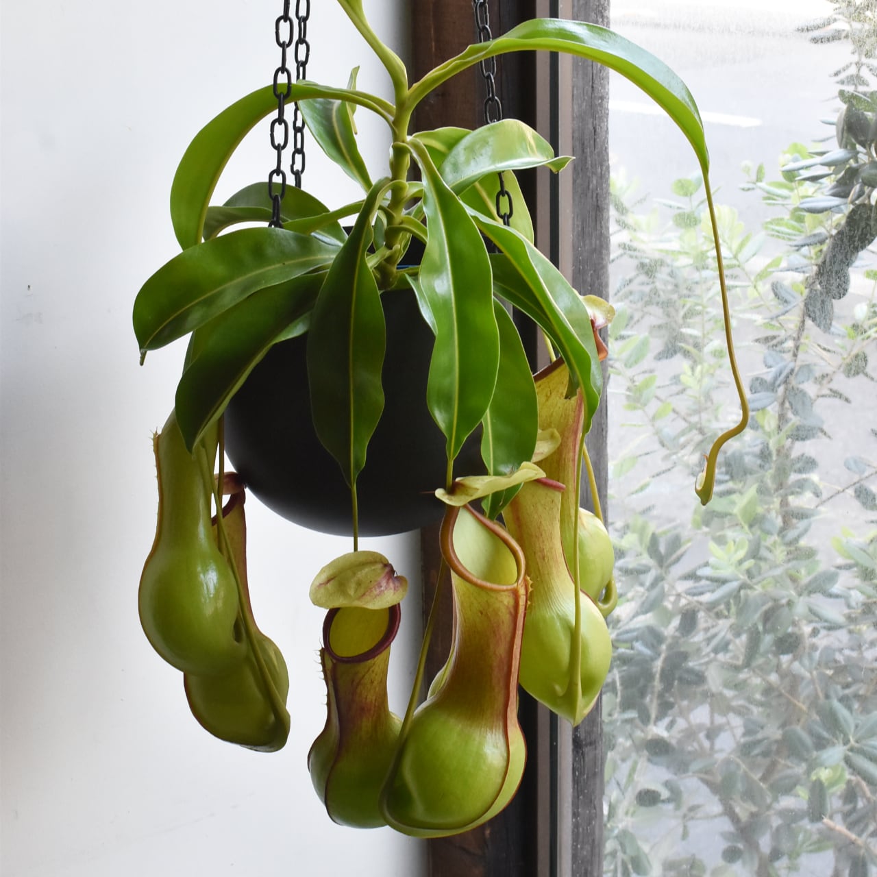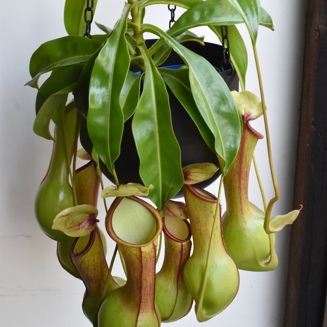 通常のアラータは赤い捕虫袋ですが、こちらは大きく膨れたヒップの部分がフレッシュグリーンでなんとも妖艶な姿です。袋のサイズも20cmほどあり迫力満点。プラスティック製培養鉢に植えた植物と金属製吊り鉢とのセット販売です。捕虫袋内の消化液は全て出した状態での発送となります。