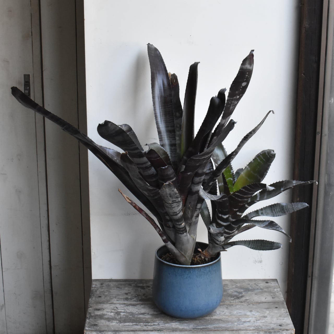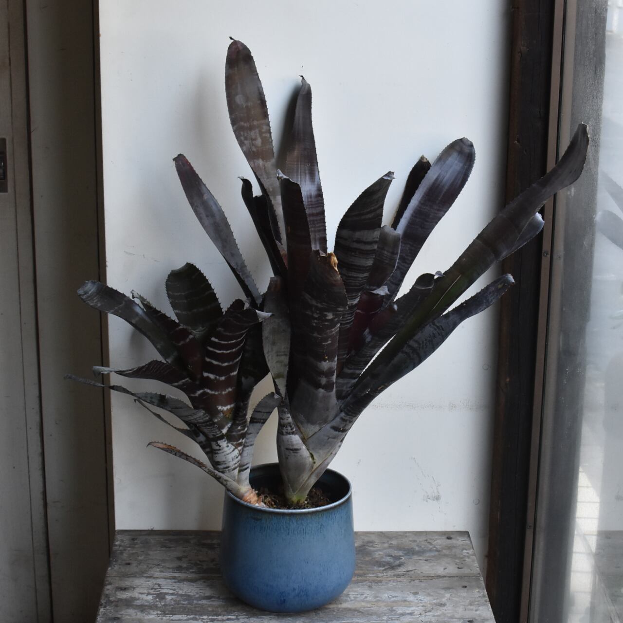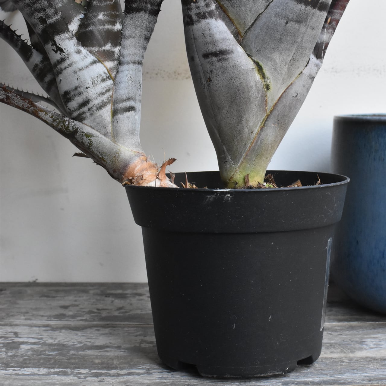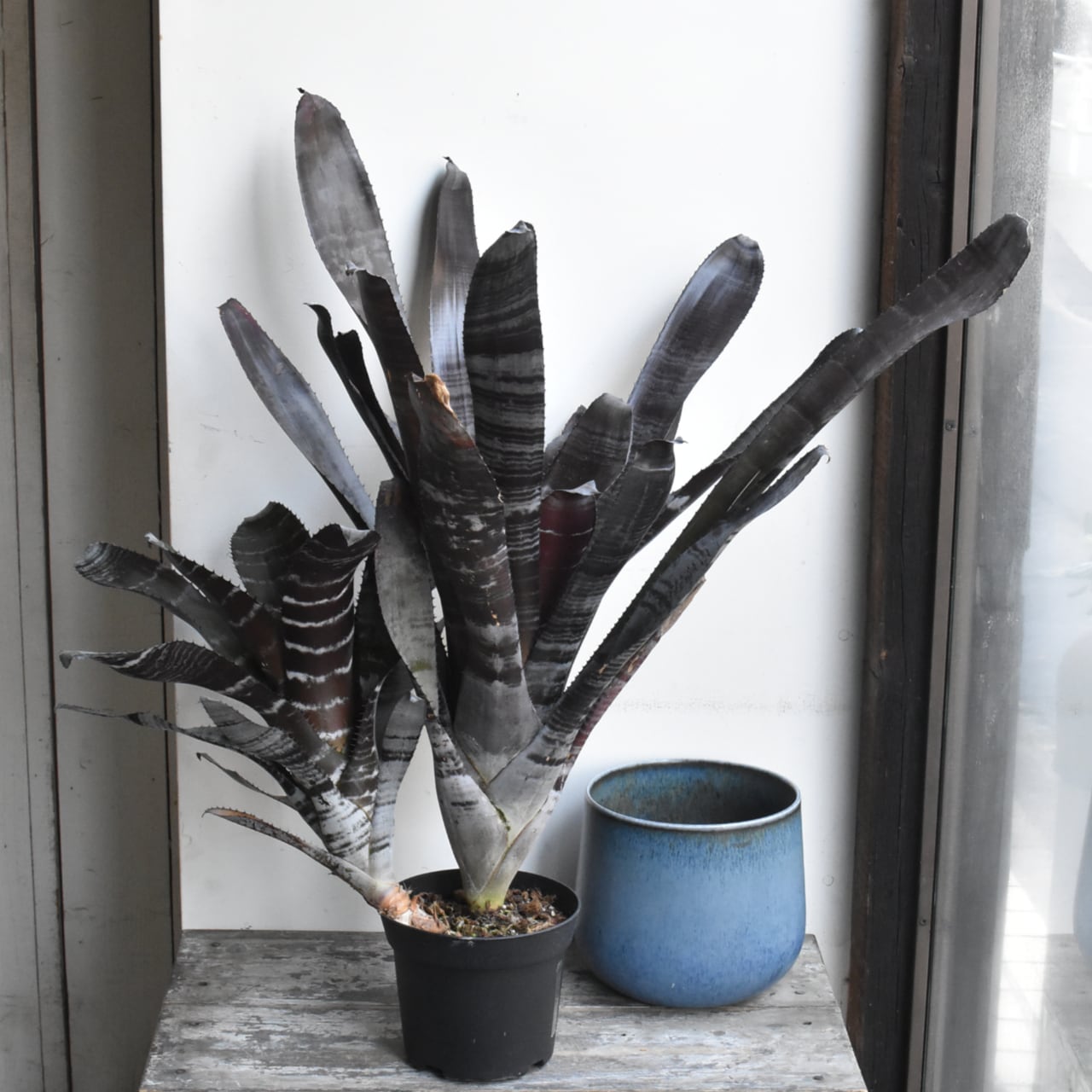 黒いエクメアです。白い粉を吹いたような縞模様とのコントラストがシックで、広がりすぎない草姿も魅力。なかなかお目にかかれない希少種です。黒いプラスティック製培養鉢での販売です。青い鉢カバーは参考品で、販売物ではありません。