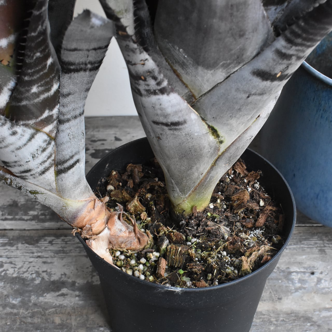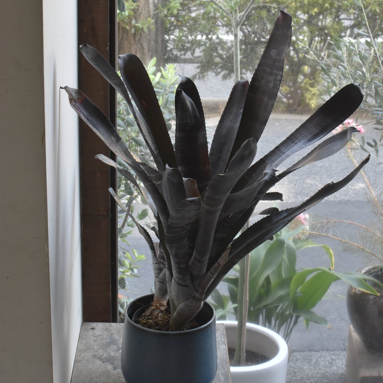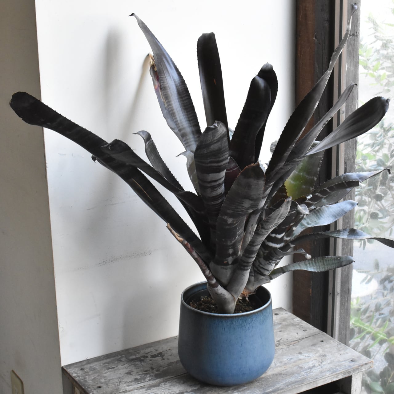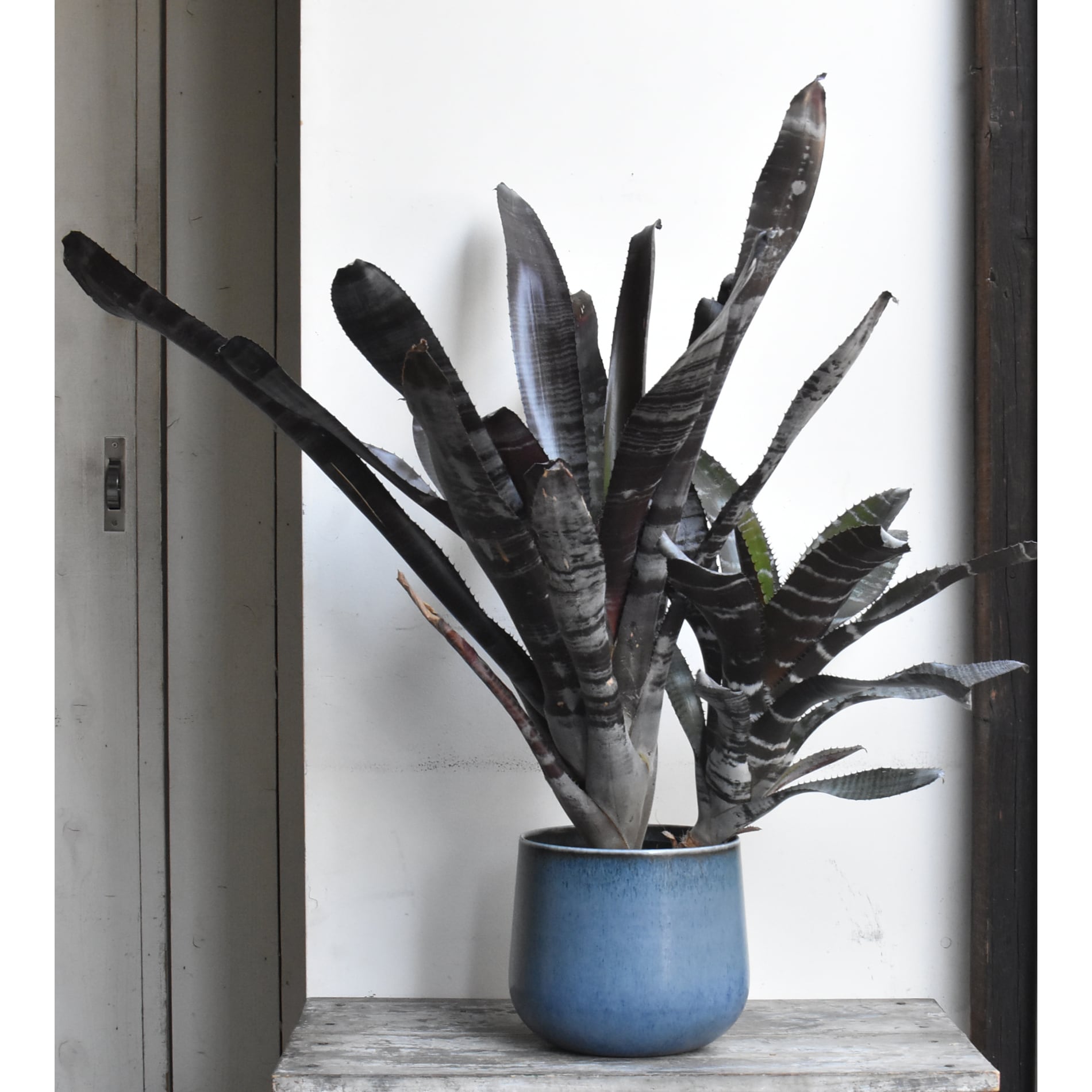 黒いエクメアです。白い粉を吹いたような縞模様とのコントラストがシックで、広がりすぎない草姿も魅力。なかなかお目にかかれない希少種です。黒いプラスティック製培養鉢での販売です。青い鉢カバーは参考品で、販売物ではありません。