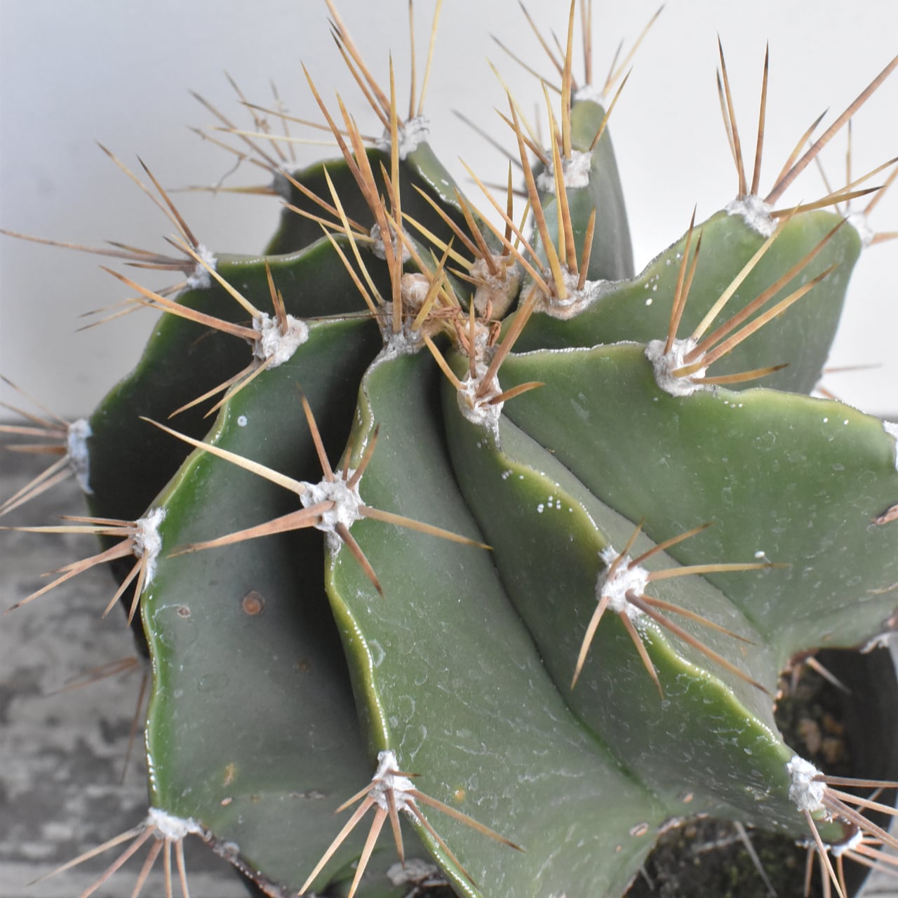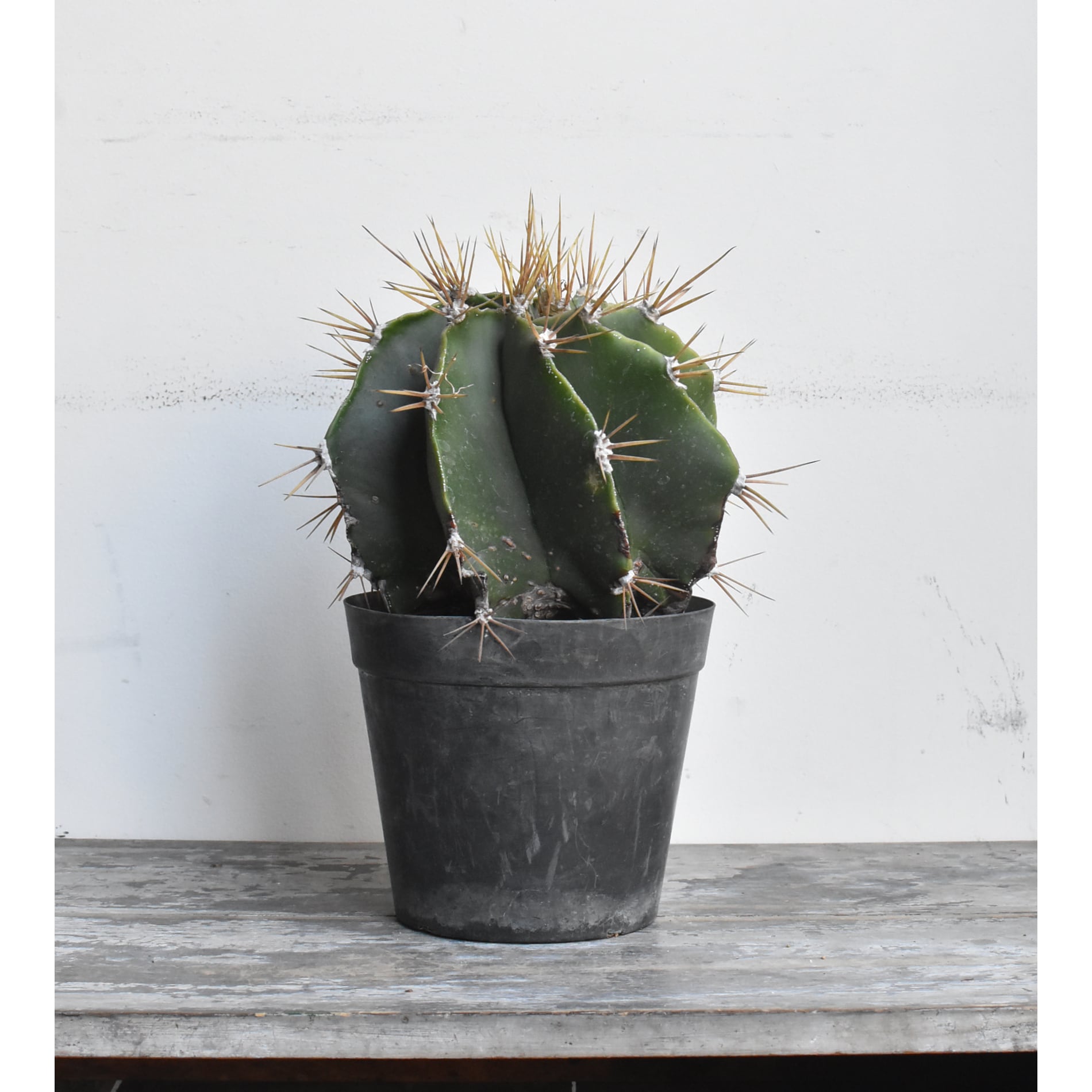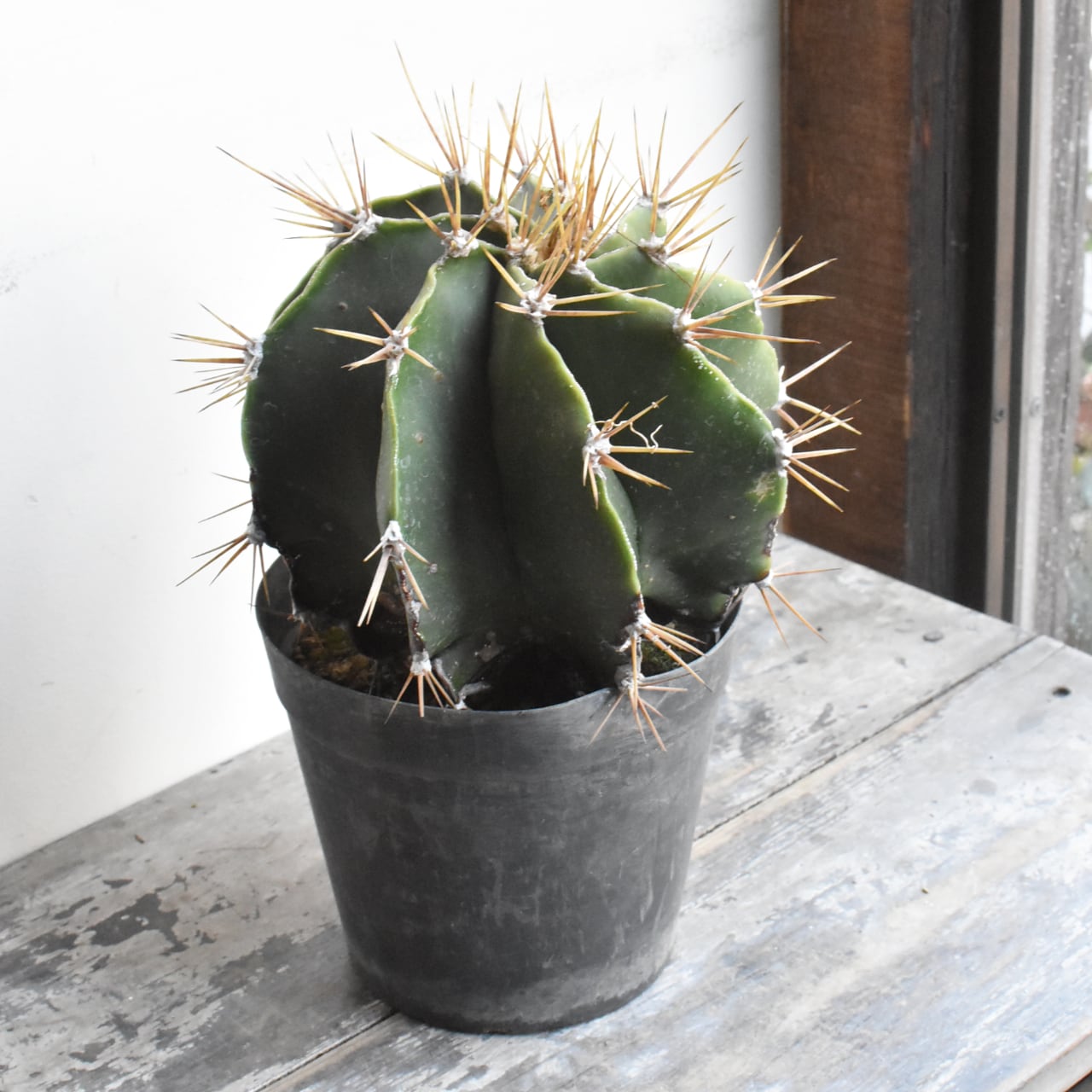 アストロフィツム属は棘のないランポー玉などが有名ですが、こちらは鋭く長いトゲのあるサボテンらしい姿をしています。般若の名で販売されるものは、肌に星のように散らばる白い点々模様の広がるタイプがほとんどですが、こちらは無地の青般若と言われる品種です。模様がないので、トゲや全体のフォルムに目がいき、より生命力を感じられます。