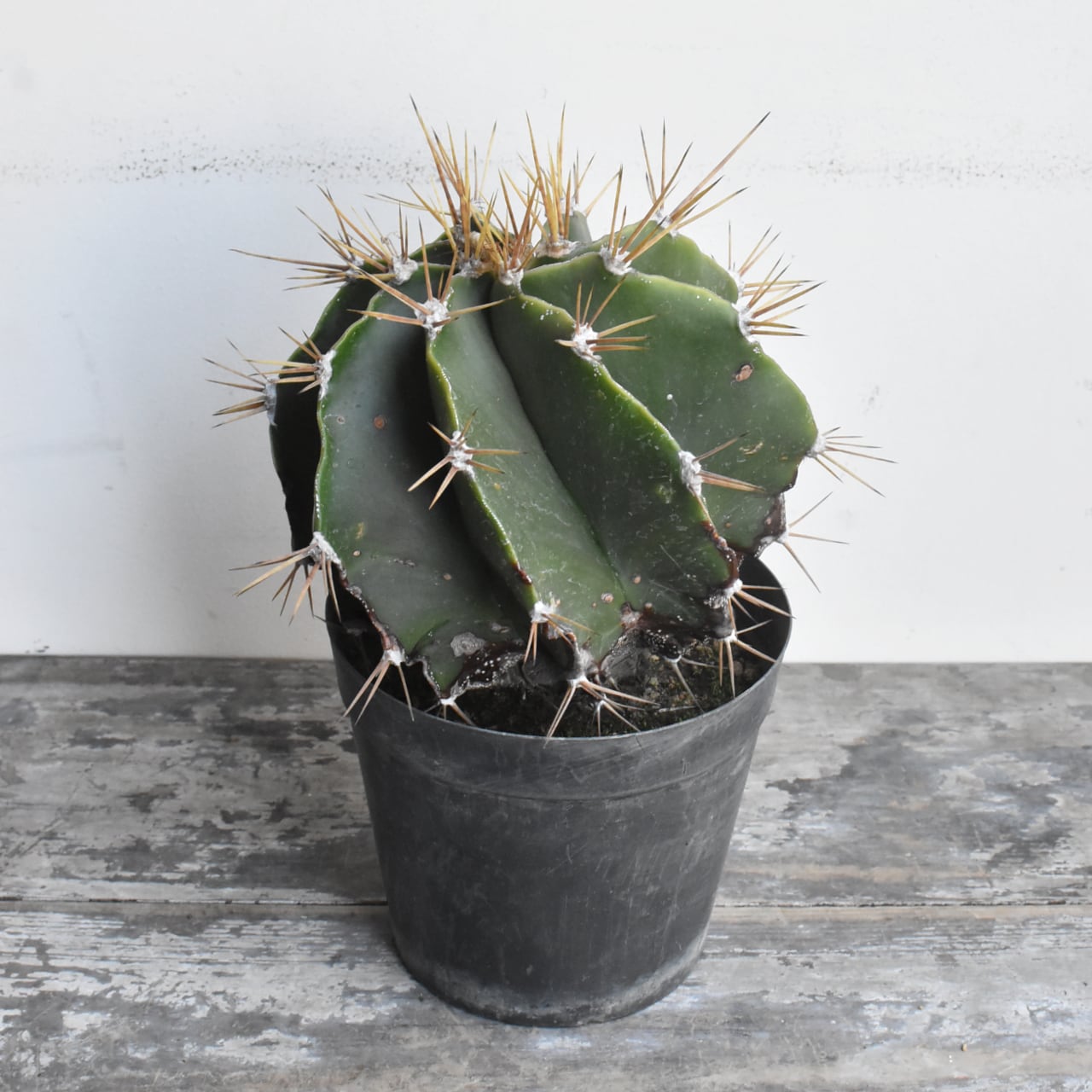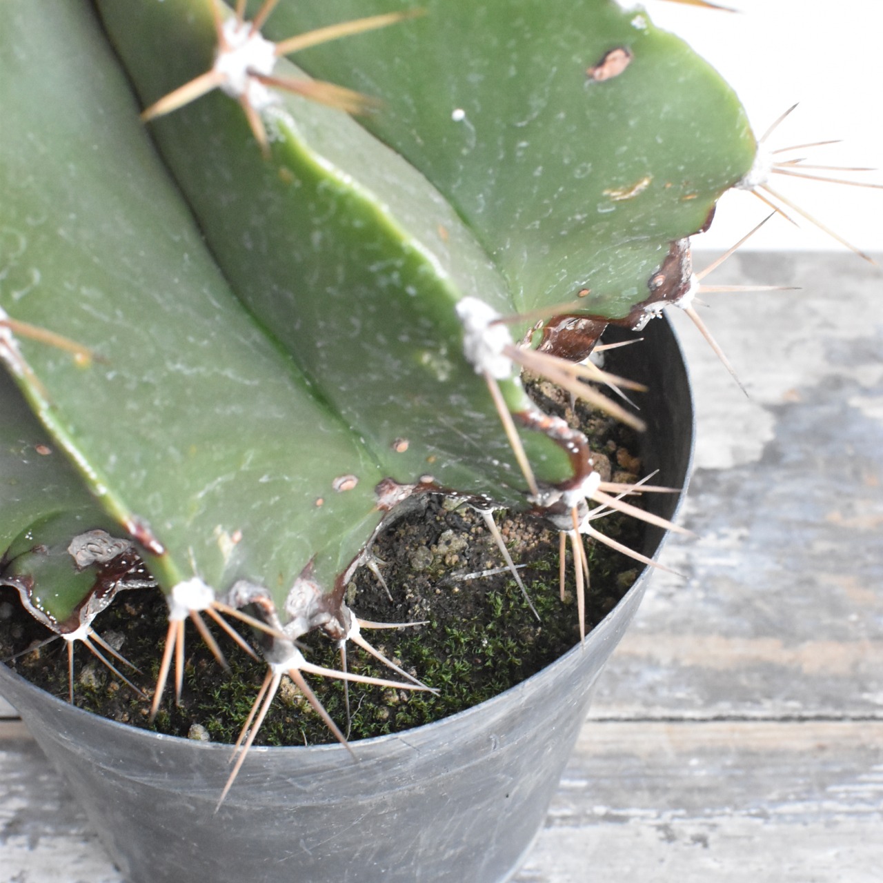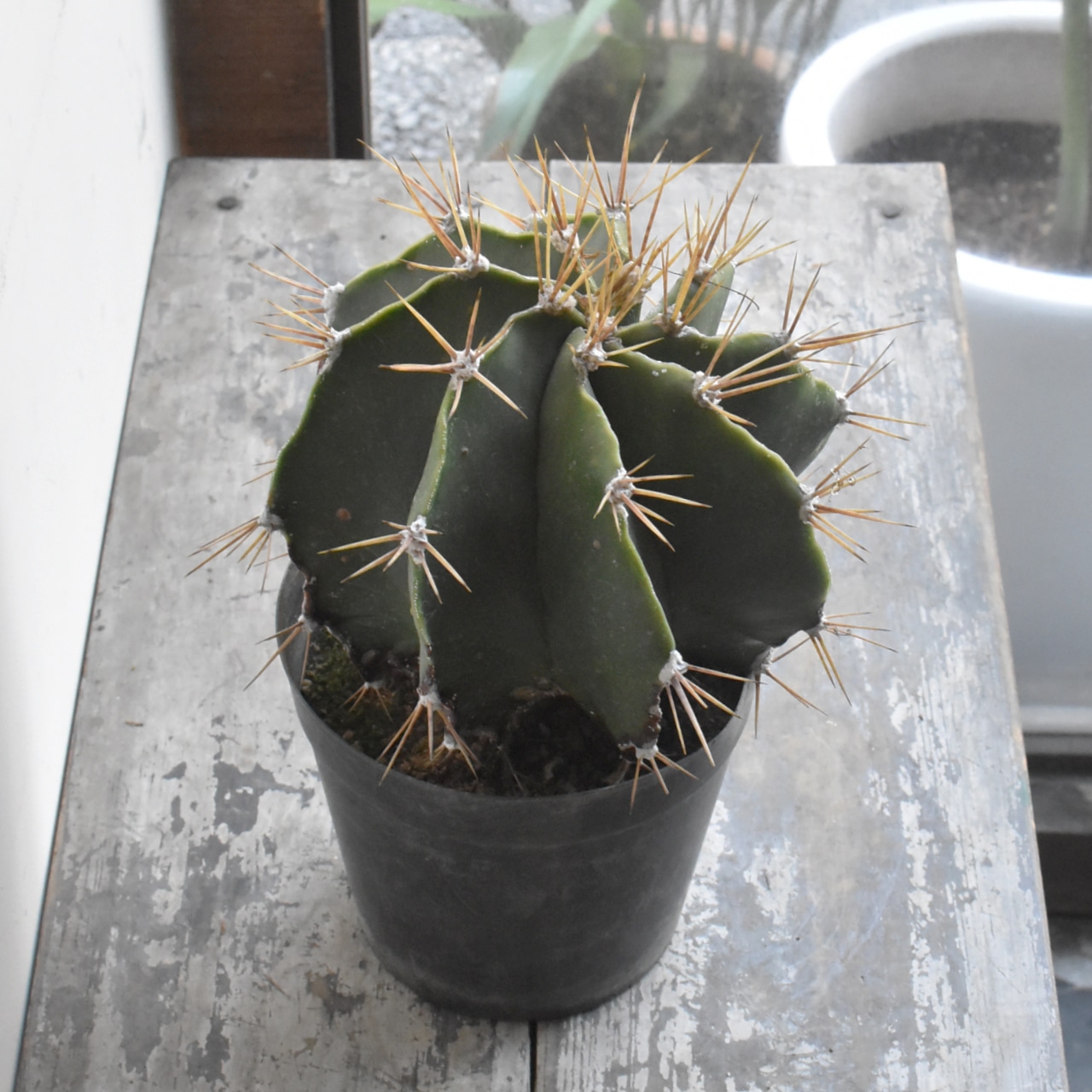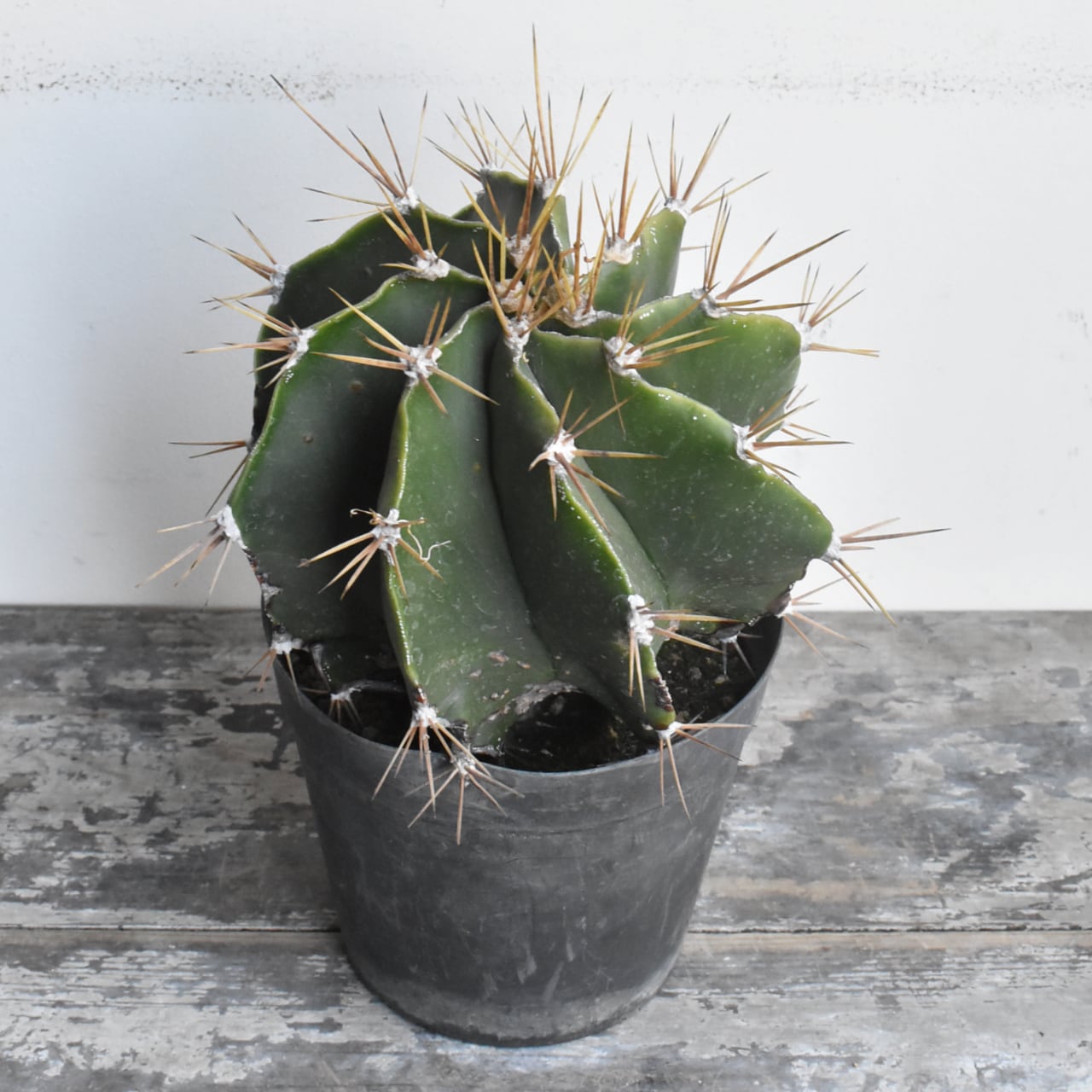 アストロフィツム属は棘のないランポー玉などが有名ですが、こちらは鋭く長いトゲのあるサボテンらしい姿をしています。般若の名で販売されるものは、肌に星のように散らばる白い点々模様の広がるタイプがほとんどですが、こちらは無地の青般若と言われる品種です。模様がないので、トゲや全体のフォルムに目がいき、より生命力を感じられます。