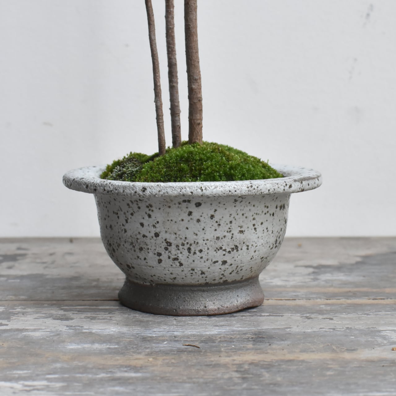 黒松を「男松」と呼ぶのに対し、赤松は「女松」と呼ばれ、柔らかな葉が魅力の品種です。小さな小さな鉢で生長の勢いを削がれながら育てられた株で、「やつれ」の姿を楽しむ一鉢。痩せた土地でなんとか生き延びようとする姿の再現です。シンプルでモダンなお部屋に映える一鉢です。