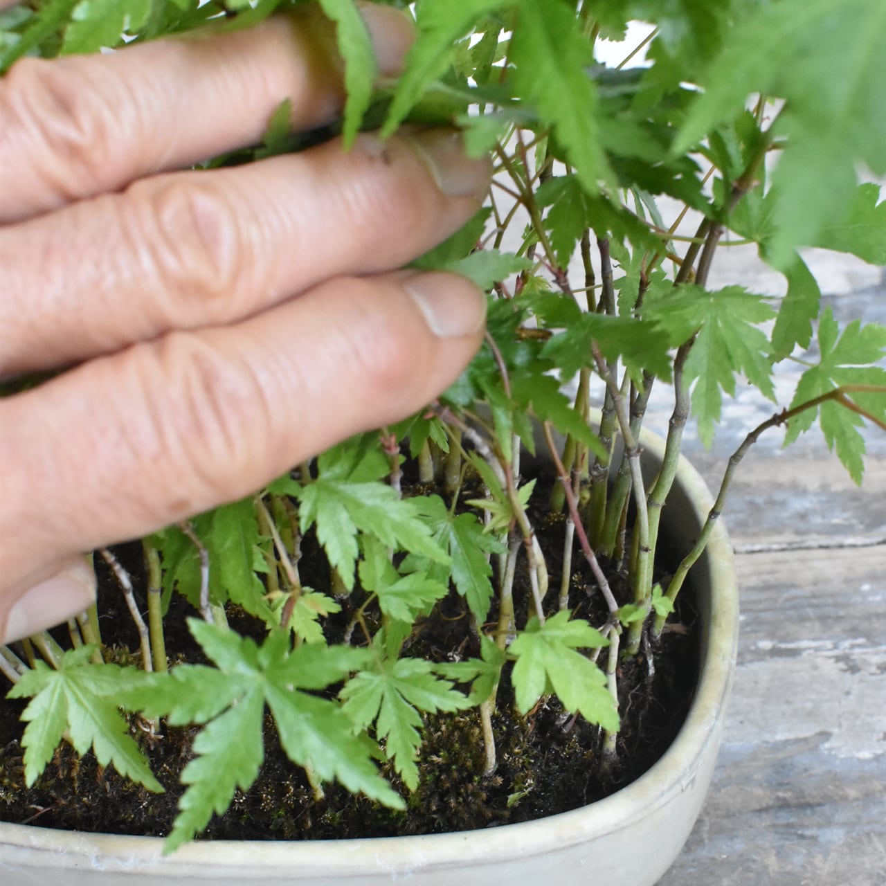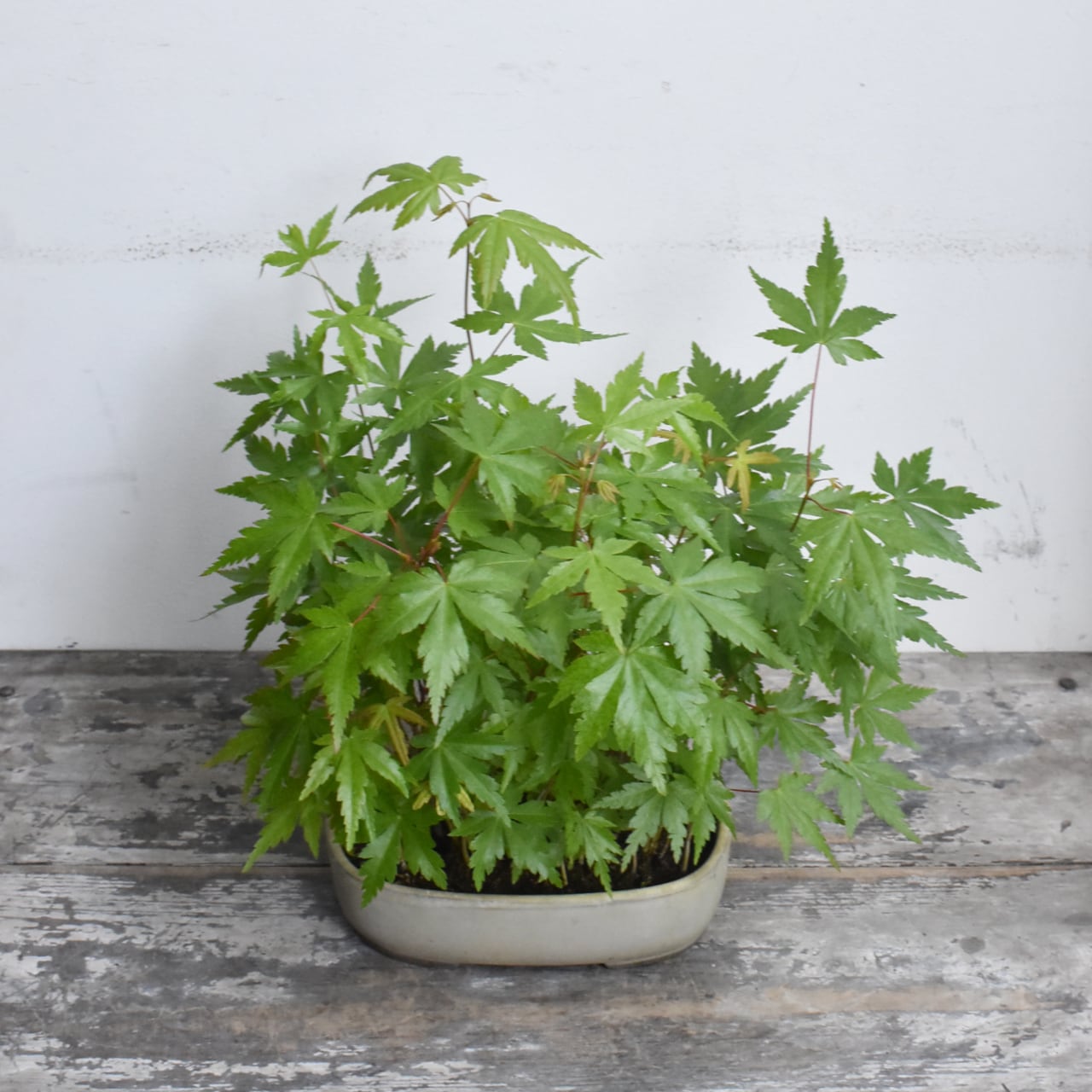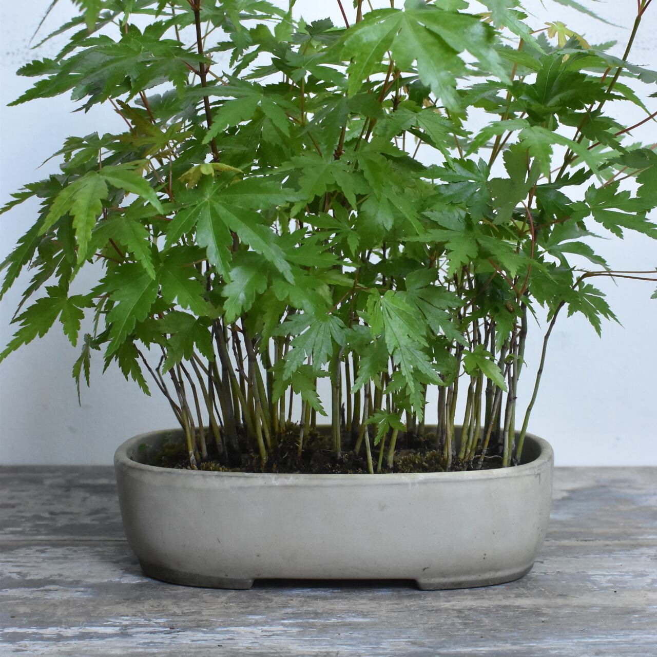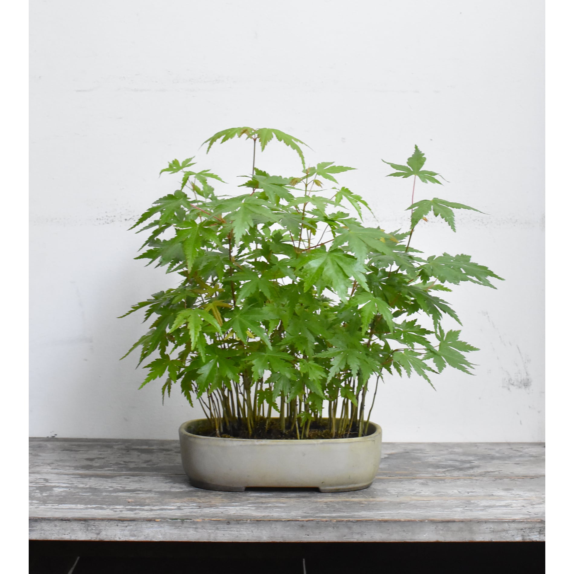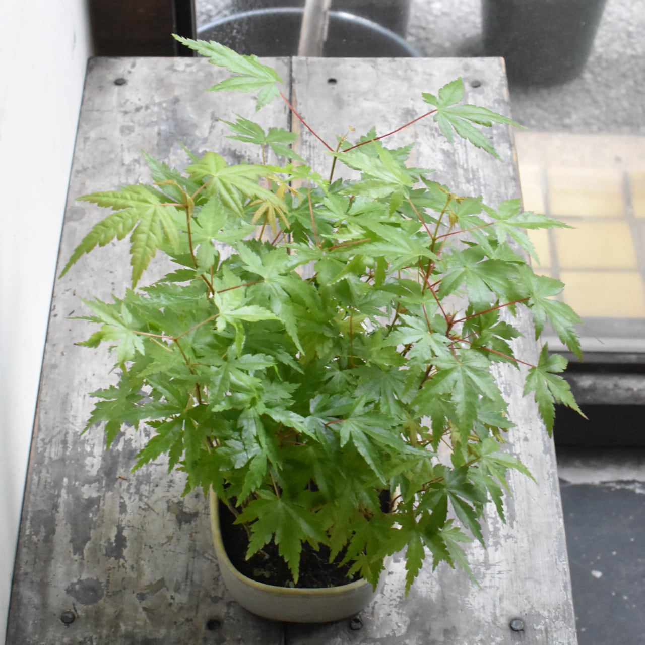 林の中にいるかのようです。しっとりと雨に濡れる新緑のモミジの瑞々しさは、見る者の目に優しく吸い込まれるかの様です。ここから徐々に夏葉、秋の紅葉、冬の枯れ姿と季節の移り変わりをドラマティックに魅せてくれます。敏感な植物と共に過ごし、四季の移ろいを身近でお楽しみください。