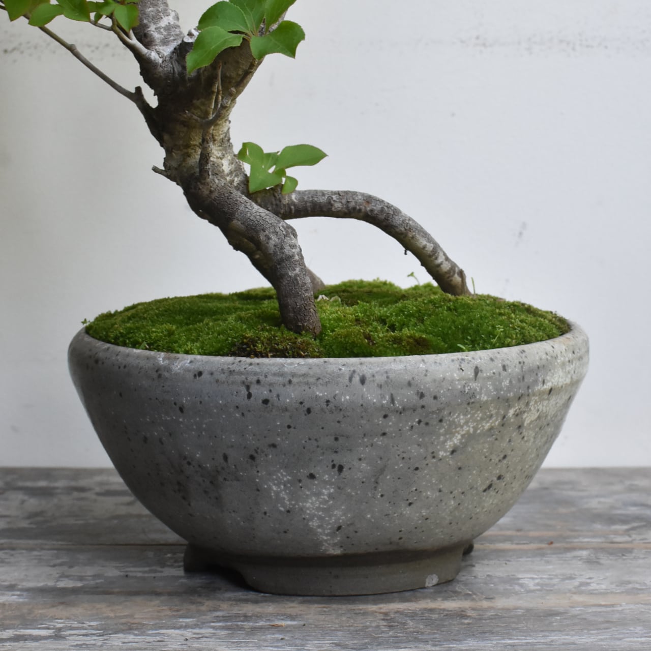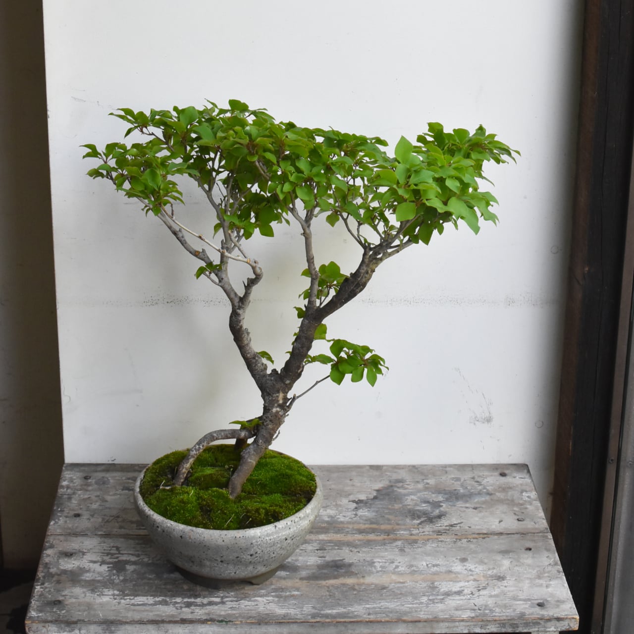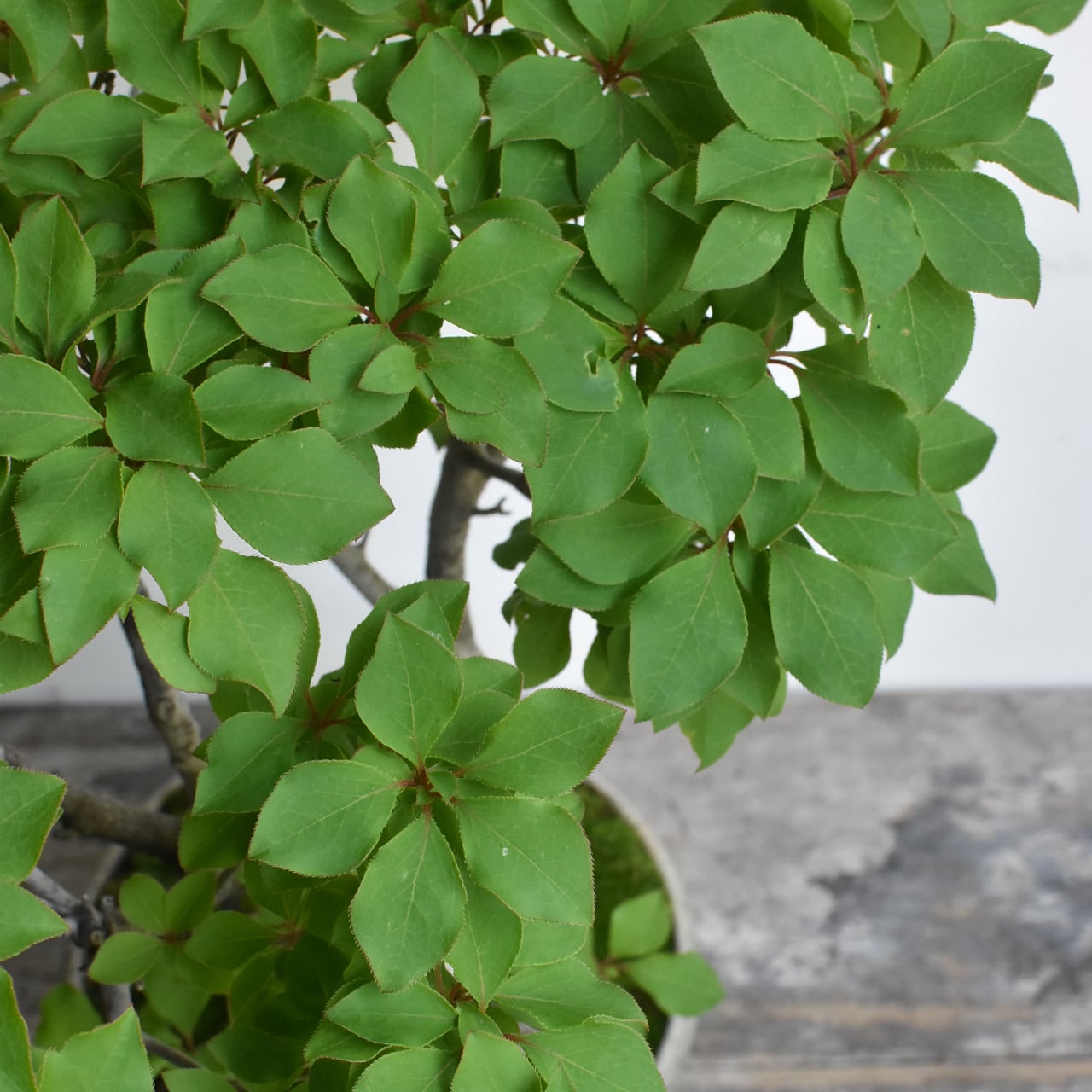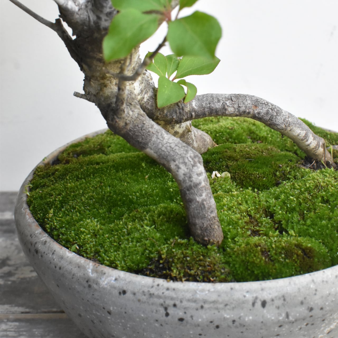 ドウダンツツジの矮性種(コンパクトタイプ)です。まるで幹のように見えますが、根上がりに仕立ててある株です。スズランのような姿の春の白い花、緋赤に染まる秋の紅葉、っと一年を通して楽しめます。庭植えにされて刈り込まれた姿では楽しめない、間近で観る盆栽ならでは美しさと楽しみがある一鉢です。