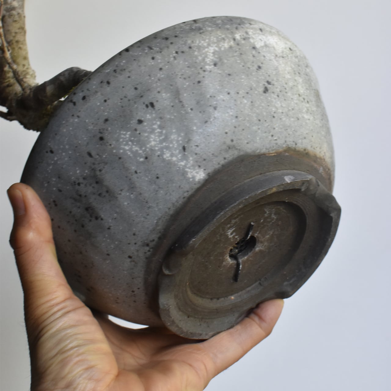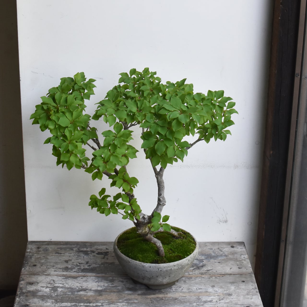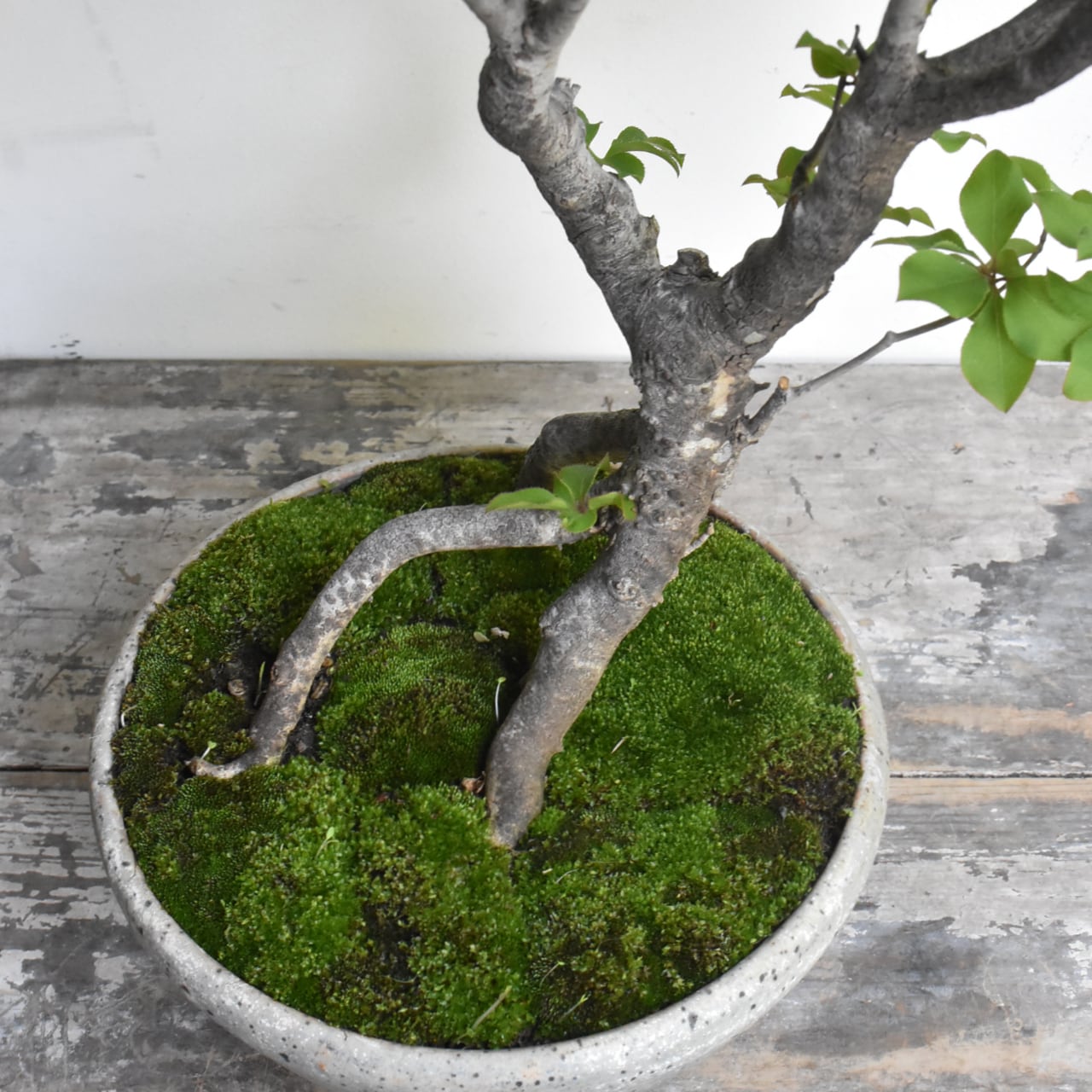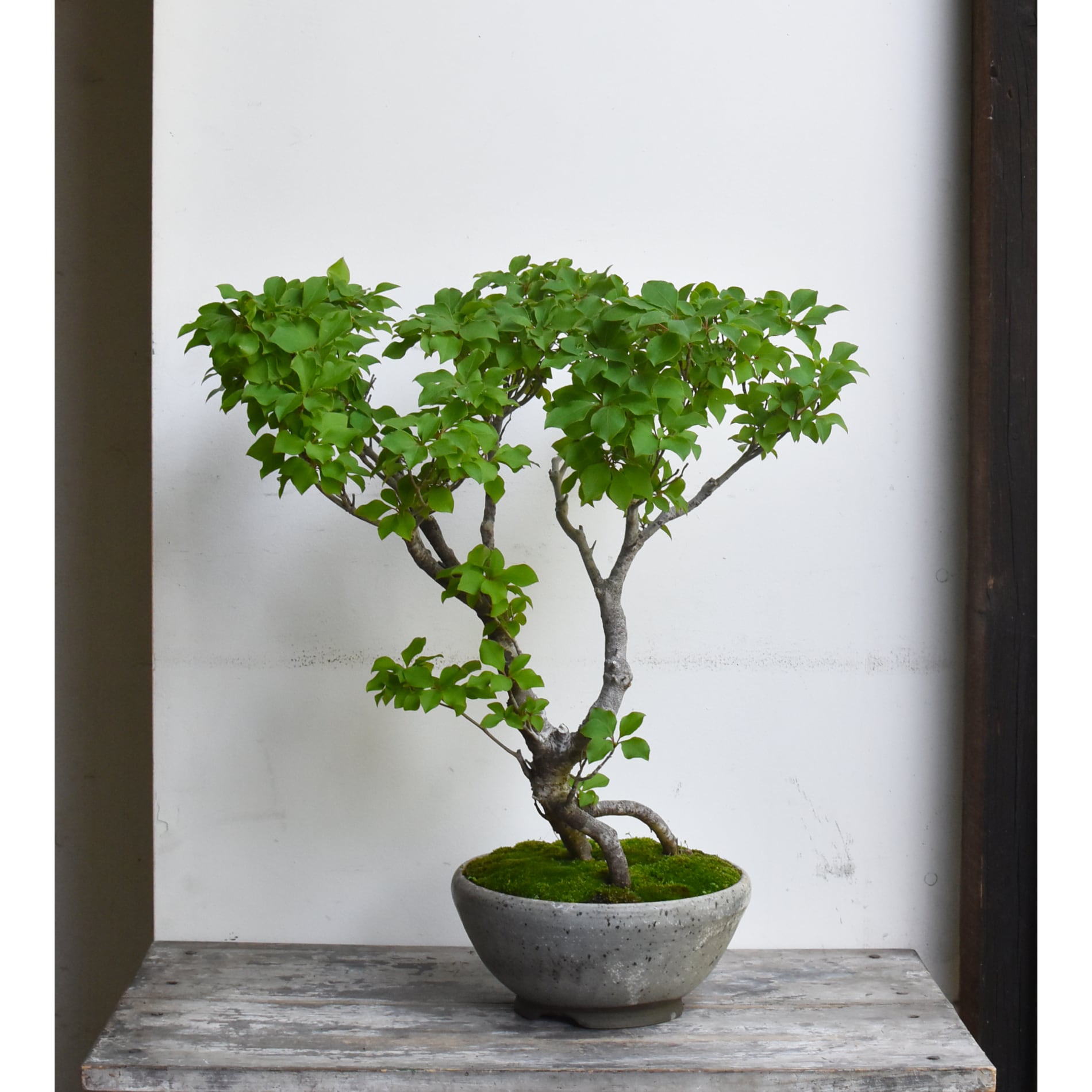 ドウダンツツジの矮性種(コンパクトタイプ)です。まるで幹のように見えますが、根上がりに仕立ててある株です。スズランのような姿の春の白い花、緋赤に染まる秋の紅葉、っと一年を通して楽しめます。庭植えにされて刈り込まれた姿では楽しめない、間近で観る盆栽ならでは美しさと楽しみがある一鉢です。