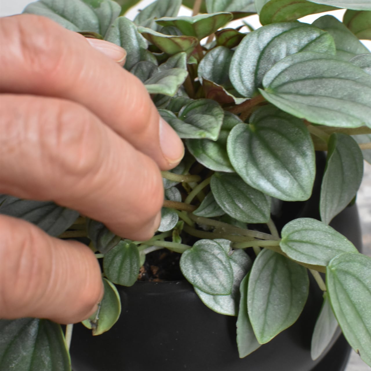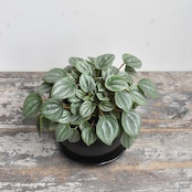 メタリックなシルバーリーフが美しい品種です。ペペロミアならではの凹凸感が、くっきりとした葉脈のおかげでより強調されています。シンプルな丸鉢に納めることで洗練された印象に。