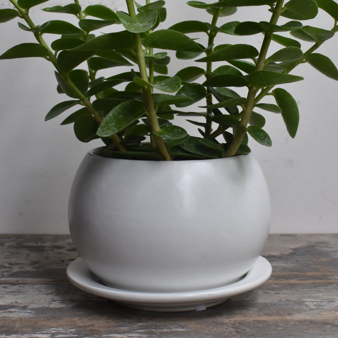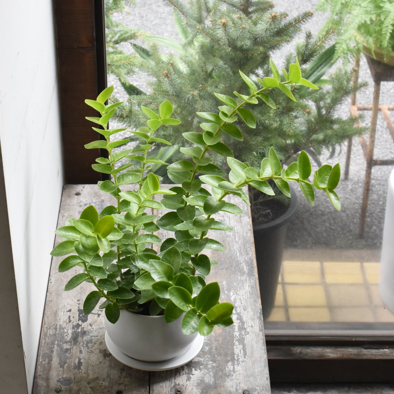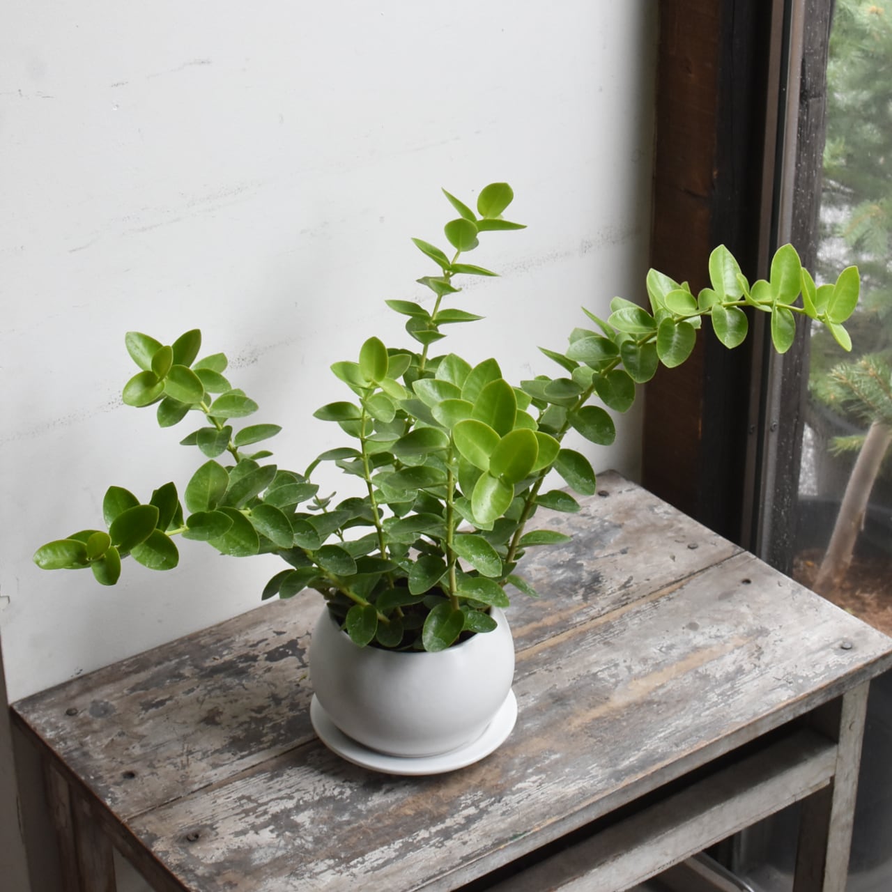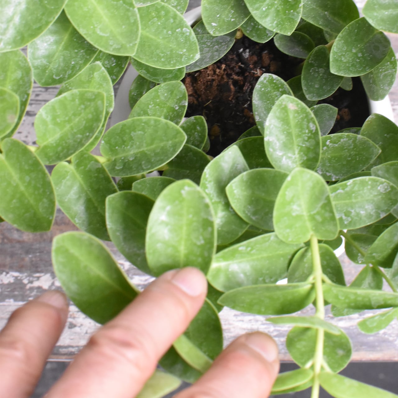 なめらかで光沢のある葉っぱが美しいホヤの一種です。切り詰めてコンパクトな草姿を維持するのも良いですが、ツルを伸ばして垂れるような仕立てにするのもオススメです。星のようなユニークな形の花も楽しみのひとつ。たっぷり日に当てることで延びたツルの葉腋から花を咲かせます。